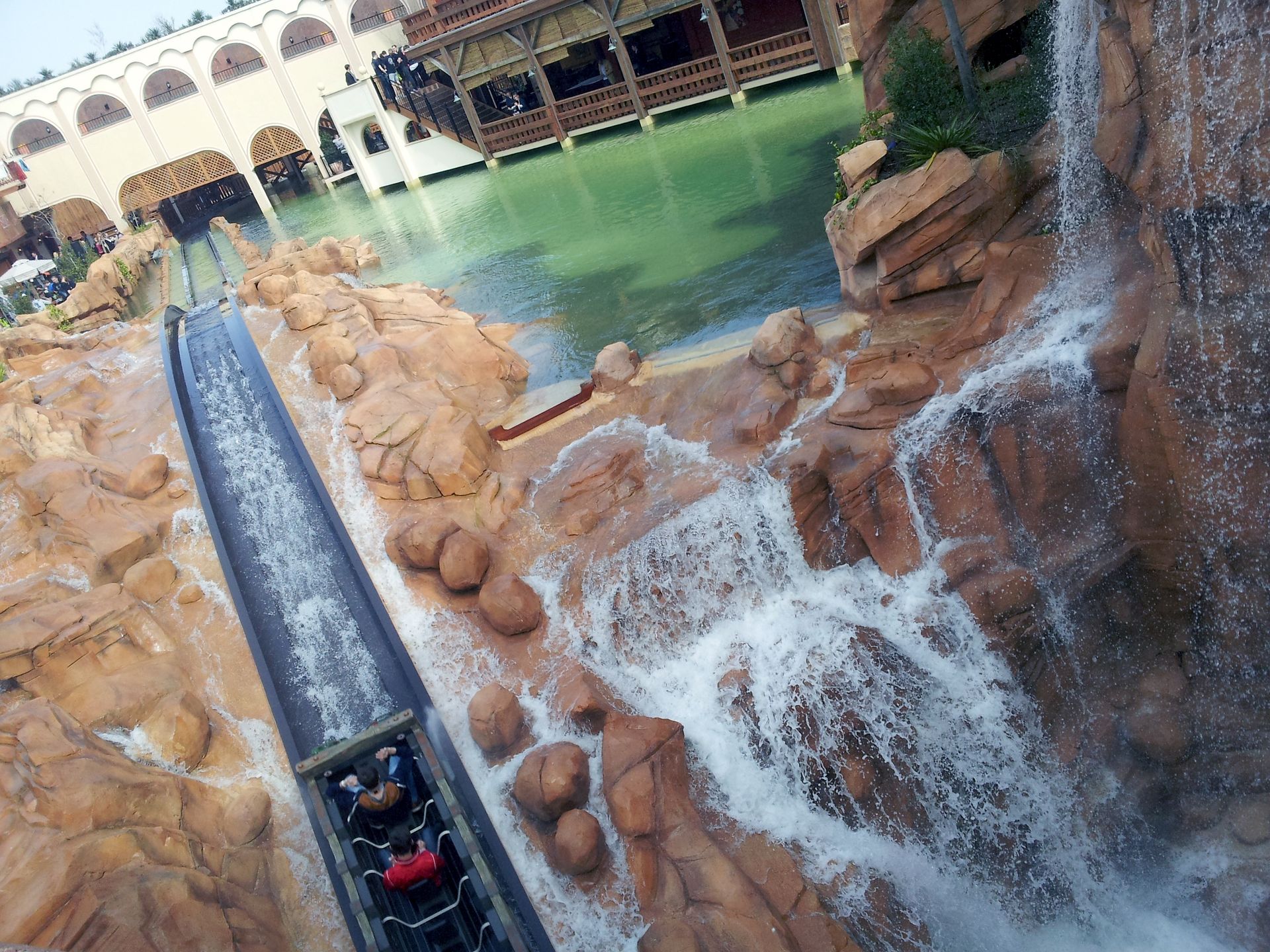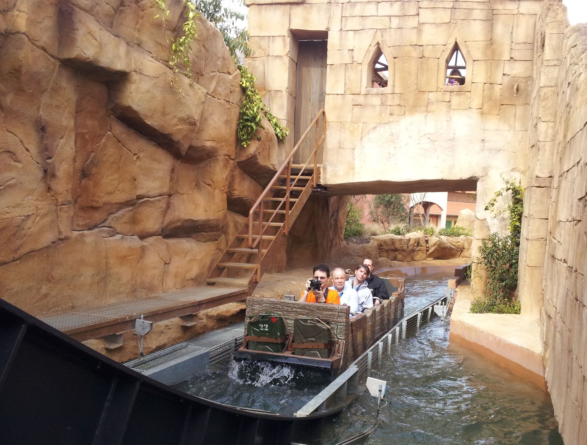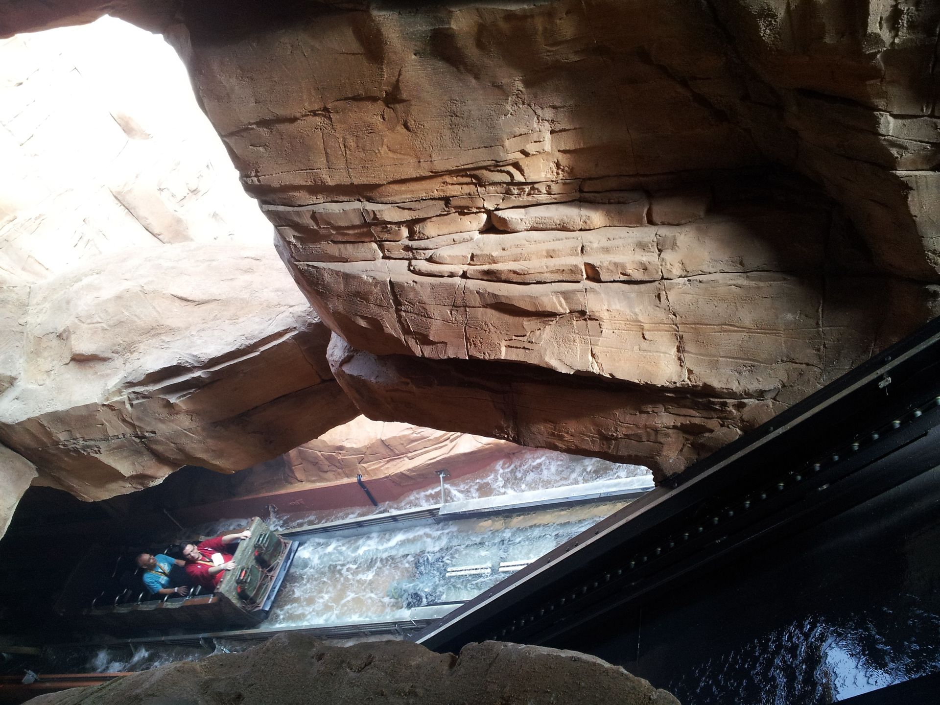 Am Ende der Station wird das Boot schließlich regelrecht in den Kanal gelauncht. Die erste Kurve führt von einem Holzdach geschützt unter Colorado Adventure zum ersten Lift. Das ist der einzige Teil, der mir von der Gestaltung (noch?) nicht so ganz zusagt, aber dennoch besser als so manch andere Wasserbahn. Die Lifte sind erstaunlich schnell und abgesehen vom Übergang des Schwimmens auf die Reibräder auch völlig ruckelfrei. Nach einer kurzen Geraden (auf der auch mal eine kleine Welle vorne ins Boot schwappen kann!) geht es in die erste "Höhle", und in einer weit ausholenden Rechtskurve zum ersten Drop. An diesen schließt sich auch gleich die Drehweiche an. Nebel schießt aus der Wand, und schon geht es rückwärts weiter.