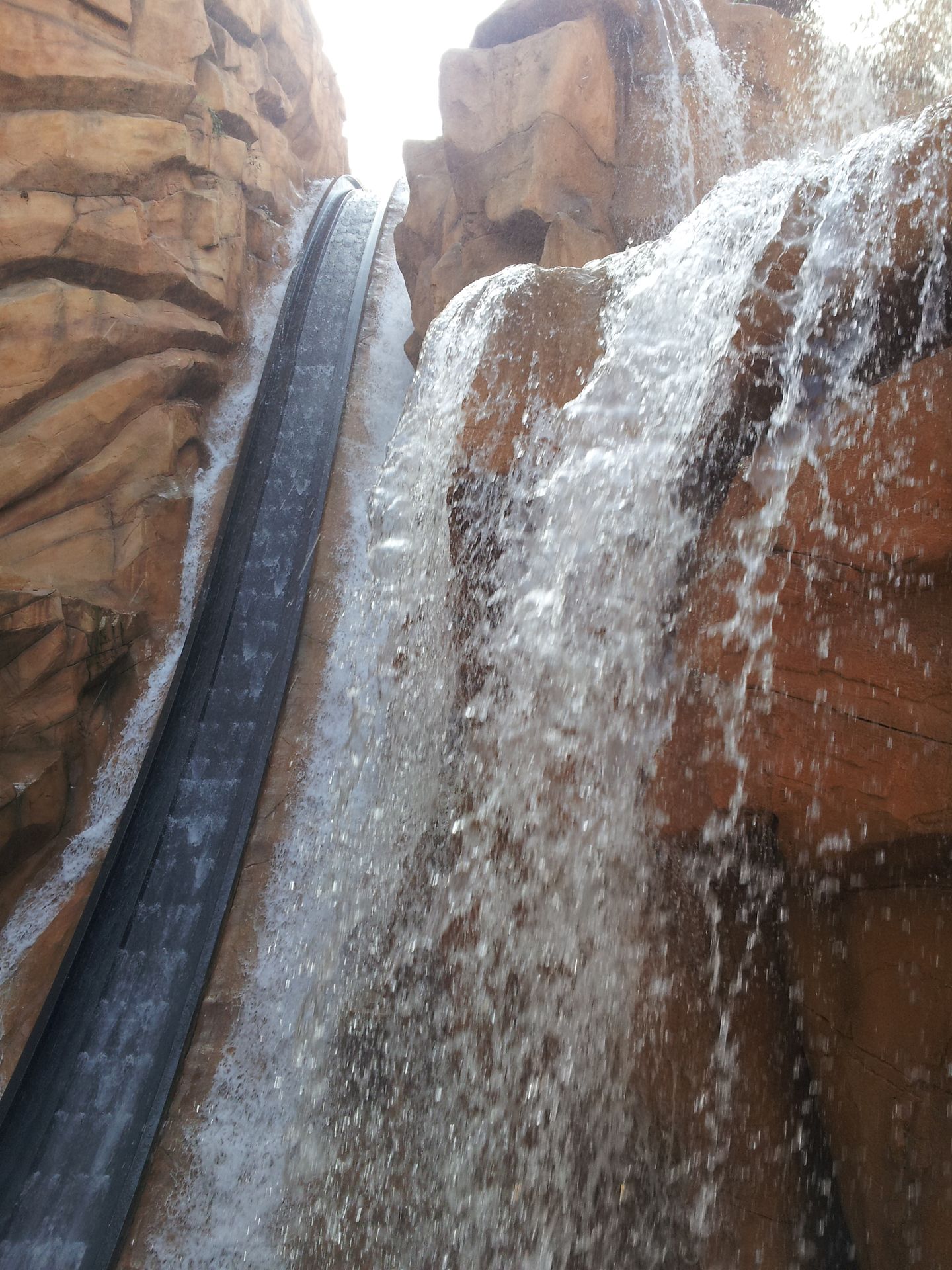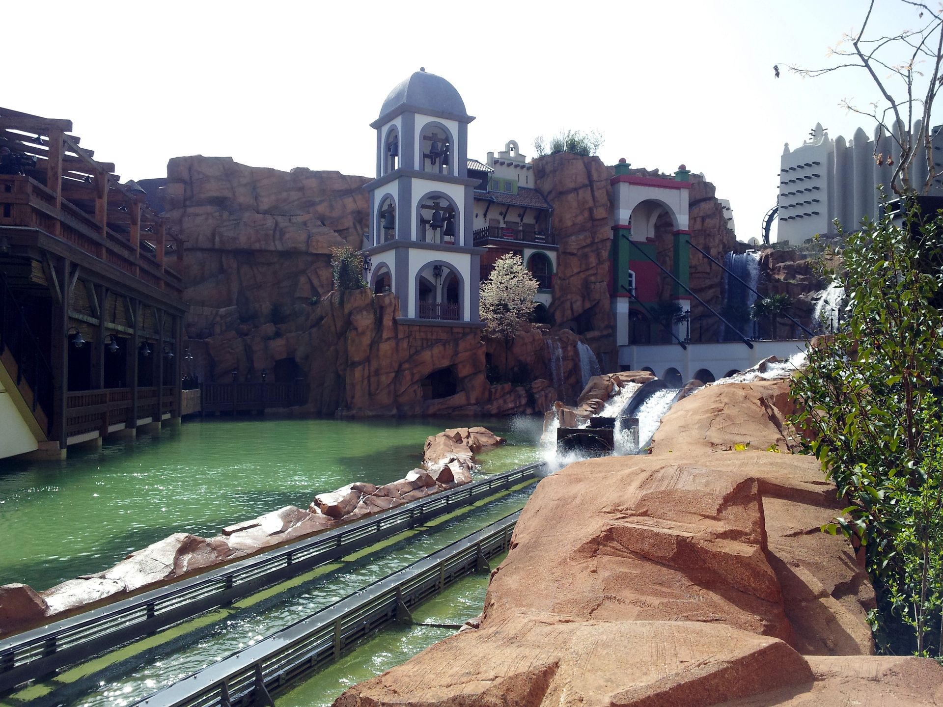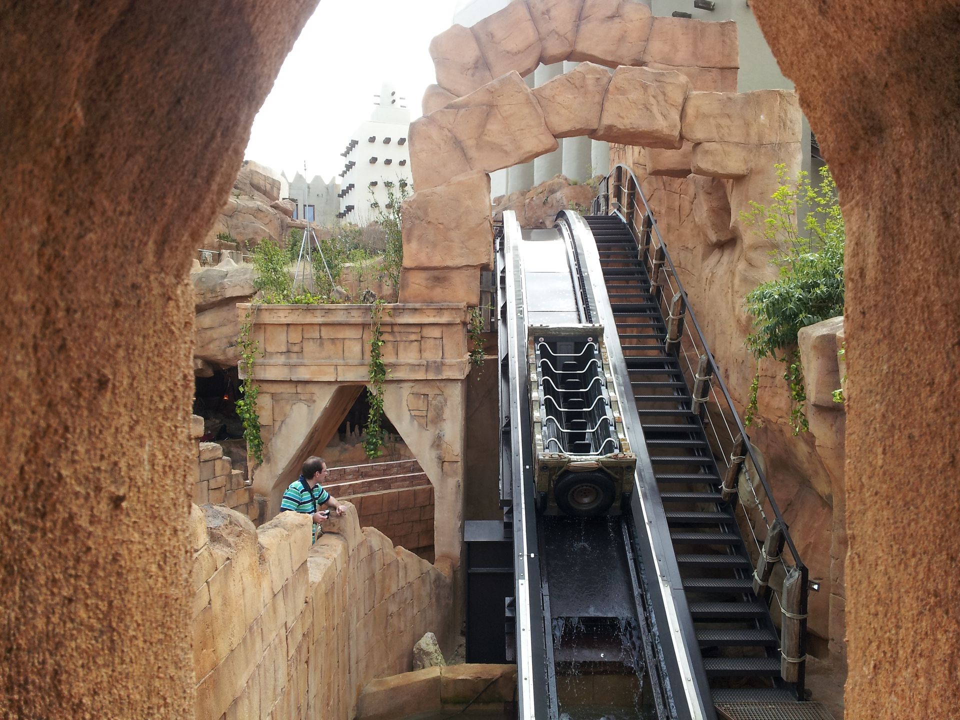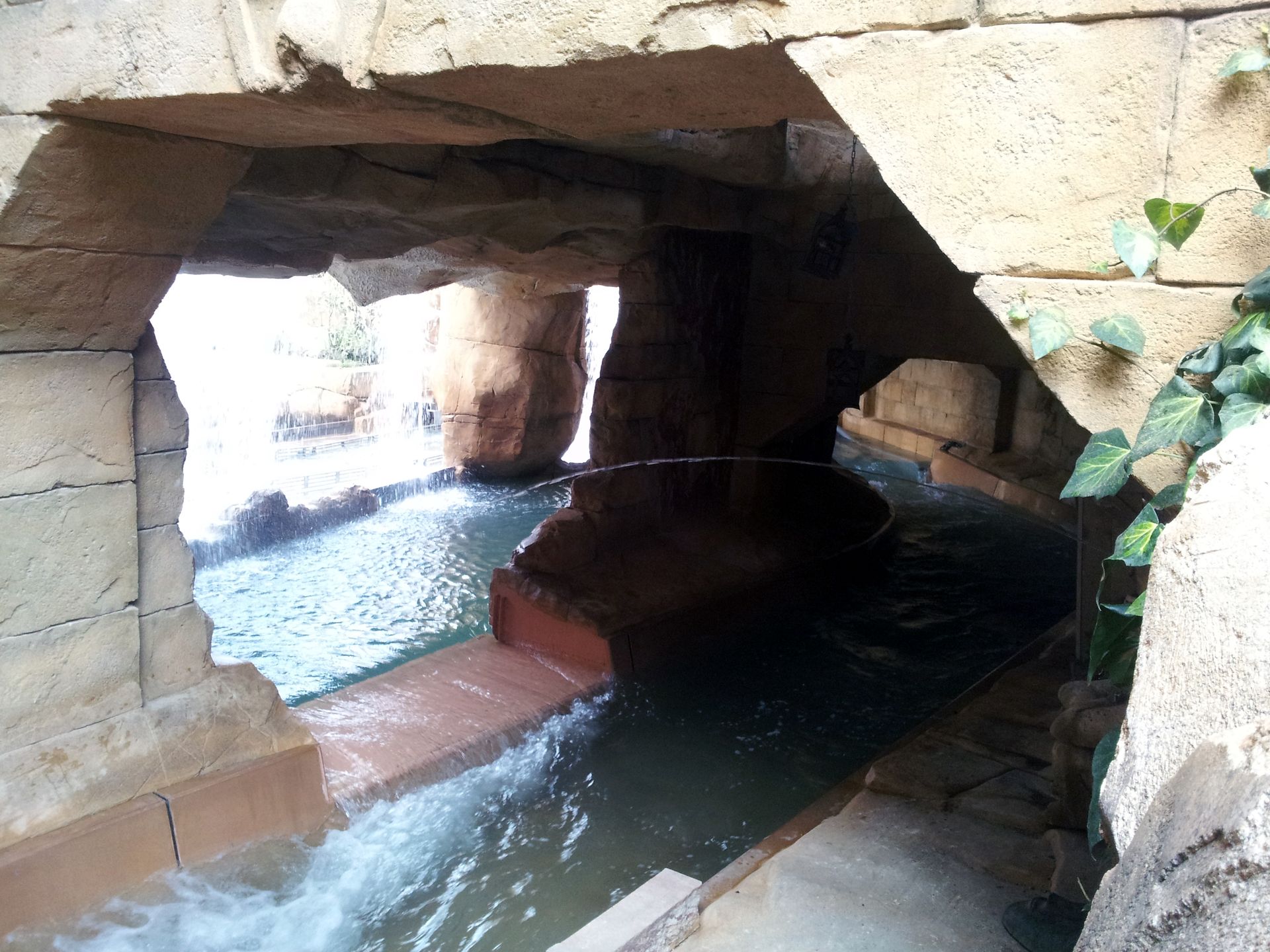 Am Ende der Station wird das Boot schließlich regelrecht in den Kanal gelauncht. Die erste Kurve führt von einem Holzdach geschützt unter Colorado Adventure zum ersten Lift. Das ist der einzige Teil, der mir von der Gestaltung (noch?) nicht so ganz zusagt, aber dennoch besser als so manch andere Wasserbahn. Die Lifte sind erstaunlich schnell und abgesehen vom Übergang des Schwimmens auf die Reibräder auch völlig ruckelfrei. Nach einer kurzen Geraden (auf der auch mal eine kleine Welle vorne ins Boot schwappen kann!) geht es in die erste "Höhle", und in einer weit ausholenden Rechtskurve zum ersten Drop. An diesen schließt sich auch gleich die Drehweiche an. Nebel schießt aus der Wand, und schon geht es rückwärts weiter.