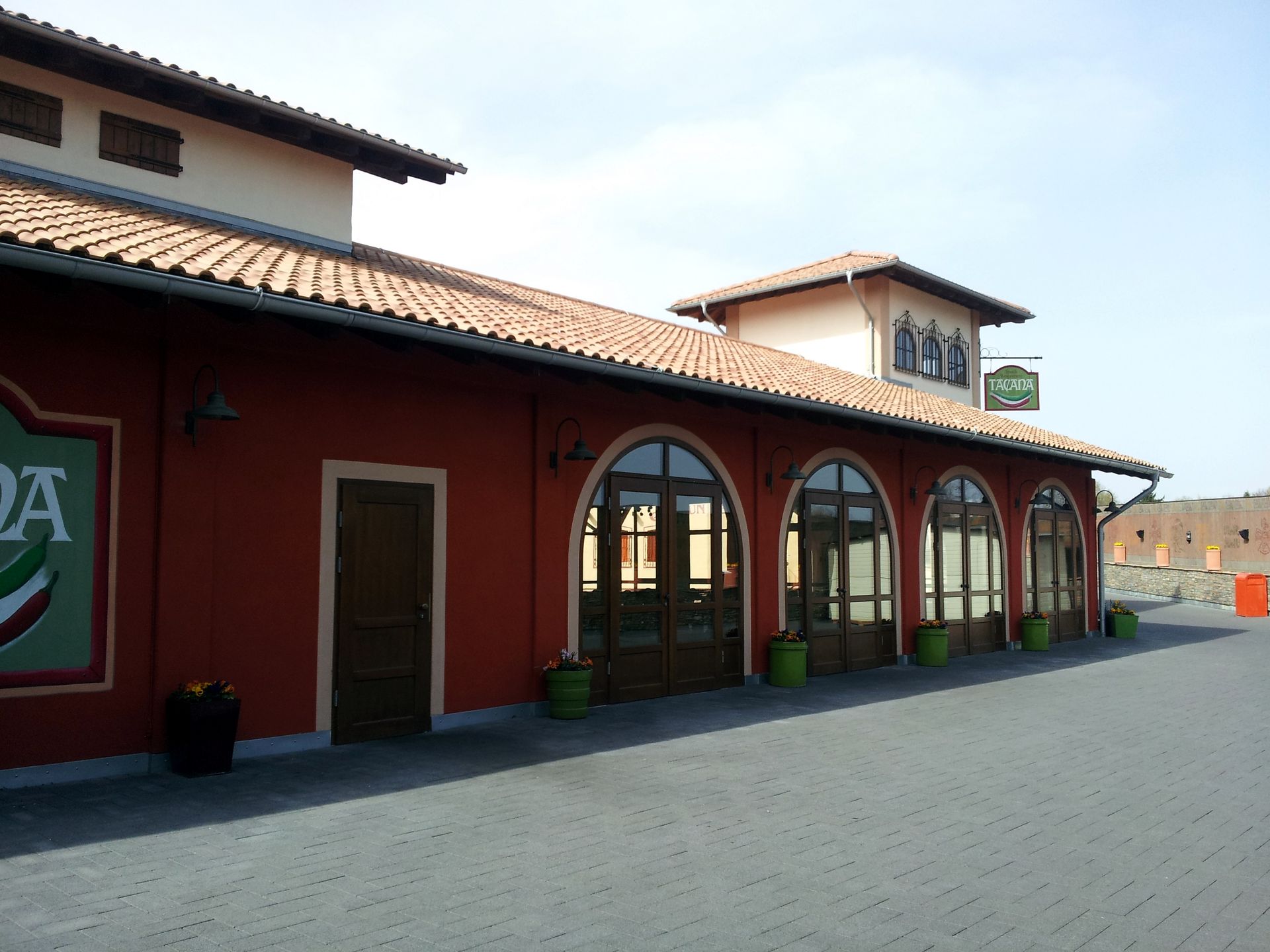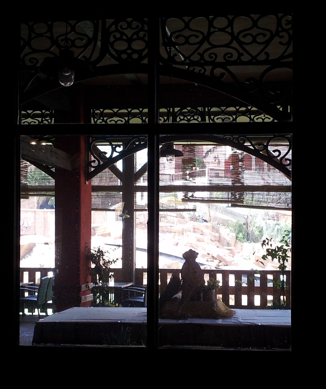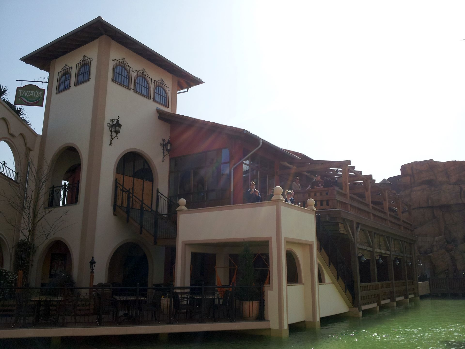 Auf der anderen Seite gewähren Fenster den Blick auf die untere Terrasse des Restaurants Tacana.