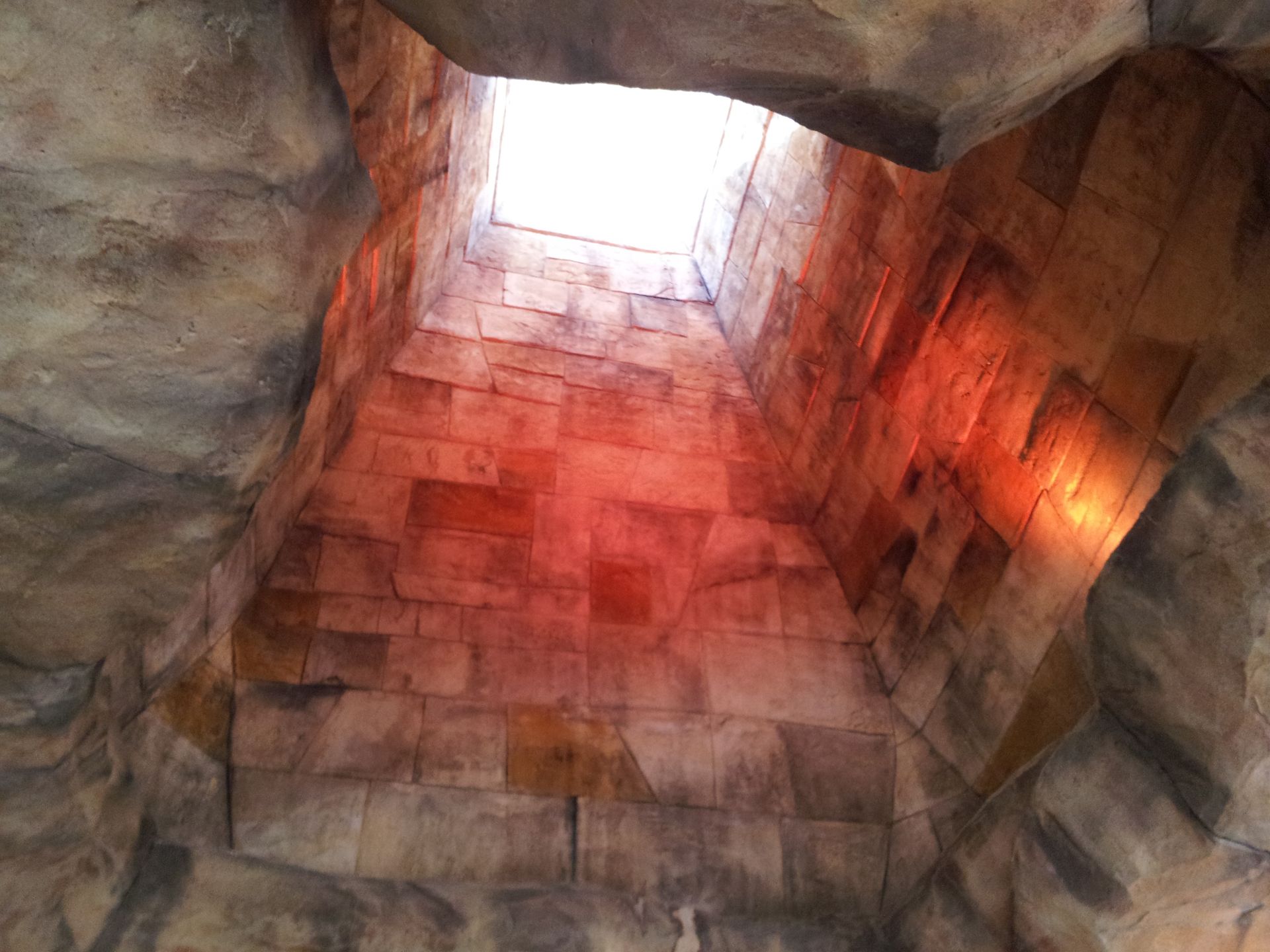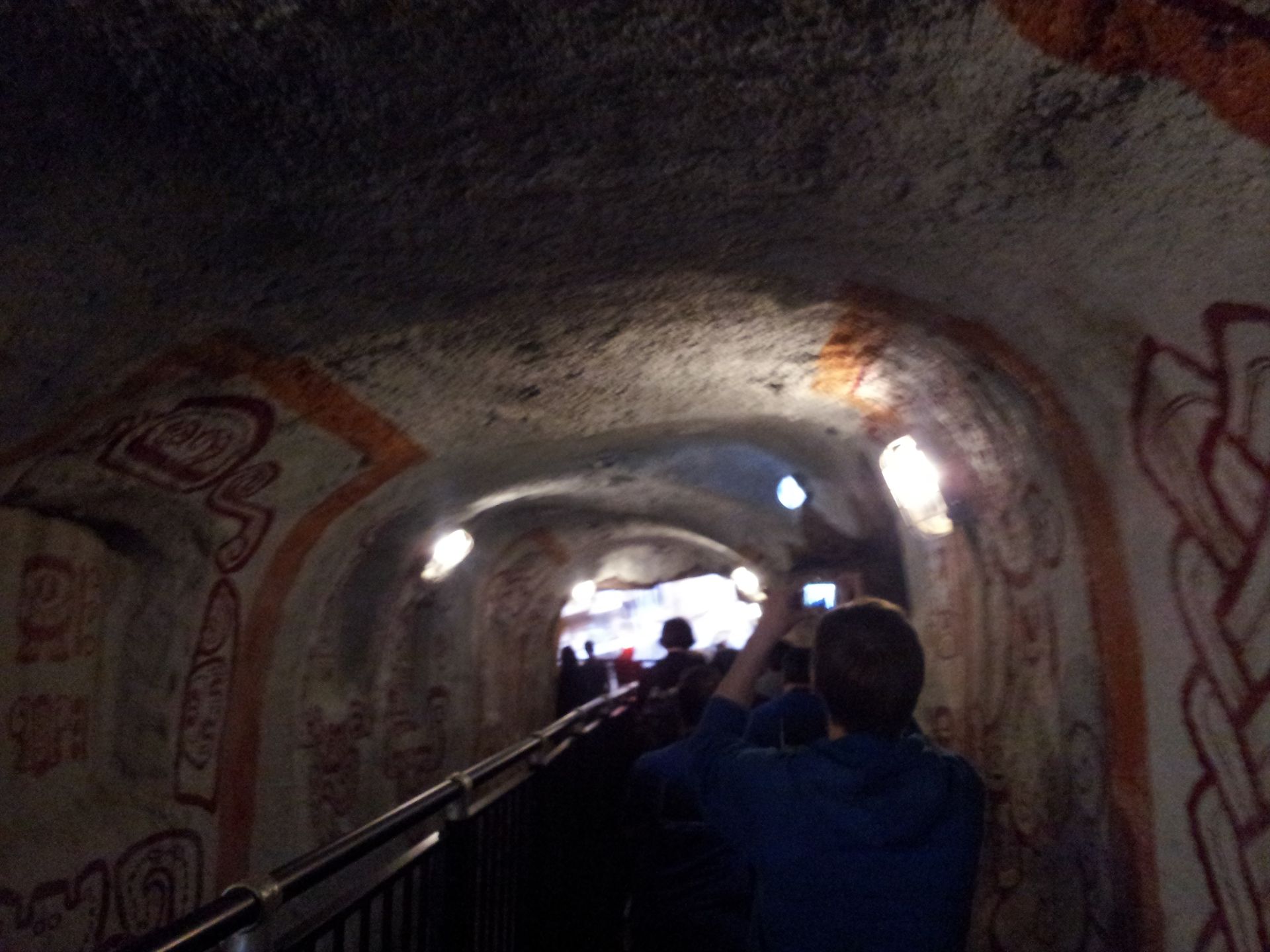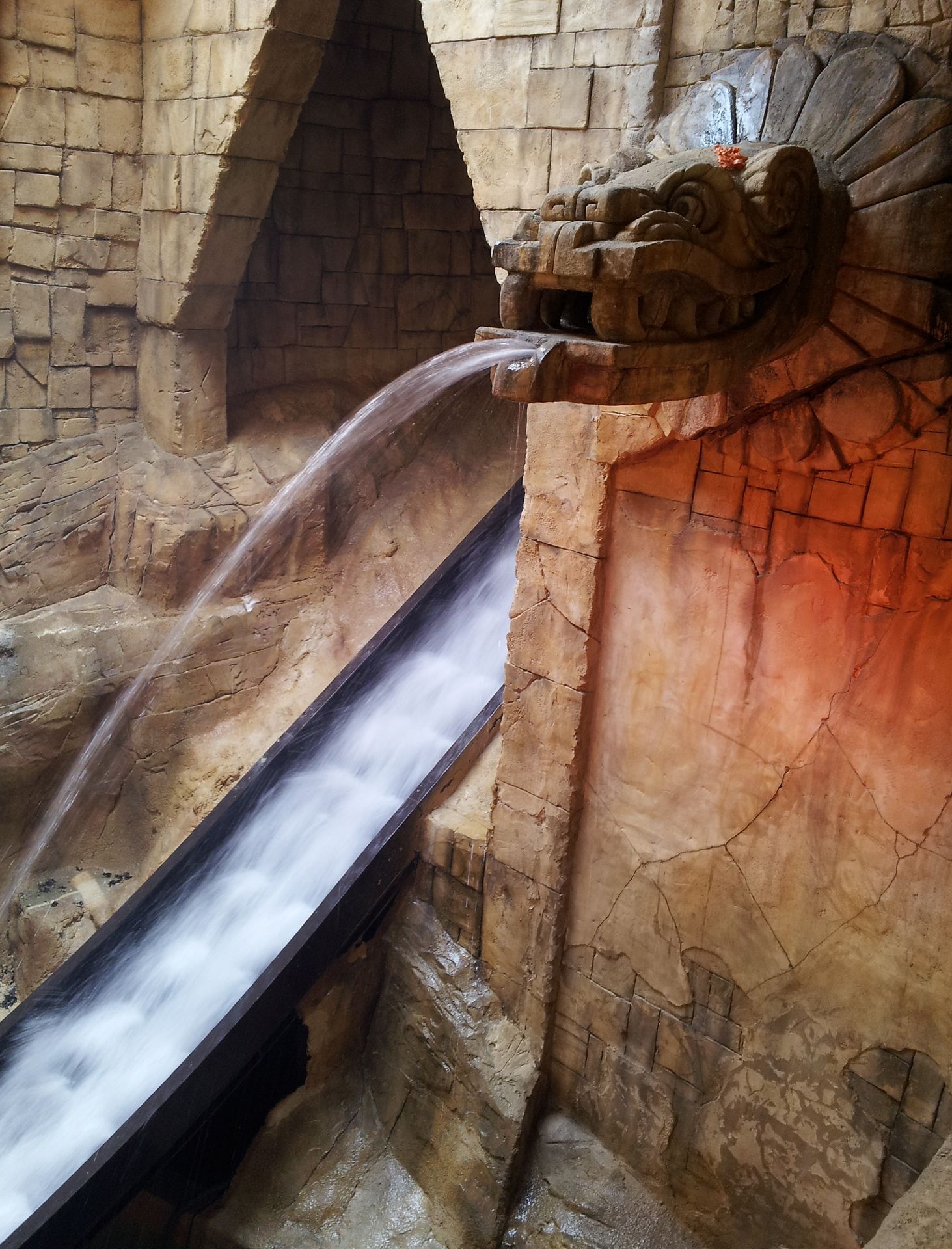 Weiter geht es durch einen mit Höhlenmalereien verzierten Gang, an dessen Ende ein weiterer kleiner Wasserfall vor sich hin prasselt.