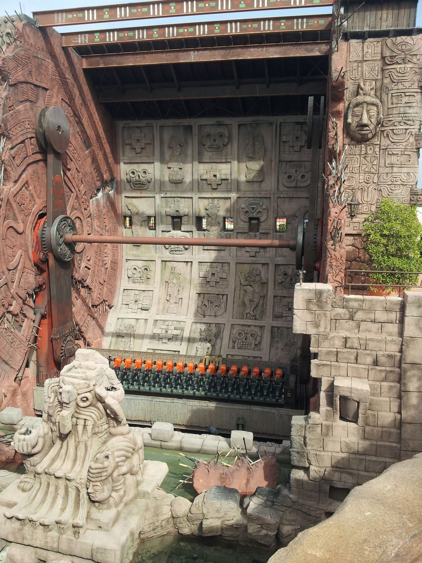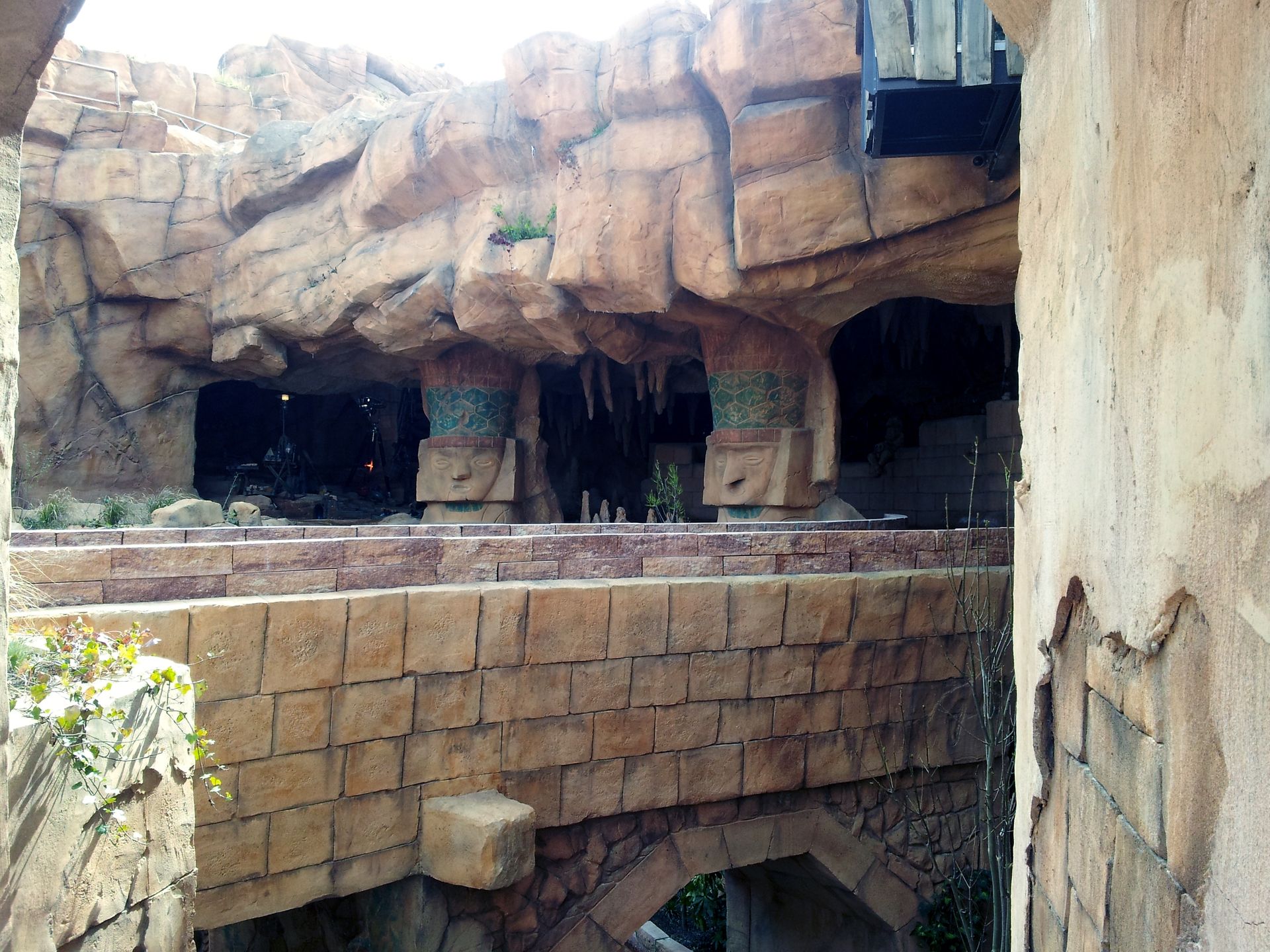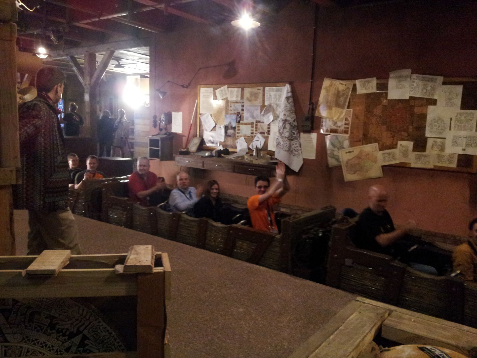 Nach ein paar Kurven geht es in die nächste Höhle, die so sicherlich niemand erwarten würde. Ein fetziger Soundtrack, bunte Lichter, Laser und eine trommelnde Statue. Fertig ist die Party-Höhle, oder auch Fiesta Cave, die man über den Rückwärts-Drop wieder verlässt. Der zweite Richtungswechsel erfolgt über eine Verschiebeplattform, die die Köpfe der Insassen bei der ersten Fahrt durchaus zur Seite reißen kann. Nun wieder vorwärts geht es direkt wieder in die Höhe, um nach wenigen Kurven den markanten Tempel zu umrunden. Von hier geht es weiter hinauf zur höchsten Stelle der Bahn. Eine letzte Linkskurve und das Boot rauscht in die Tiefe, unter der Brücke hindurch und wieder hinauf über den