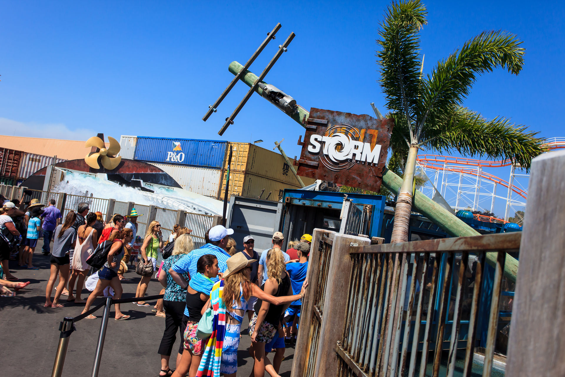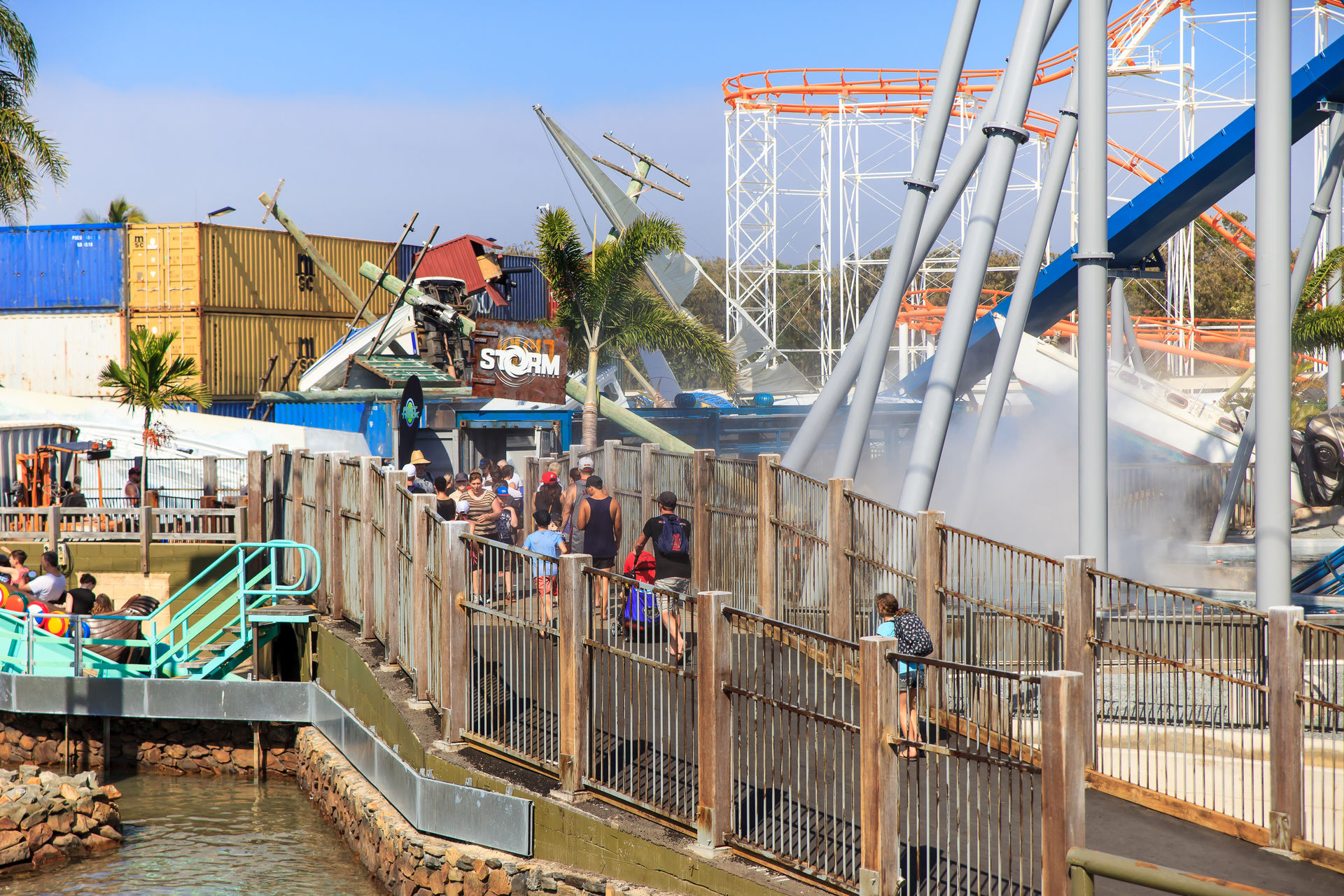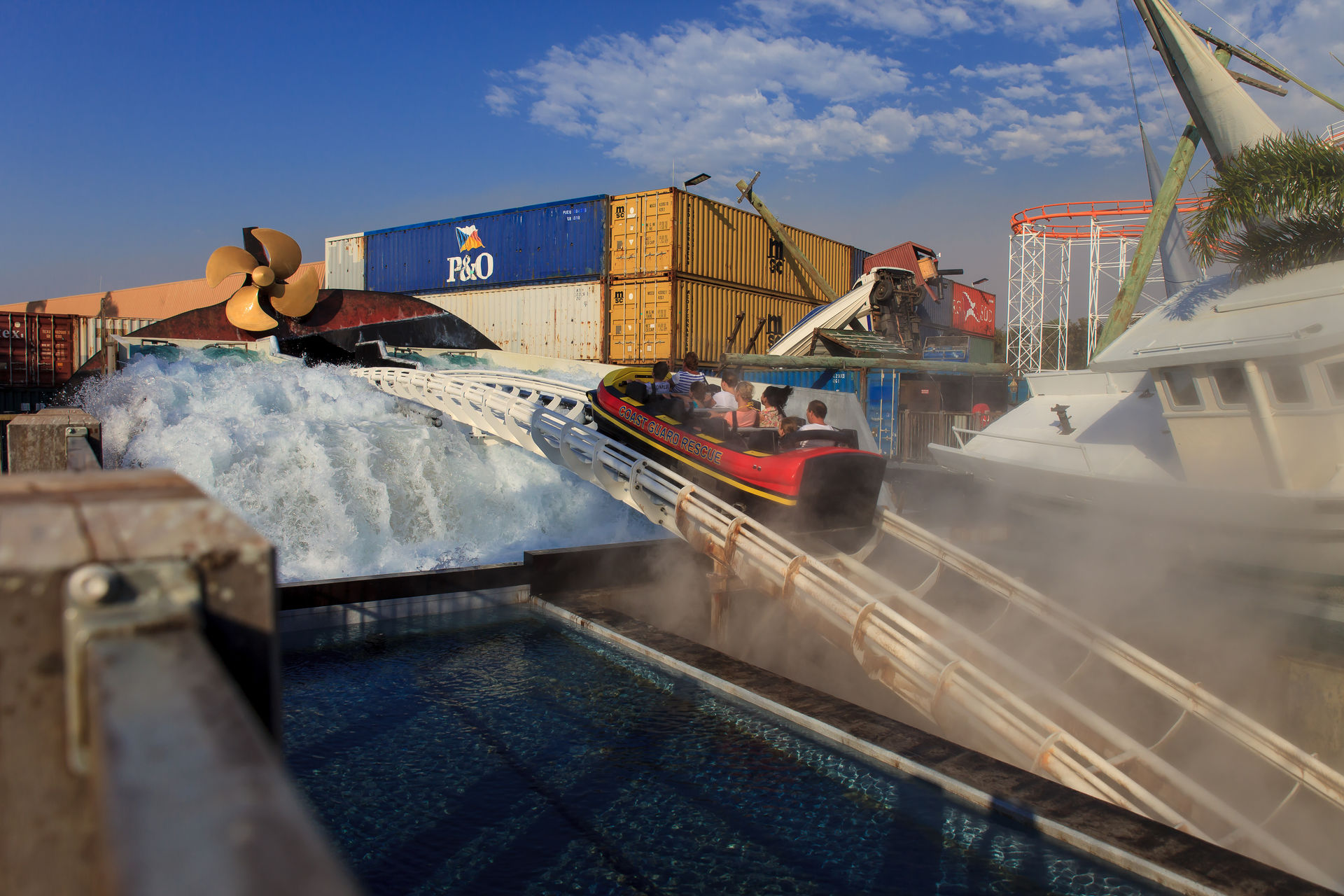 Keinen Monat vor unserem Besuch wurde der Mack'sche Watercoaster Storm eröffnet. In einem kleinen Areal mitten im Park hat der Sturm ordentlich gewütet und alles auseinander genommen, was nicht niet- und nagelfest ist. Das Theming ist stimmig keine Frage, aber bei über 40°C und strahlendem Sonnenschein kommt irgendwie keine Naturkatastrophenstimmung auf. Die Queue führt vom Außenbereich in den großen Containerstapel, wo sich die Station befindet. Im Laufe der Jahre hat Mack den Watercoaster anscheinend technisch immer weiter entwickelt, die Bahn fühlt sich viel runder an, als beispielsweise Poseidon im EP. Das Boot gleitet ohne jegliche Stöße von der Fahrrinne in die Schiene, der Lift ist kaum zu hören und die Kurven nach dem Lift fahren sich butterweich. Nach der Kurvenkombination führt der große Drop unter der Queue entlang in einen kleinen aber feinen Airtimehügel, bevor das Boot in einem gekenterten Schiff verschwindet und die Besucher eine ordentliche Abkühlung bekommen. Durch die Maschinenräume des Schiffs geht es zurück zur Station. Wer immer noch nicht nass genug ist, kann sich in der innenliegenden Splash-Zone noch weiter befeuchten lassen.