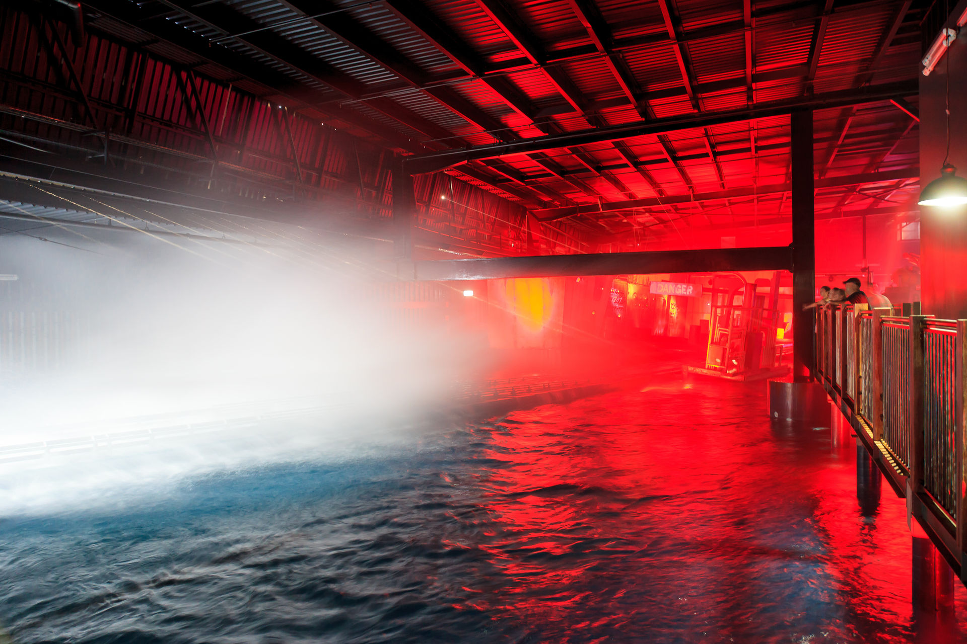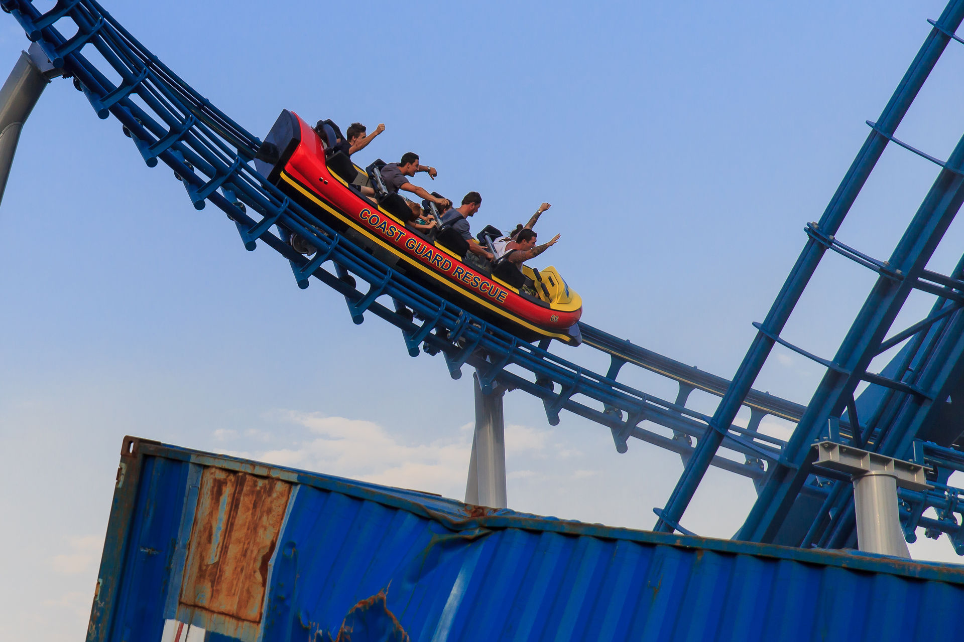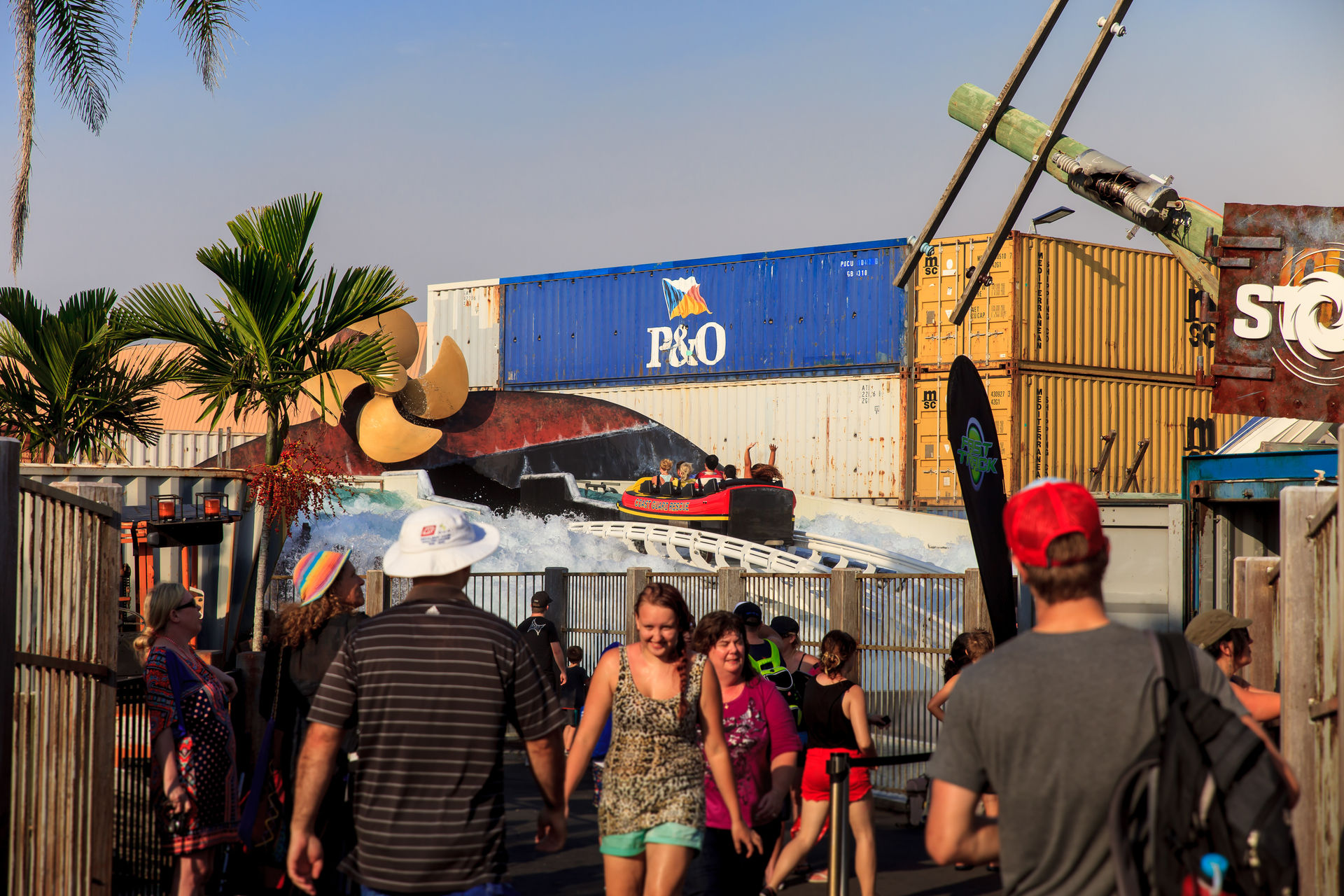 Keinen Monat vor unserem Besuch wurde der Mack'sche Watercoaster Storm eröffnet. In einem kleinen Areal mitten im Park hat der Sturm ordentlich gewütet und alles auseinander genommen, was nicht niet- und nagelfest ist. Das Theming ist stimmig keine Frage, aber bei über 40°C und strahlendem Sonnenschein kommt irgendwie keine Naturkatastrophenstimmung auf. Die Queue führt vom Außenbereich in den großen Containerstapel, wo sich die Station befindet. Im Laufe der Jahre hat Mack den Watercoaster anscheinend technisch immer weiter entwickelt, die Bahn fühlt sich viel runder an, als beispielsweise Poseidon im EP. Das Boot gleitet ohne jegliche Stöße von der Fahrrinne in die Schiene, der Lift ist kaum zu hören und die Kurven nach dem Lift fahren sich butterweich. Nach der Kurvenkombination führt der große Drop unter der Queue entlang in einen kleinen aber feinen Airtimehügel, bevor das Boot in einem gekenterten Schiff verschwindet und die Besucher eine ordentliche Abkühlung bekommen. Durch die Maschinenräume des Schiffs geht es zurück zur Station. Wer immer noch nicht nass genug ist, kann sich in der innenliegenden Splash-Zone noch weiter befeuchten lassen.