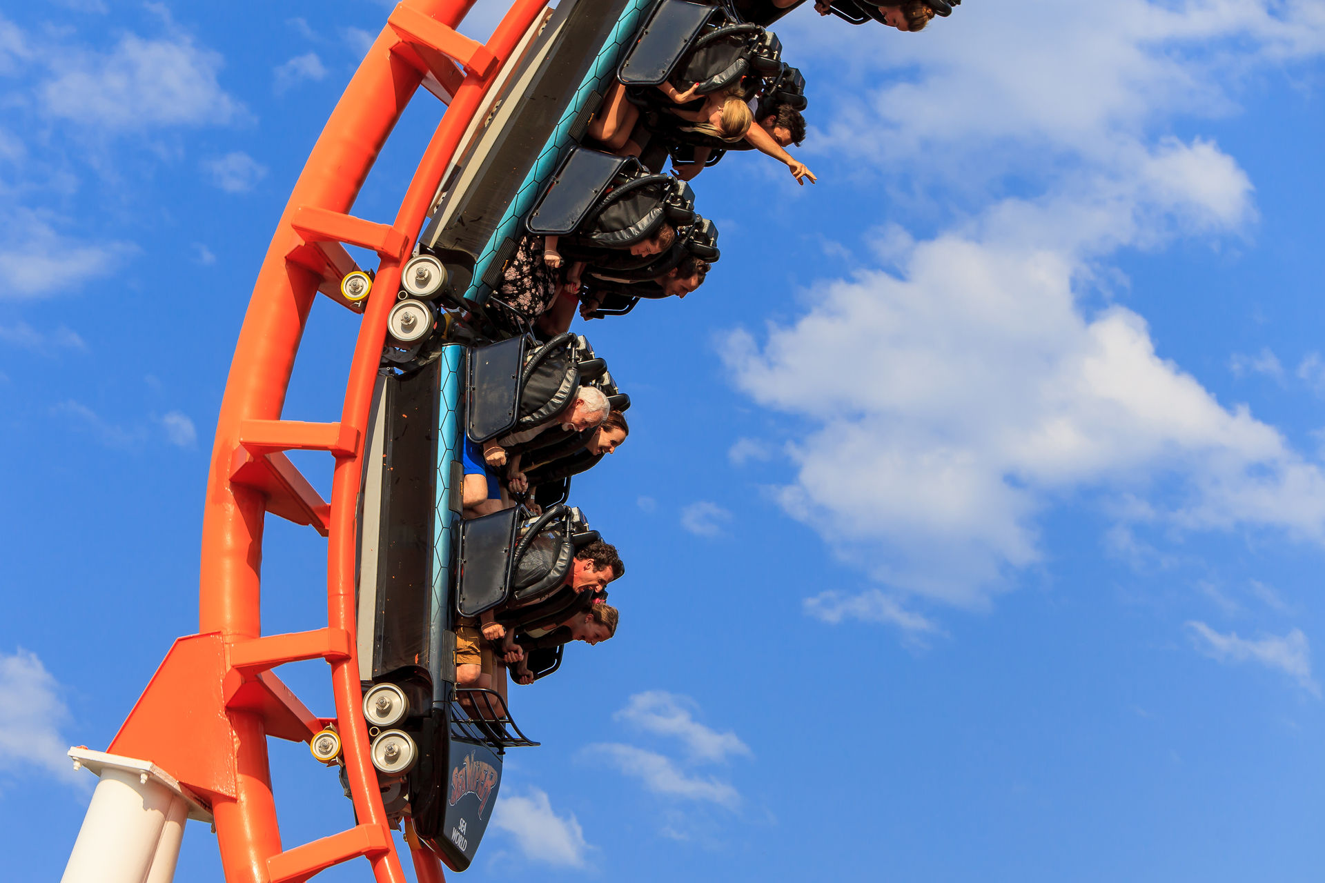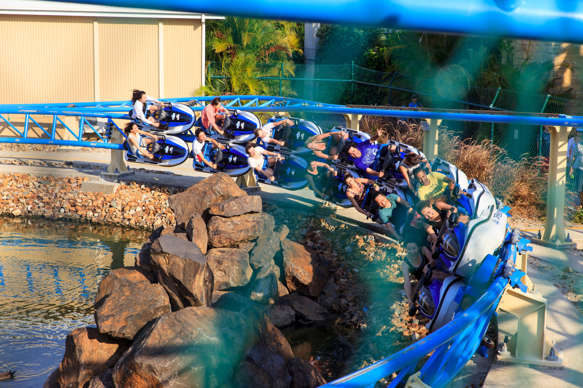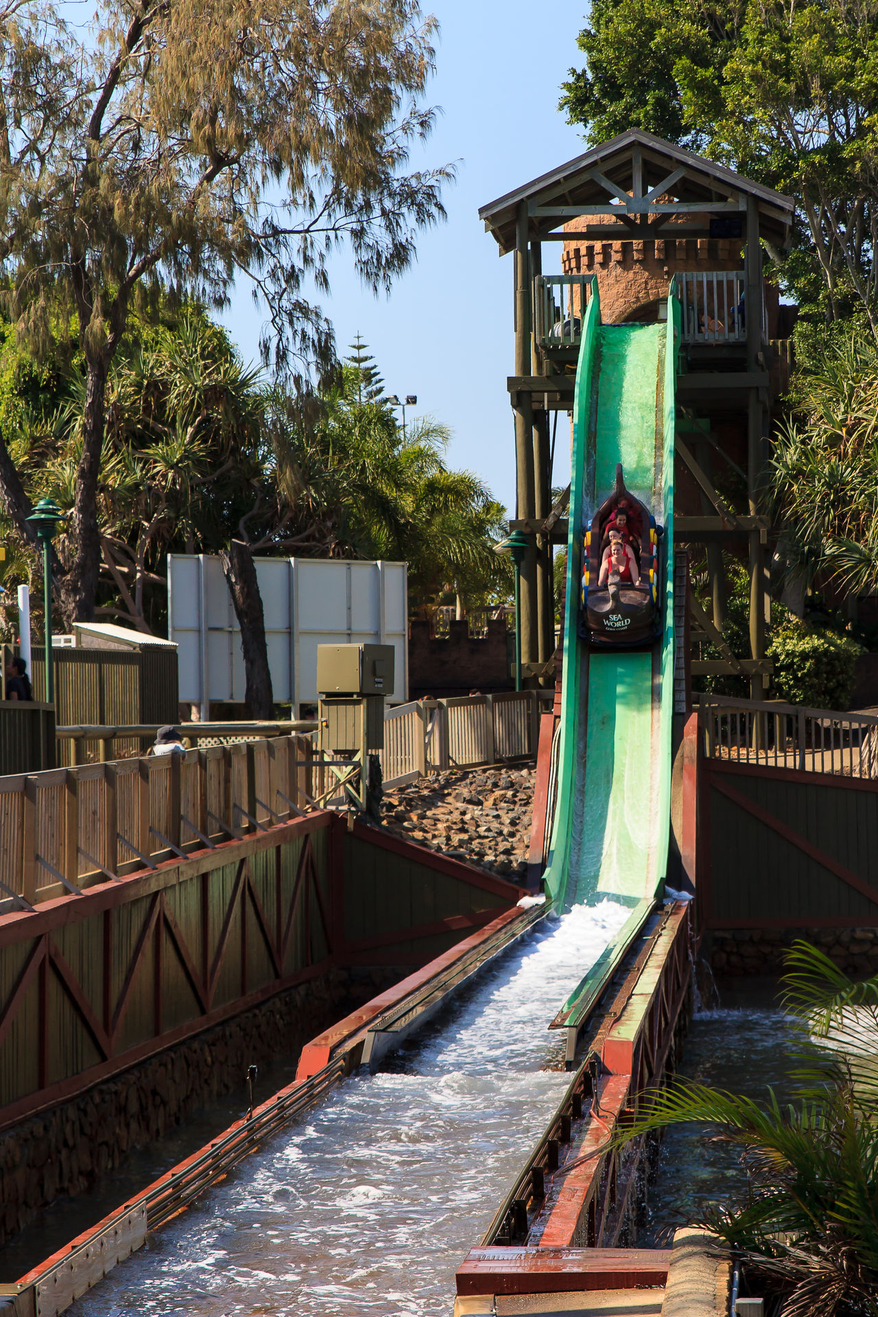 nachdem wir uns am 2. Januar schon in der WB Movie World von Gold Coast ausgetobt hatten, stand am 3. Januar der benachbarte Wasserpark Wet'n'Wild auf dem Programm. Wir waren schon vor Parköffnung am Park - eine sehr gute Entscheidung wie sich später herausstellte. Schnell umgezogen und ab zu den vier Loopingrutschen mit Falltür. Nach einer viertel Stunden Warten, konnten wir uns einen der Rückenprotektoren schnappen und den Turm erklimmen. Wenn alle vier Rustchen besetzt sind ertönt ein Countdown, bevor sich die Falltür öffnet und es rund 30 Meter in die Tiefe geht. Der anschließende Looping ist durch das bergaufrutschen eine ungewöhnliche Erfahrung, die aber ruhig auch etwas flotter absolviert werden könnte. Die Falltür ist das eigentliche Highlight der Rutsche. Die Fülle im Park hatte in der Zwischenzeit schon rapide zugenommen, sodass wir im Anschluss nur noch für die Halfpiperutsche, eine Reifenrutsche die Trichterrutsche, den großen Rutschenturm und natürlich den seltenen Halfpipe-Coaster anstellten.