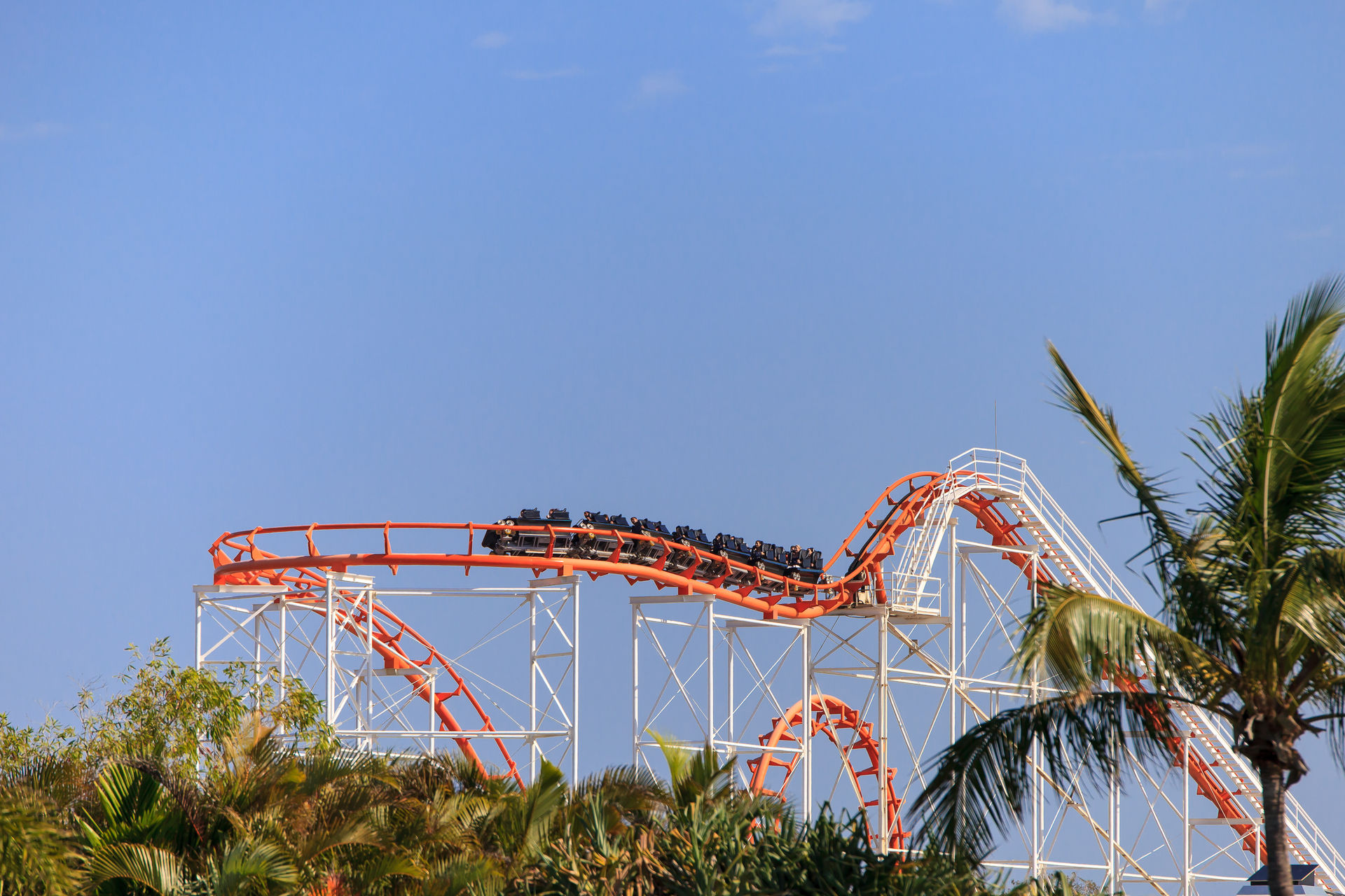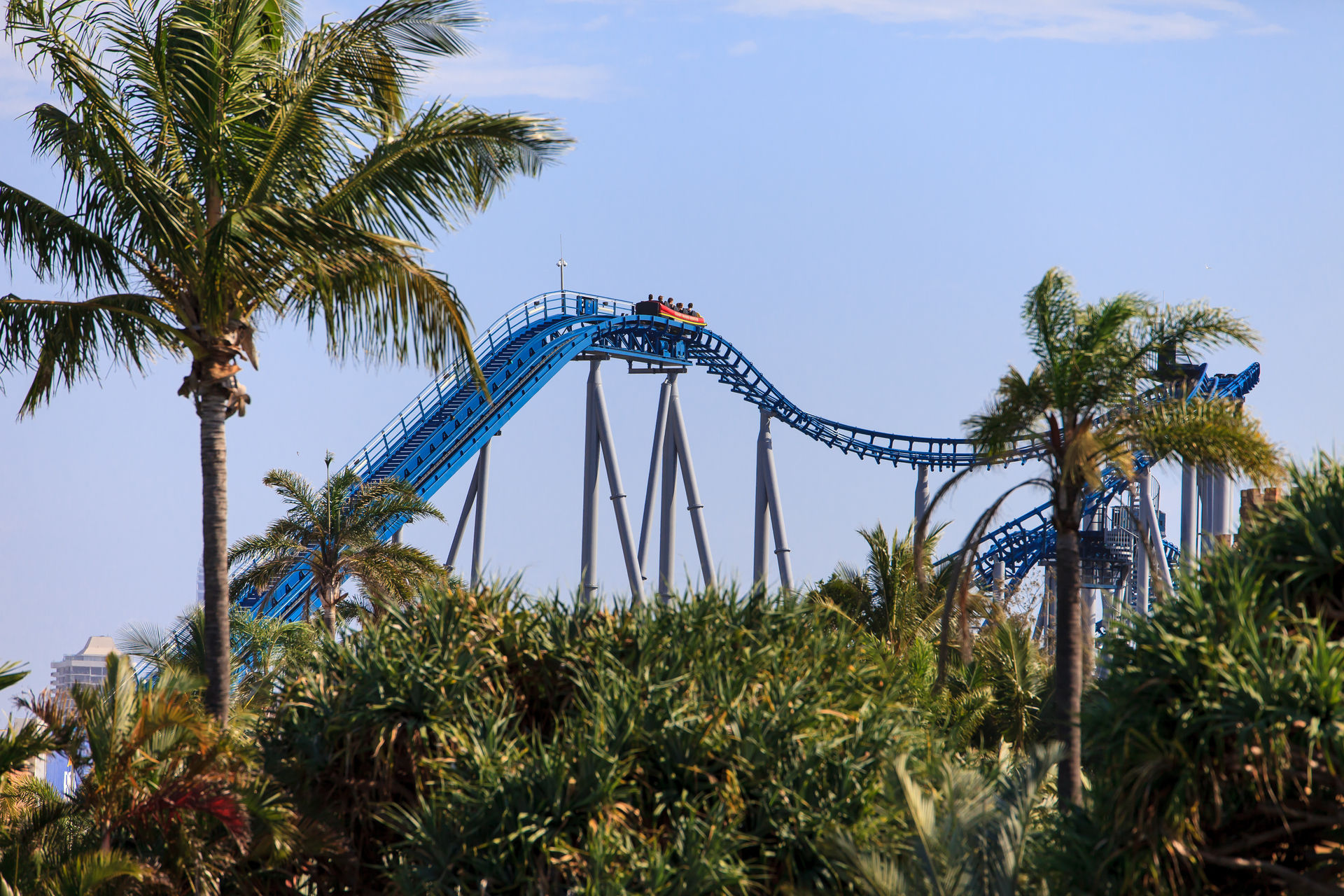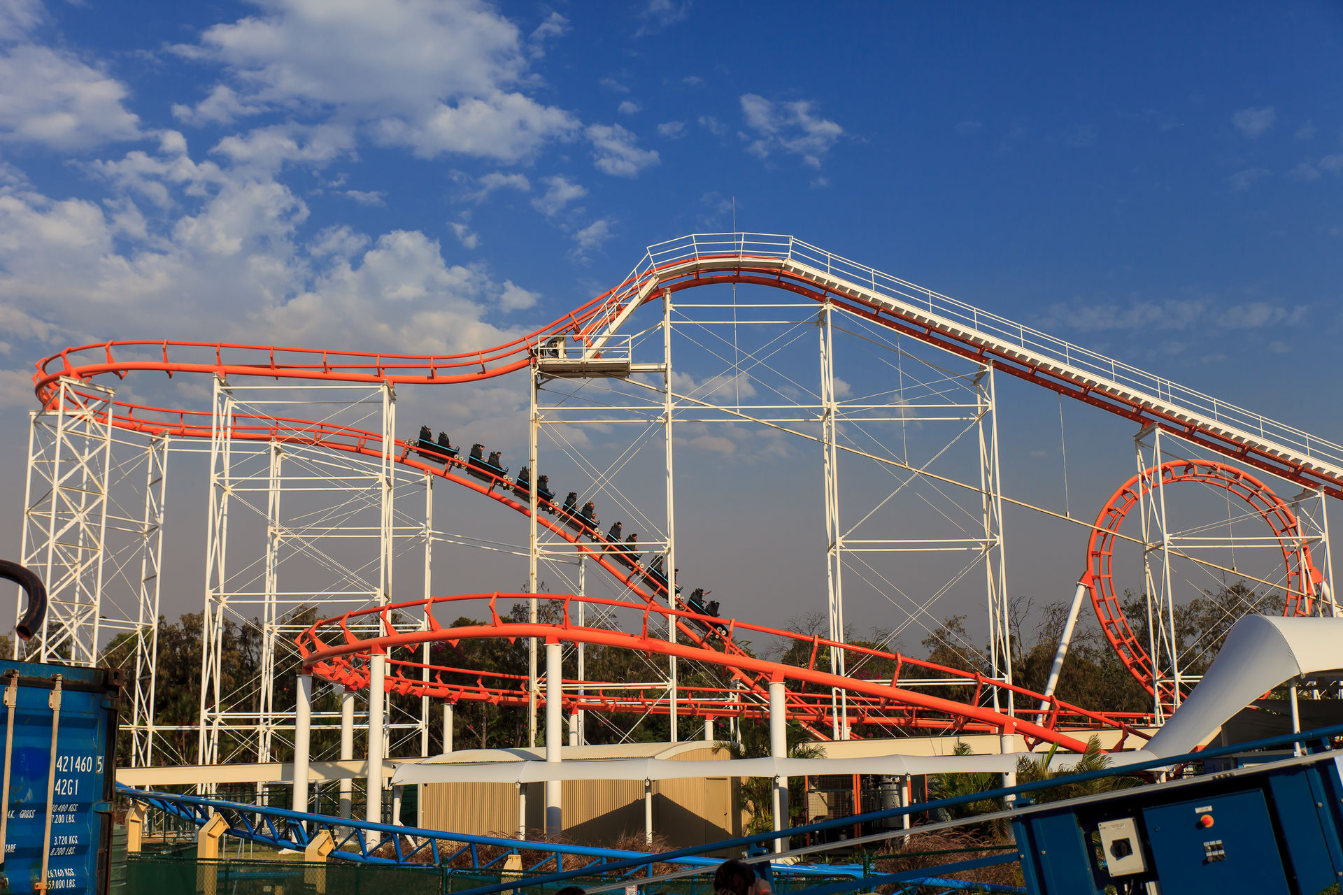 nachdem wir uns am 2. Januar schon in der WB Movie World von Gold Coast ausgetobt hatten, stand am 3. Januar der benachbarte Wasserpark Wet'n'Wild auf dem Programm. Wir waren schon vor Parköffnung am Park - eine sehr gute Entscheidung wie sich später herausstellte. Schnell umgezogen und ab zu den vier Loopingrutschen mit Falltür. Nach einer viertel Stunden Warten, konnten wir uns einen der Rückenprotektoren schnappen und den Turm erklimmen. Wenn alle vier Rustchen besetzt sind ertönt ein Countdown, bevor sich die Falltür öffnet und es rund 30 Meter in die Tiefe geht. Der anschließende Looping ist durch das bergaufrutschen eine ungewöhnliche Erfahrung, die aber ruhig auch etwas flotter absolviert werden könnte. Die Falltür ist das eigentliche Highlight der Rutsche. Die Fülle im Park hatte in der Zwischenzeit schon rapide zugenommen, sodass wir im Anschluss nur noch für die Halfpiperutsche, eine Reifenrutsche die Trichterrutsche, den großen Rutschenturm und natürlich den seltenen Halfpipe-Coaster anstellten.