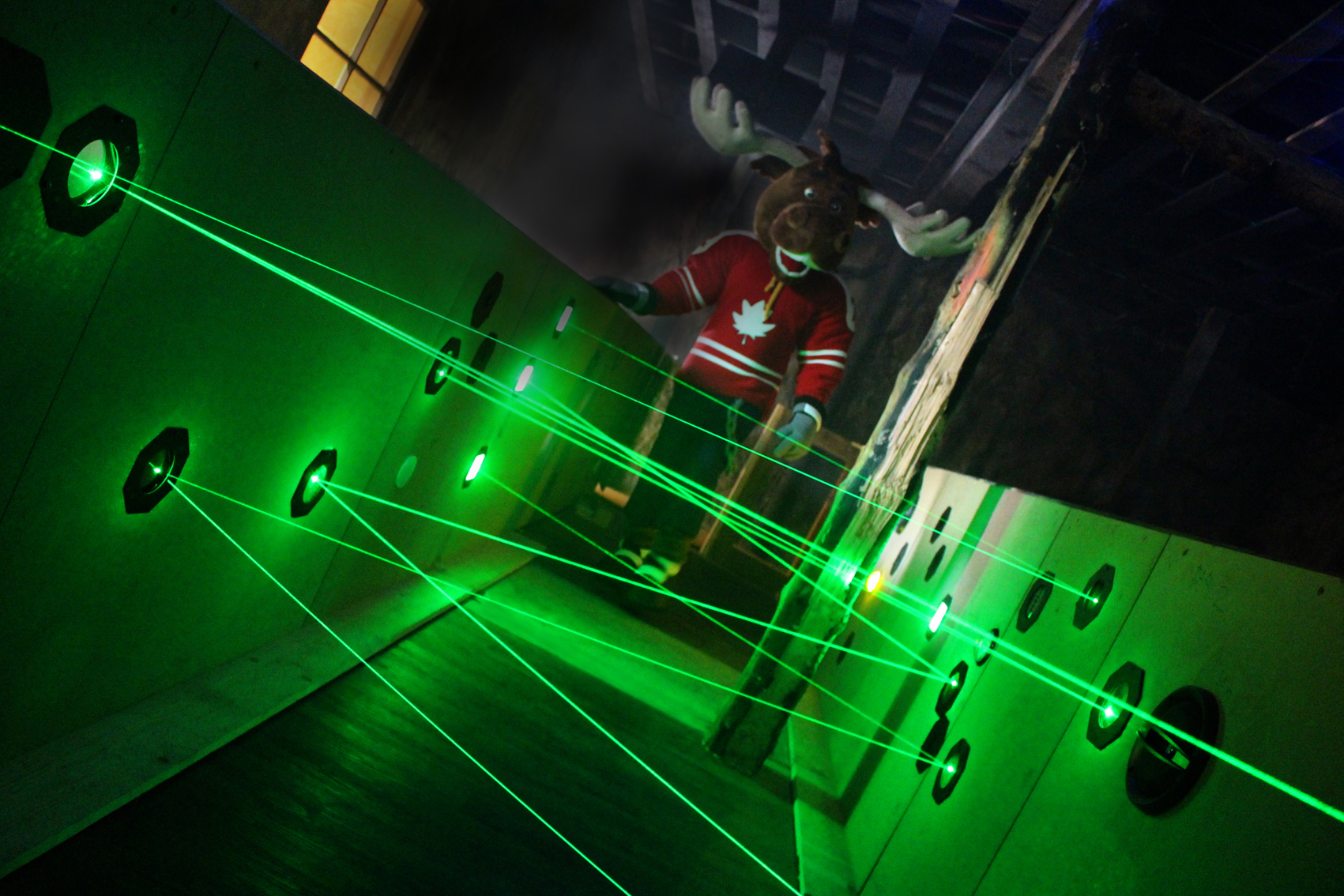 Der Elch Moose begutachtet die Fortschritte der Baumaßnahmen im Laser-Parcours der neuen Attraktion FunnyFuxBau.