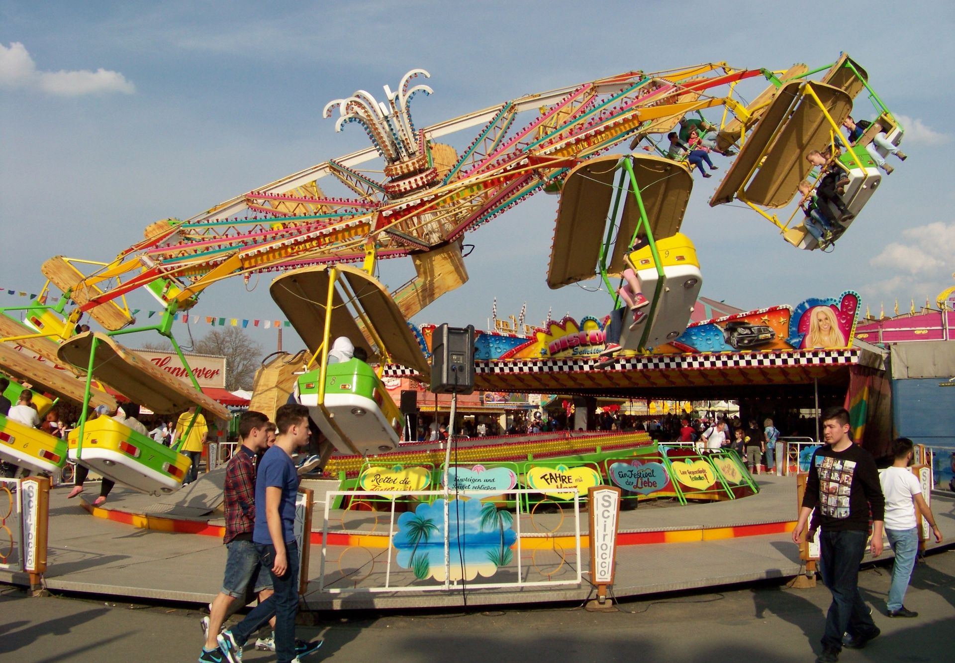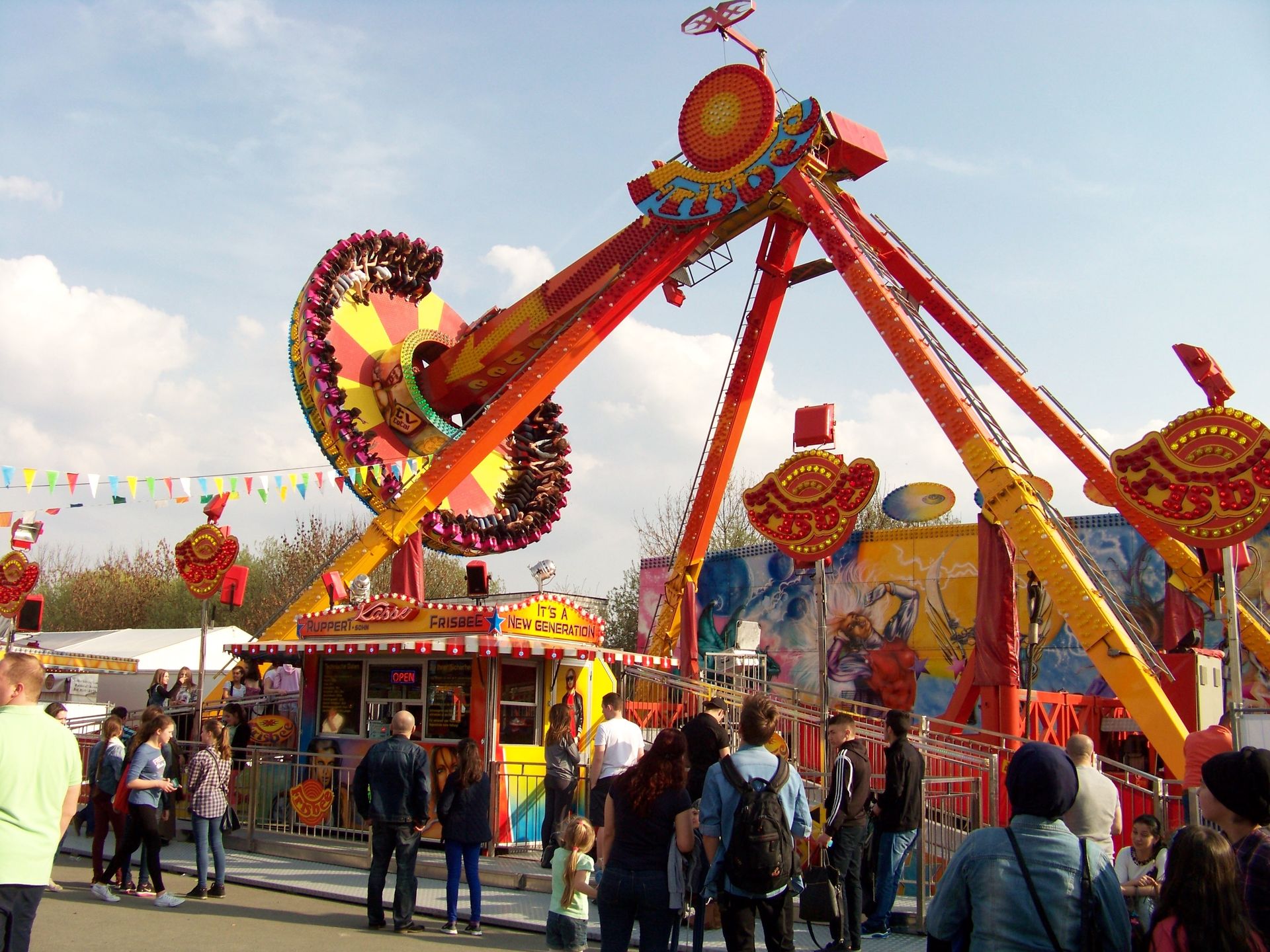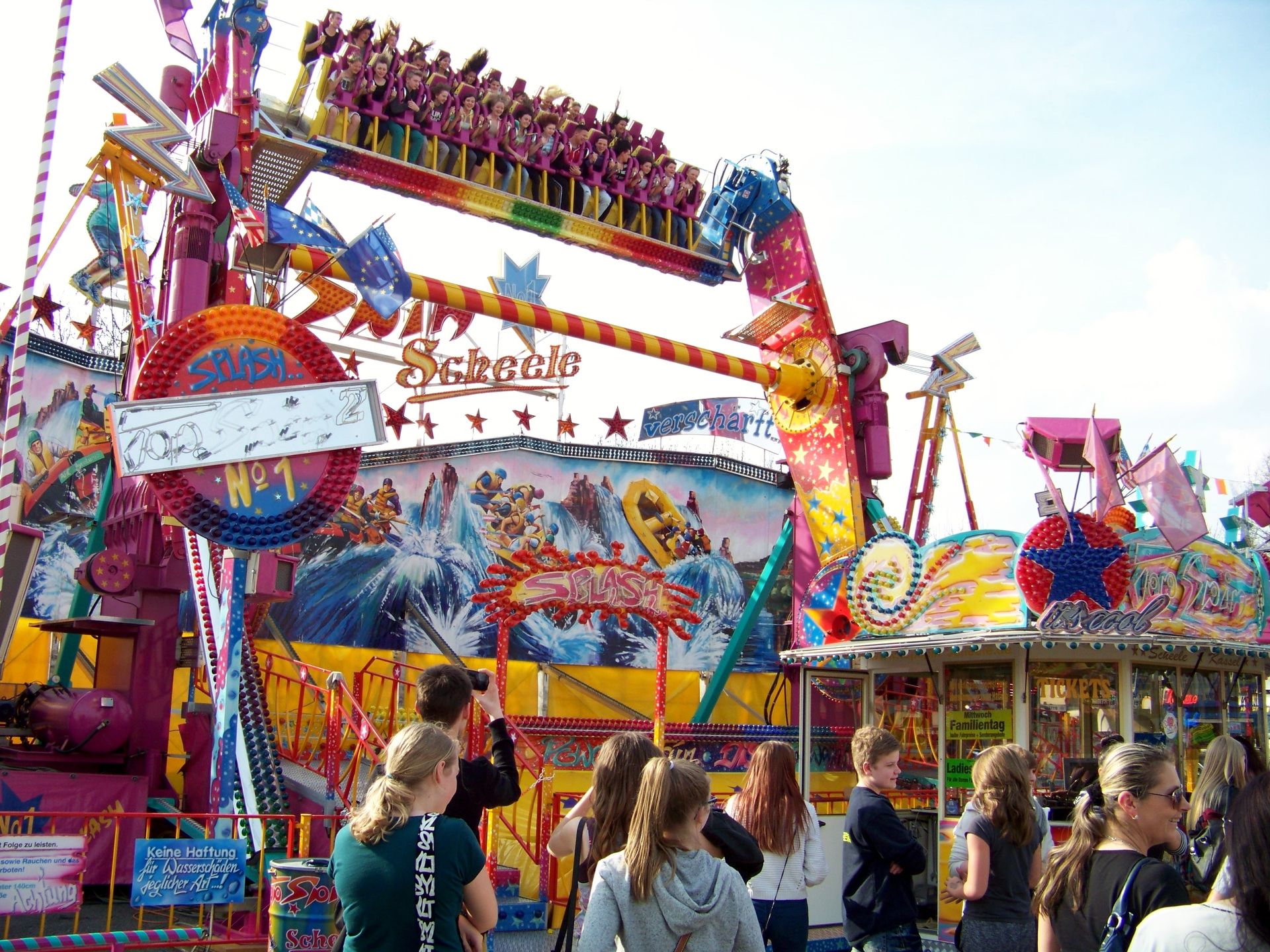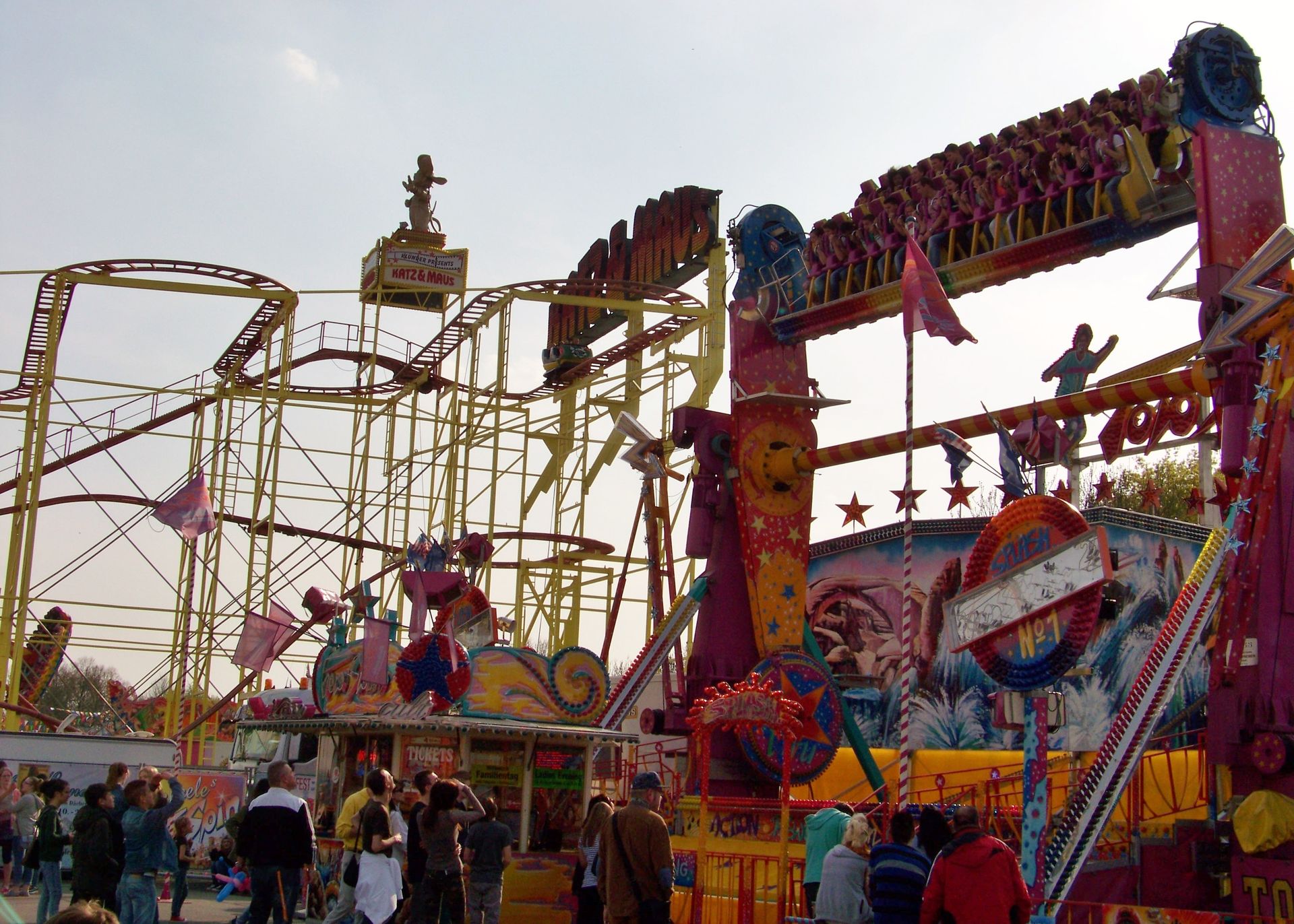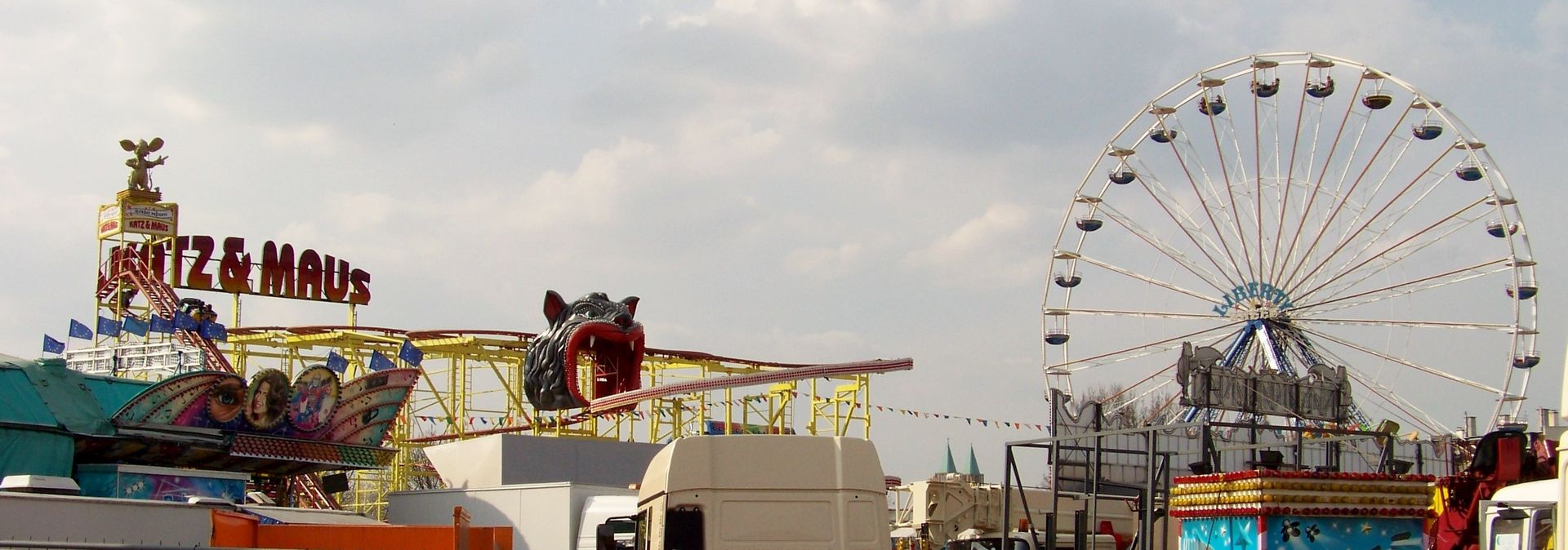 Einziger Wehrmutstropfen an diesem schönen Kirmesnachmittag war, dass die Hauptattraktion – der Gladiator – leider außer Betrieb war. Sehr schade! Allerdings hatte das Frühlingsfest trotzdem noch genug zu bieten, wenn auch sehr viel Kasseler Standard dabei war. So nahmen Rupperts Take Off, der Scirocco, Niers Starlight Express und die beiden Scooter ihre Stammplätze ein. Auch die Frisbee von Ruppert gehört hier mittlerweile zum festen Inventar. Scheeles Top Spin (für mich immer noch das schönste Exemplar in Deutschland) gab ein erneutes Heimgastspiel. Weiterhin wurden noch Katz & Maus, U 3000, Domino und das Liberty Wheel von Gormanns geboten.