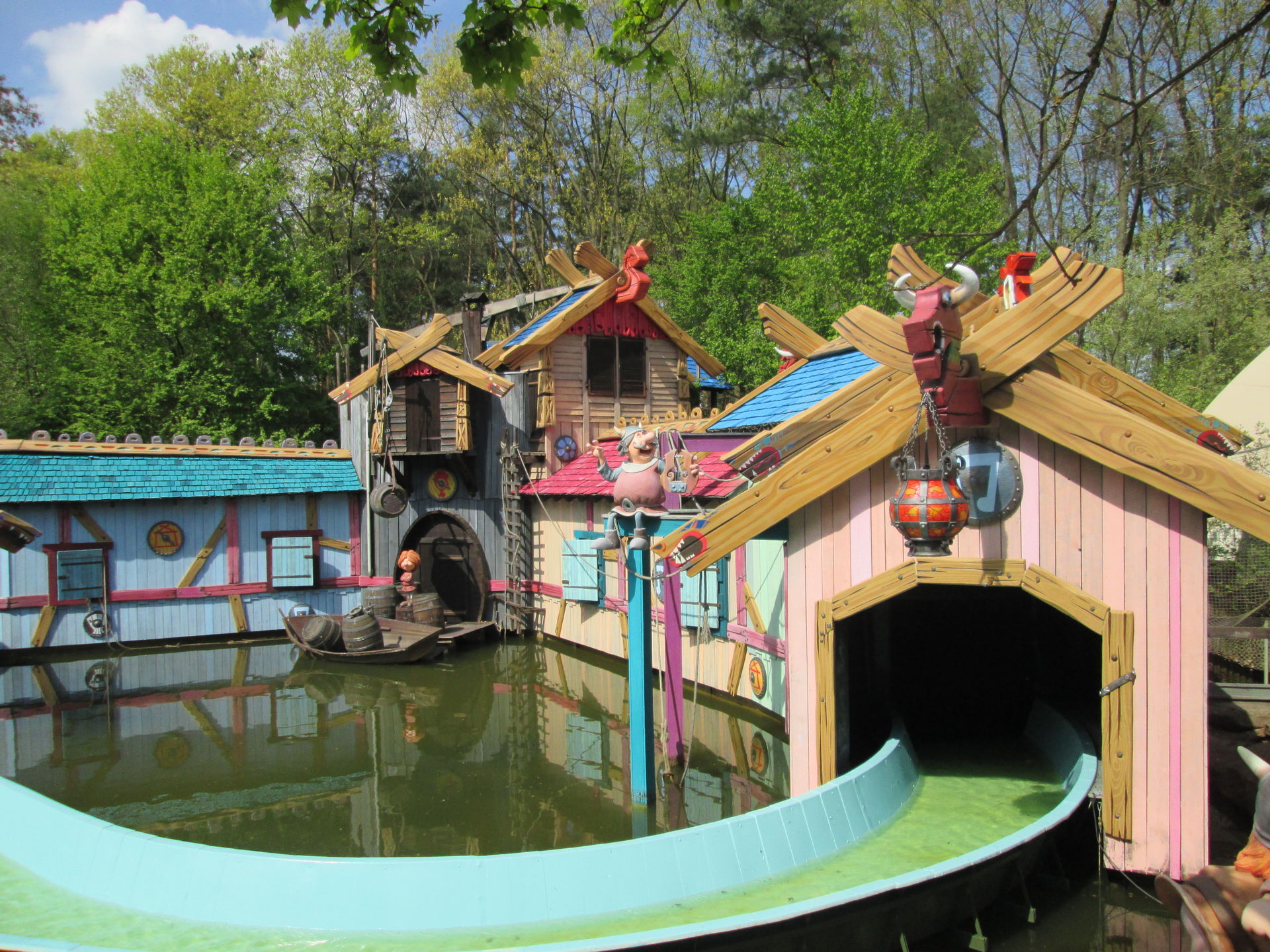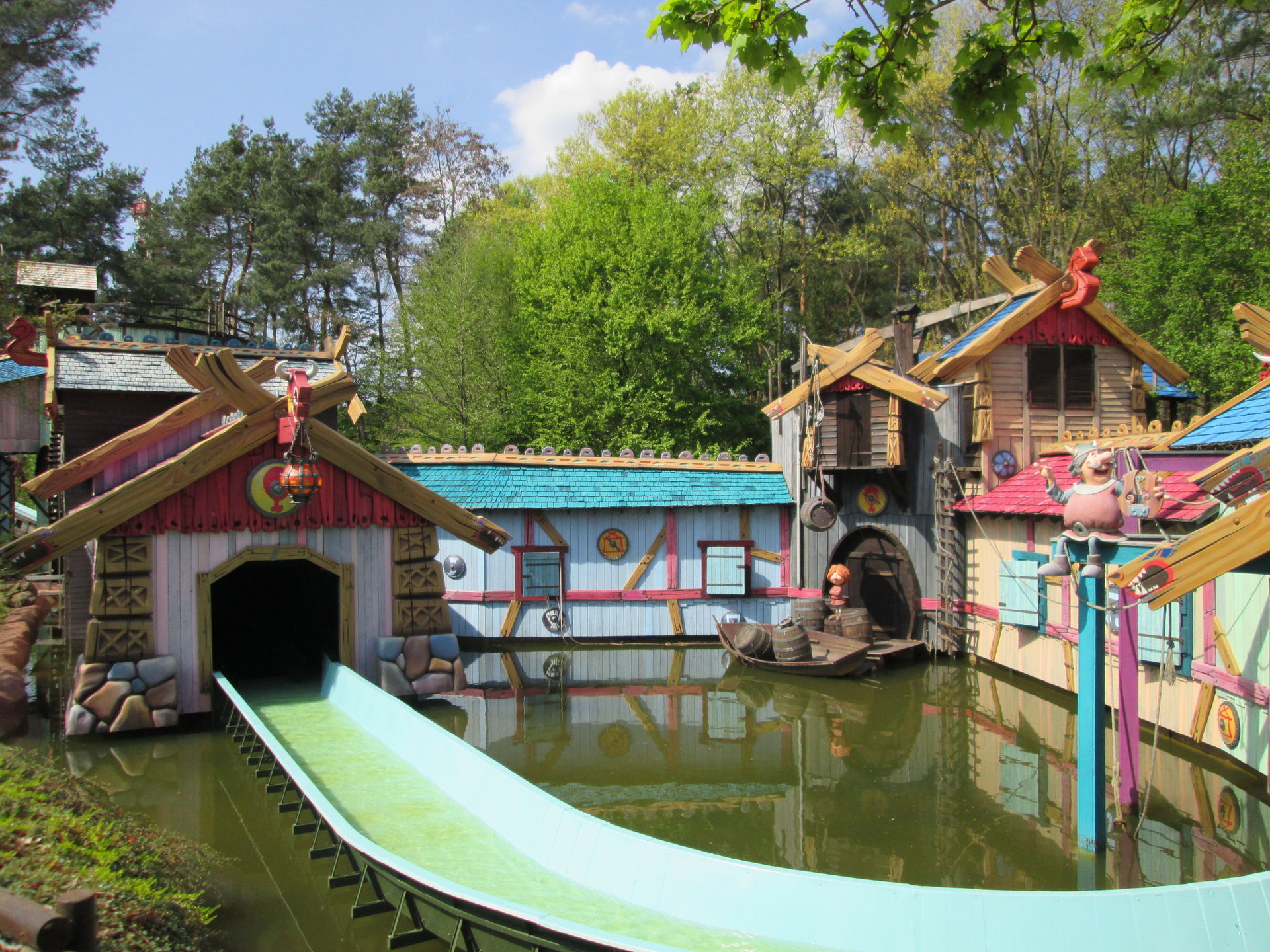 Die heutige Pressekonferenz des Holiday Park gab darauf gleich mehrere Antworten. Wie die Einleitung schon vermuten lässt, gibt es in diesem Jahr mehr als "nur" eine neue Achterbahn zu entdecken. Der Park hat über die Winterpause rund 8 Millionen Euro in gleich drei große Neuerungen investiert. Bereits in den vergangenen Jahren hat der neue Eigentümer des Parks, die belgische Plopsa / Studio100-Gruppe, damit Angefangen, den zum Zeitpunkt der Übernahme etwas in die Jahre gekommen Park zu modernisieren, die Infrastruktur zu verbessern und die vormals lose Ansammlung von durchaus beachtlichen Attraktionen in ein Themenkonzept einzubinden. Nach der Einführung von Biene Maja als neuem Parkcharakter für Kinder - samt großem zugehörigen Parkbereich - wird in diesem Jahr eine weitere bekannte Kindersendung ihren Platz im Park finden. Dazu wurden in der Winterpause die Teufel aus der Wildwasserbahn "Teufelsfässer" ausgetrieben und fortan regieren in diesem Parkbereich Wickie und seine Wickinger. Die ehemals braungrauen Bergwerksgebäude erstrahlen nun in frischen, bunten Farben und zusammen mit dem neuen Imbiss und dem neuen Shop ist der Wildwasserbahnvorplatz nun ein stimmiges Gesamtensemble geworden. Positiv fällt hier auch die Verlegung des Eingangs zur Wildwasserbahn auf: Wer nun nicht genug von der feuchtfröhlichen Fahrt in den Baumstämmen bekommt, kann direkt neben dem Ausgang wieder die Warteschlange betreten. Somit gibt es zukünftig auch keine langen Fußwege zum anderen Ende der Attraktion mehr, um dort die wartenden Bekannten / Verwandten nach der Fahrt wieder einzusammeln.