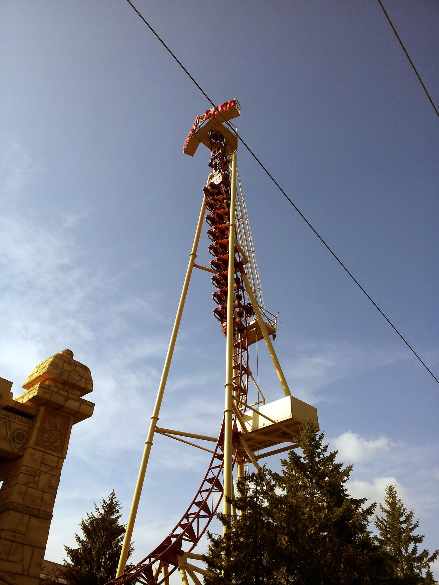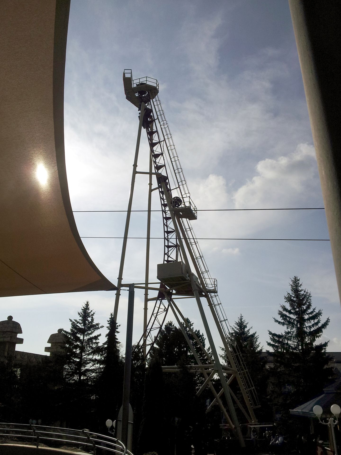 Langsam setzt sich der Zug rückwärts in Bewegung, bis er mit einem deftigen Ruck im Catch Car einklinkt. Fortan geht es etwas schneller aber weiterhin rückwärts in die Höhe. Dabei machen wir erstmals ausführliche Bekanntschaft mit den Bügeln, denn der Turm hängt ein wenig nach vorne, ist also mehr als senkrecht.