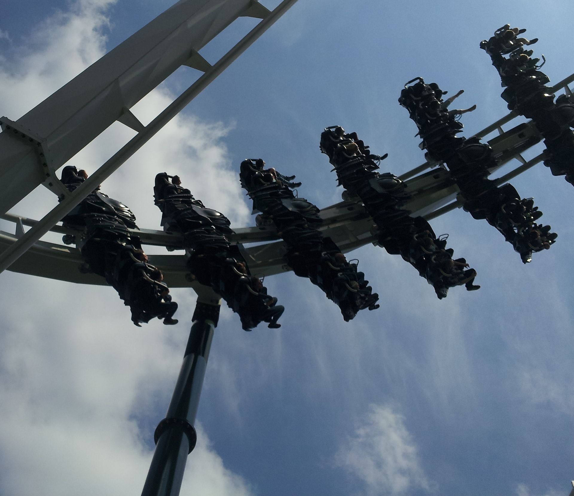 Nach etwa einer halben Stunde konnten wir endlich unser Gepäck abgeben (finde ich eine sehr gute Sache!) und die Station betreten. Natürlich sollte es die erste Reihe sein, auch wenn wir dafür ein, zwei Züge länger warten mussten. Dann klappte der Boden weg und meine erste Fahrt auf einem Dive Coaster konnte beginnen. Aus gut 40 Metern hat man eine nette Aussicht über den See und nach einer Kurve rollt man langsam auf den neuen Wing Coaster ? und natürlich den Abgrund ? zu. Der Wagen neigt sich langsam gen Wasseroberfläche ? und bleibt kurz stehen.