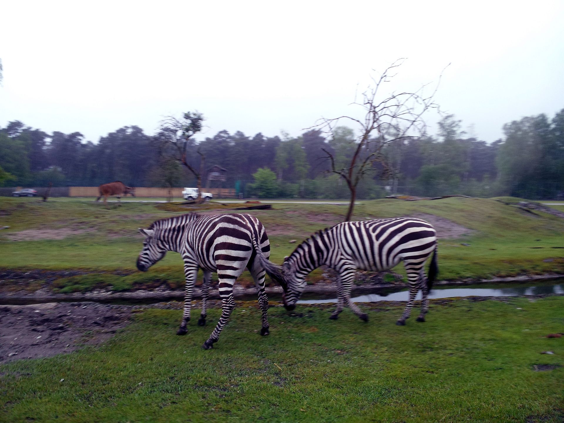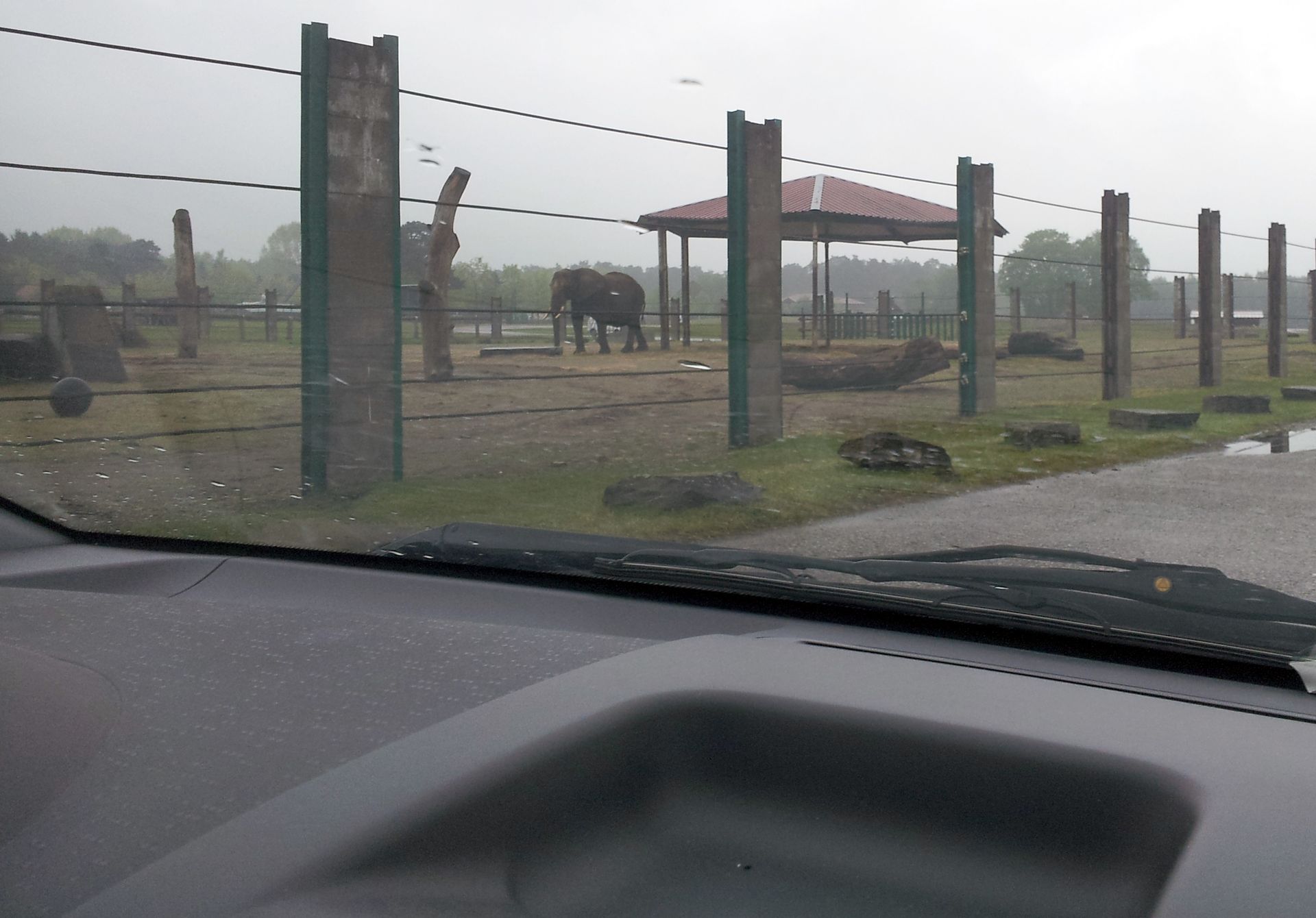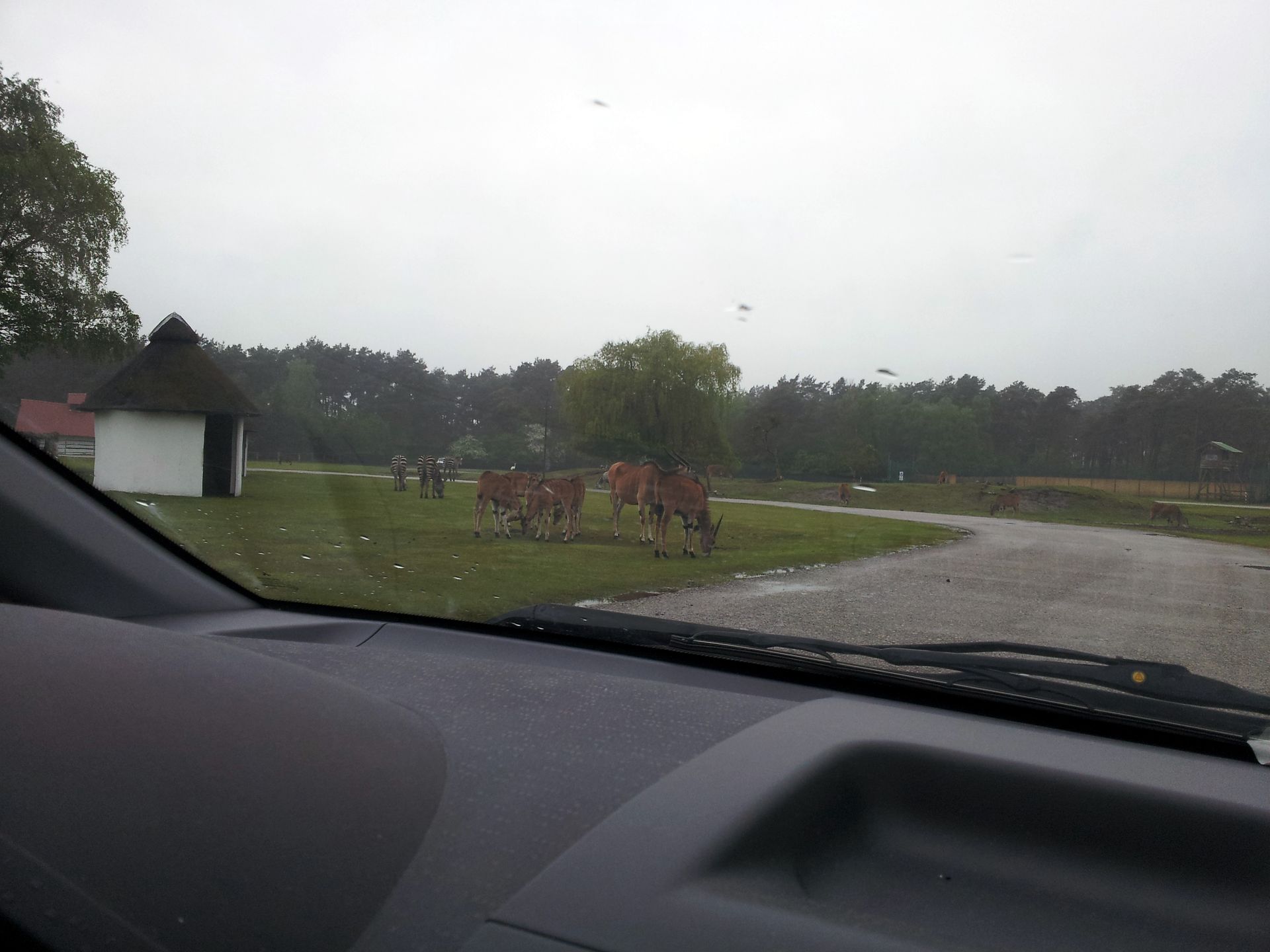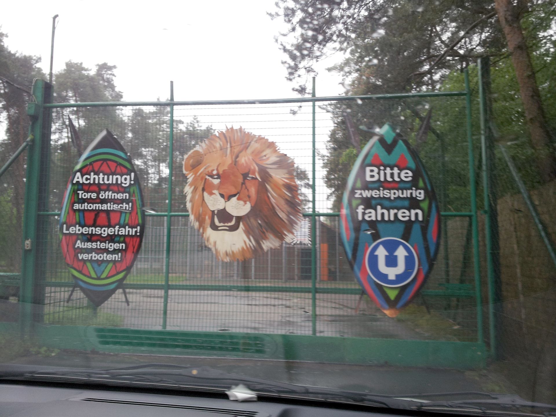 Das zweite Ziel des Tages war der Zoo Safaripark Stukenbrock (nach der Abfahrt von der Autobahn noch als Hollywood Safaripark ausgeschildert) zwischen Bielefeld und Paderborn. Schon unterwegs hatte es immer wieder unterschiedlich stark geregnet. Bei der Ankunft war es einigermaßen trocken. Der Park selbst besteht aus einem "Safari-Teil", bei dem man mit dem eigenen PKW oder in Bussen durch verschiedene Gehege hindurchfährt, und einem Freizeitparkteil. Die Kassen sind hier so angelegt, dass man direkt aus dem Auto raus bezahlen und dann entweder nach links zum Parkplatz oder nach rechts zur Safari fahren kann.