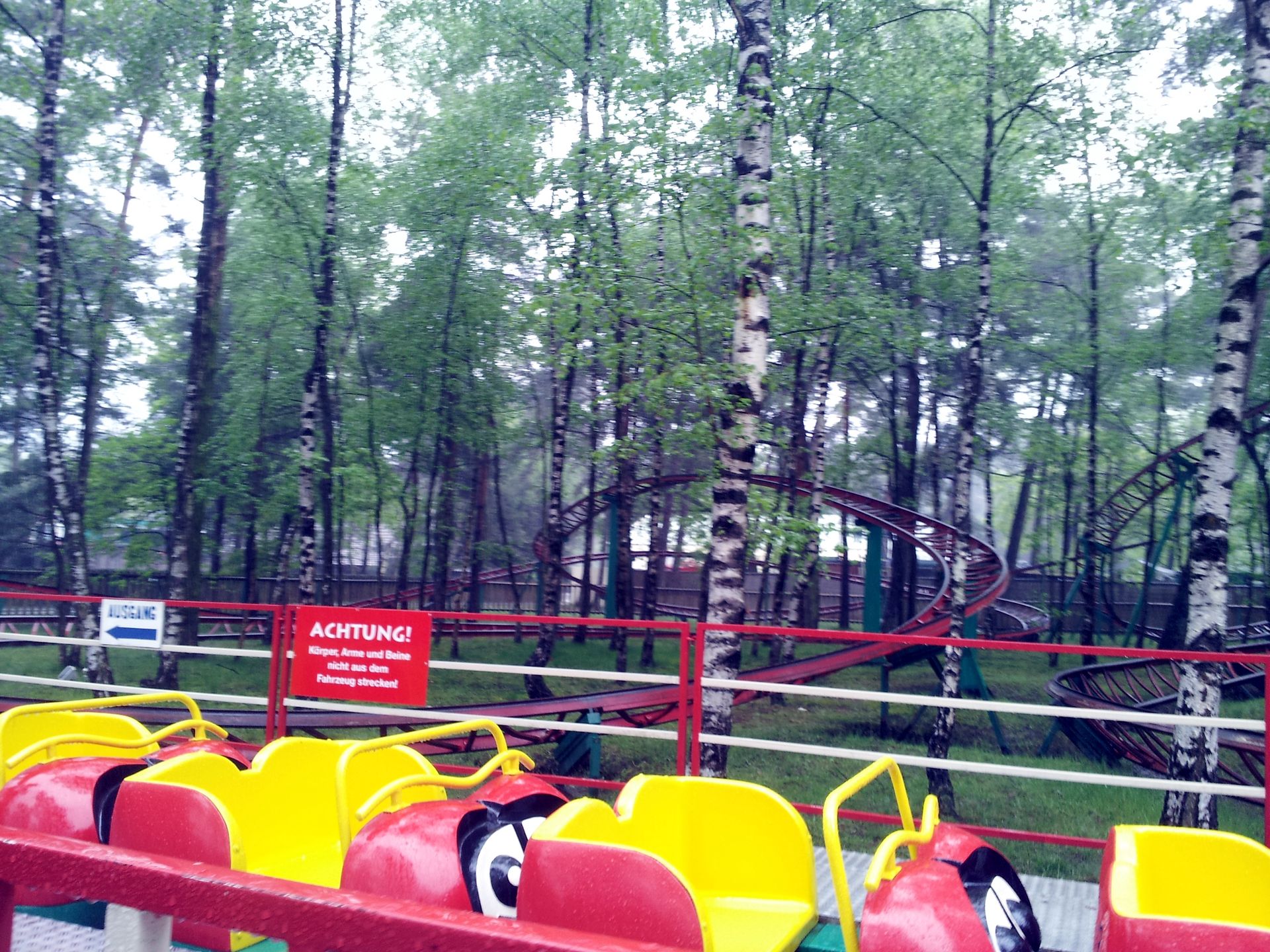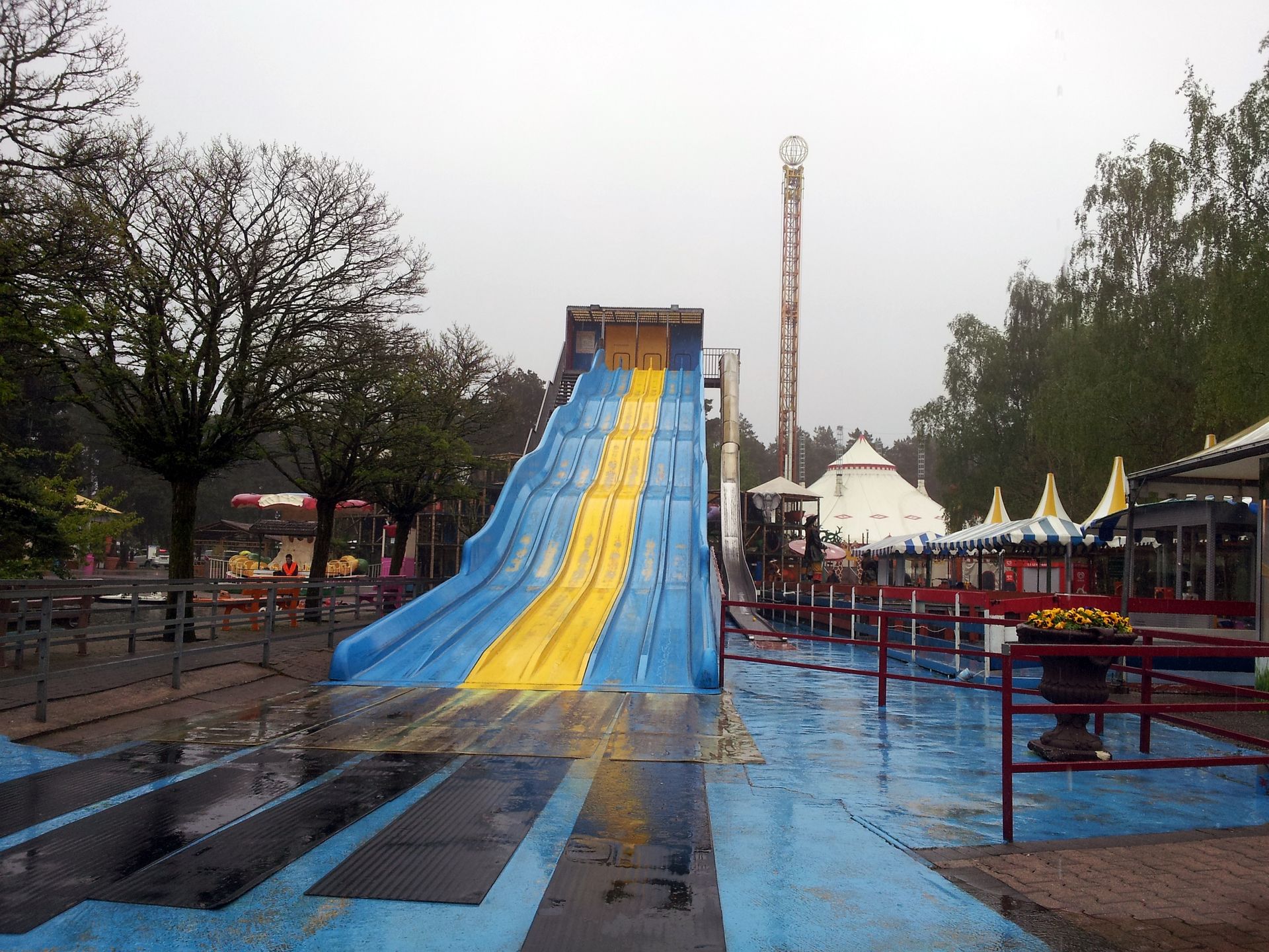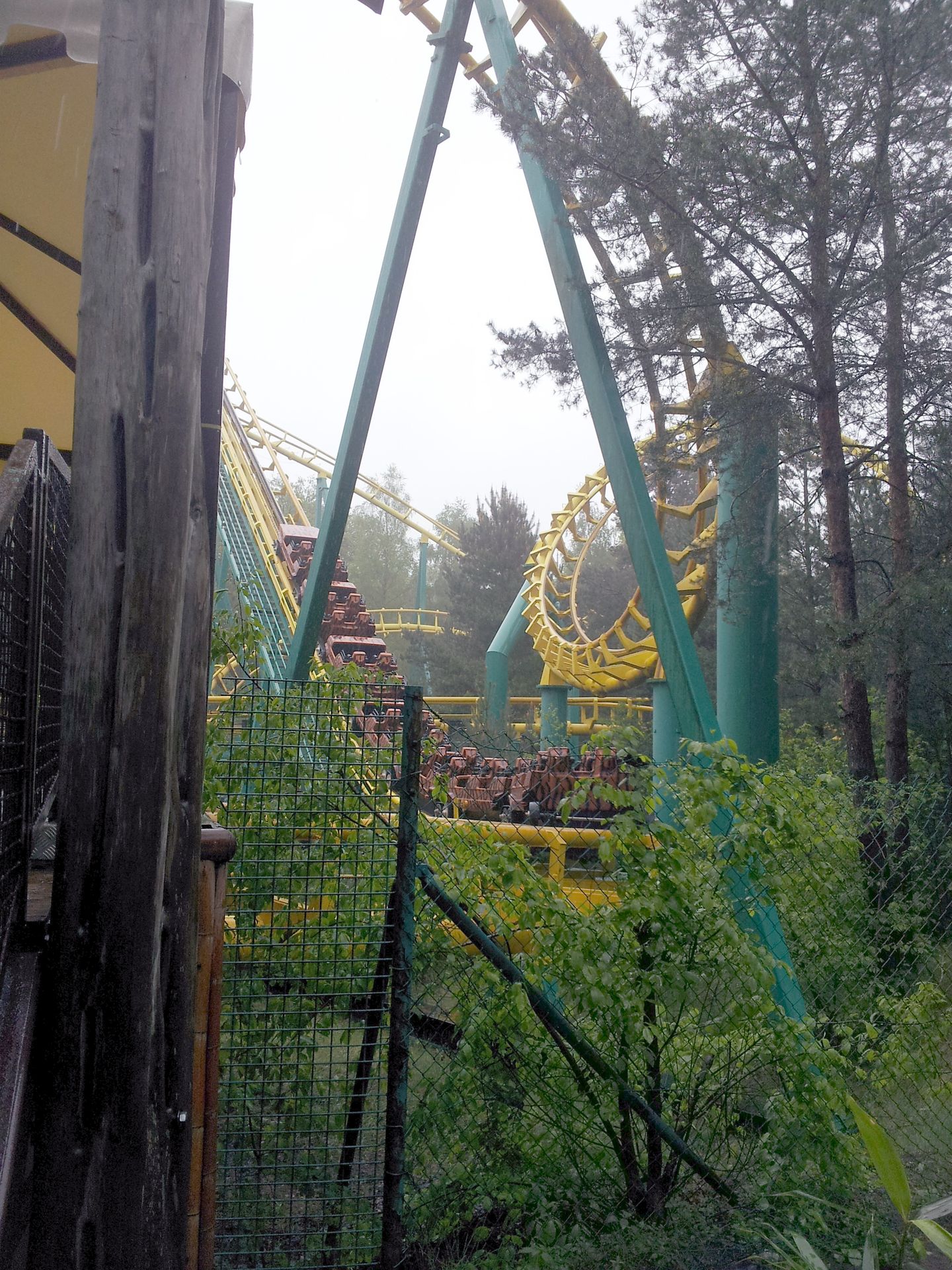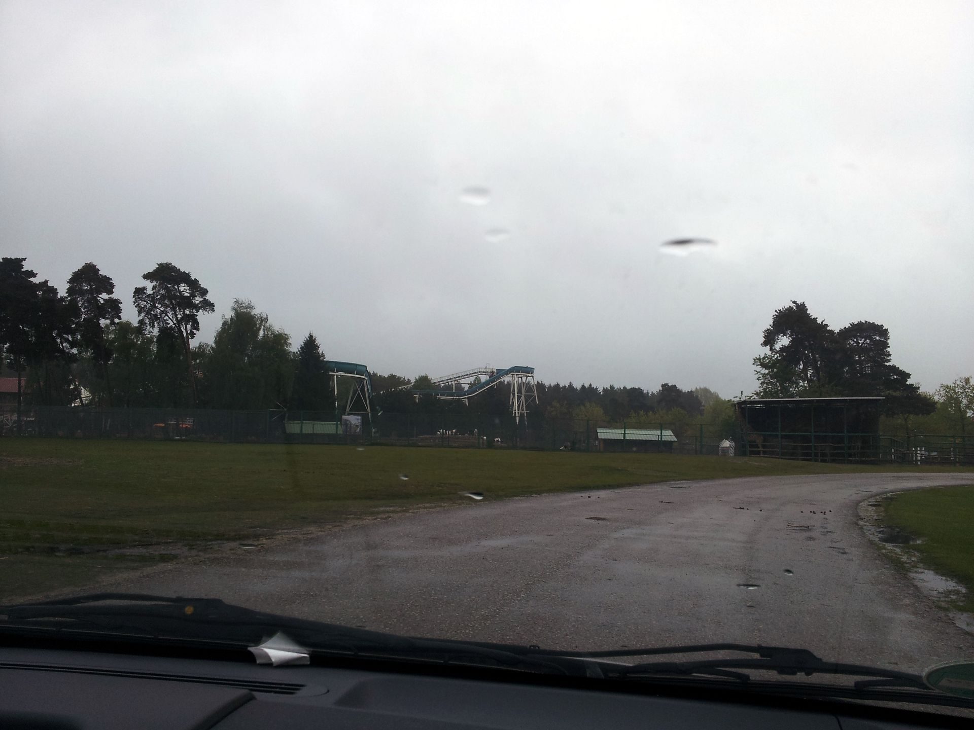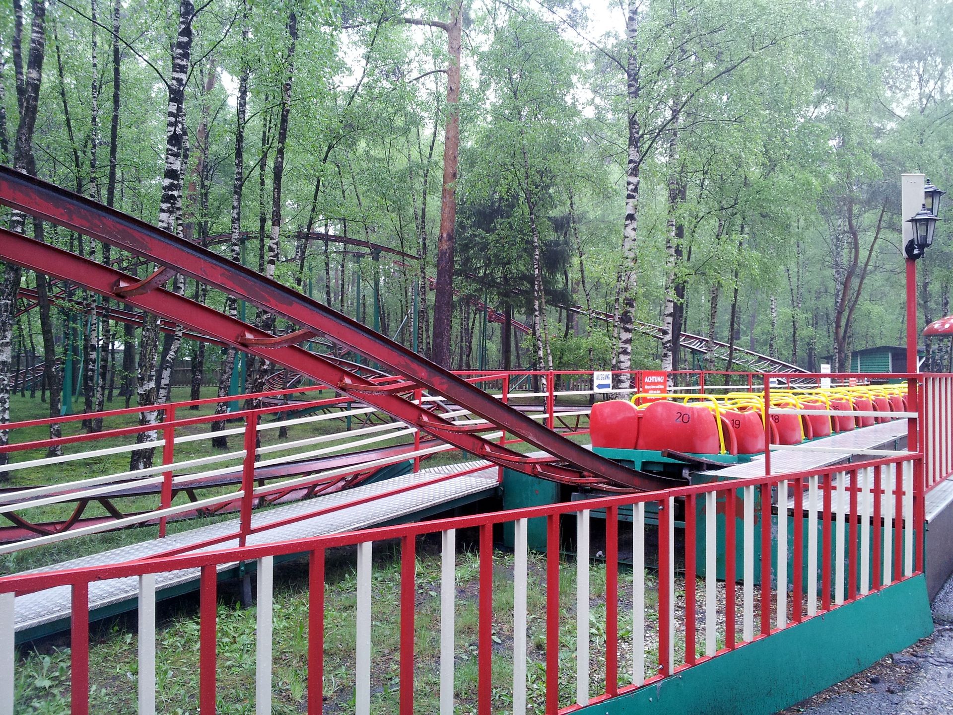 Nachdem wir einige Zeit im immer stärker werdenden Regen gewartet hatten, stellten wir uns schließlich bei der Terrasse eines Imbiss unter, bis Lone endlich aufkreuzte. Gemeinsam erkundeten wir den Park, doch es wirkte alles recht verlassen. Ich habe jedenfalls nicht eine Attraktion gesehen, auf der jemand gefahren ist. Und so war der Tivoli-Coaster wie befürchtet aufgrund des Regens außer Betrieb. Auch die Vekoma-Schleuder hatten Markus und ich schon so gut wie abgeschrieben, denn als wir gekommen waren, stand der Zug am Fuße des Lifthills und am Eingang hing ein Schild, dass die Bahn wegen Wartungsarbeiten für etwa 30 Minuten geschlossen wäre. Als wir nun wieder zurück kamen, hatte sich an der Situation nichts geändert. Von den angeblichen Wartungsarbeiten war auch nichts zu sehen, und so gaben wir die Hoffnung auf einen Count in diesem Park endgültig auf. Nach nicht einmal einer Stunde machten wir uns also unverrichteter Dinge und deutlich vor dem Zeitplan wieder auf den Weg nach Hause.