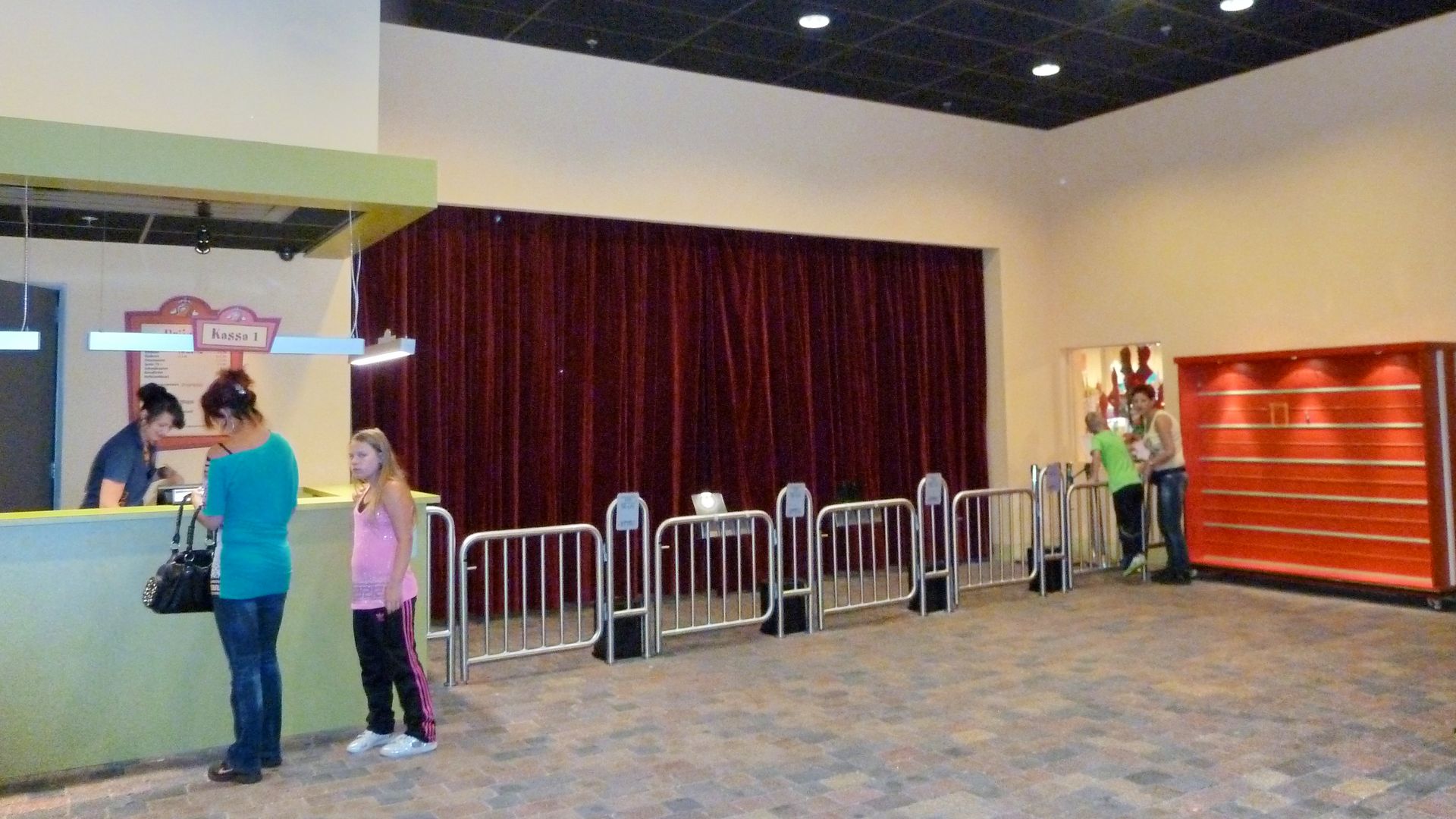 Eingangsbereich: Links die Theke ist die Kasse. Rechts der Vorhang wird zur Parköffnung zur Seite gefahren und man kann den Park betreten.