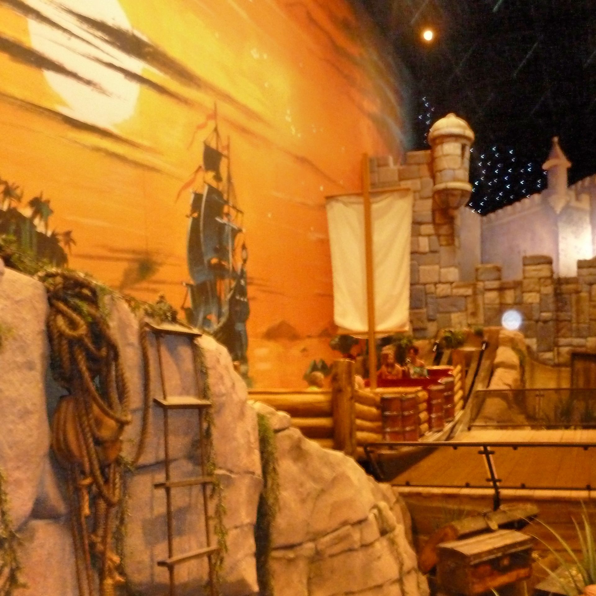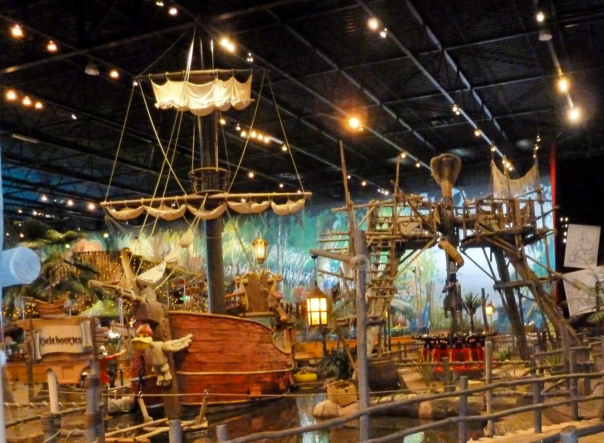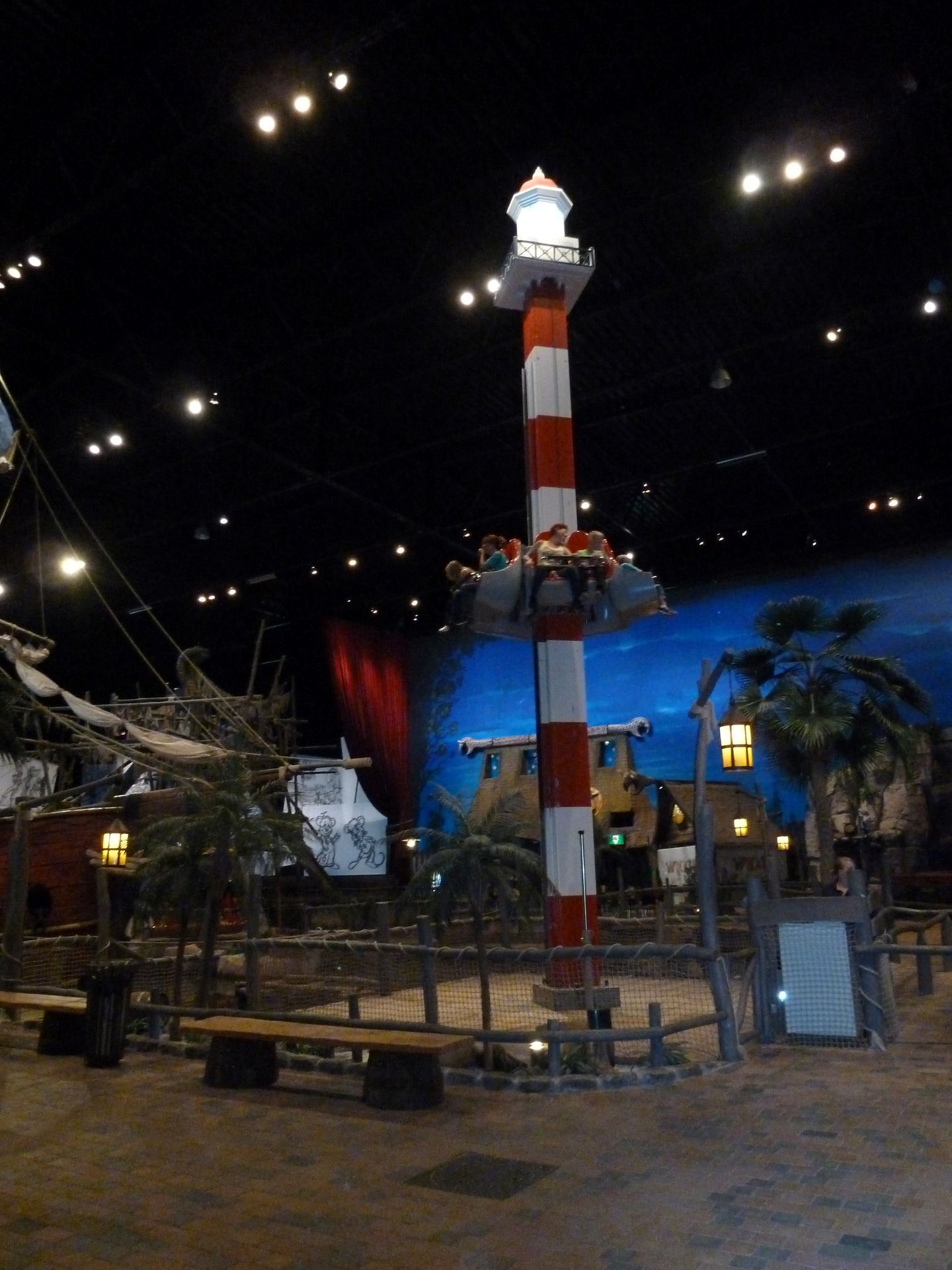 In der Mitte der Halle befindet sich dieser kleine Turm. Auch findet man hier eine kleine Wasserfläche samt Piraten-Spielschiff, Flossen und Bumber Booten.