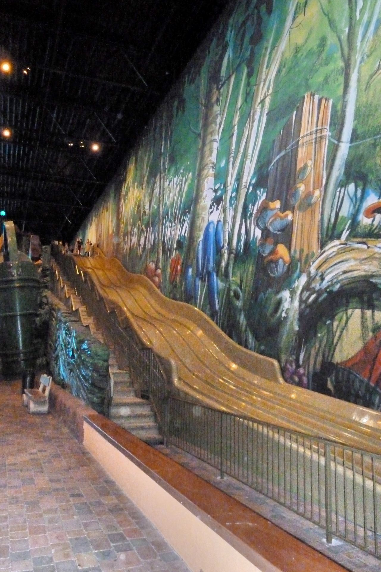 An der Rückseite der Halle befindet sich diese Rutsche. Unter dem höheren Ende befindet sich das Selbstbedienungs Restaurant. Dahinter befindet sich dann noch ein Kletter-Baumhaus.