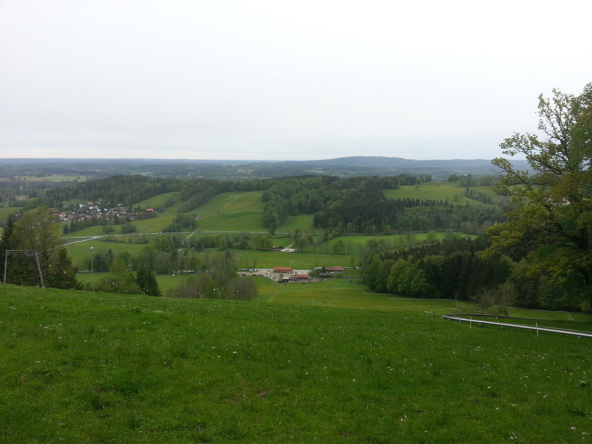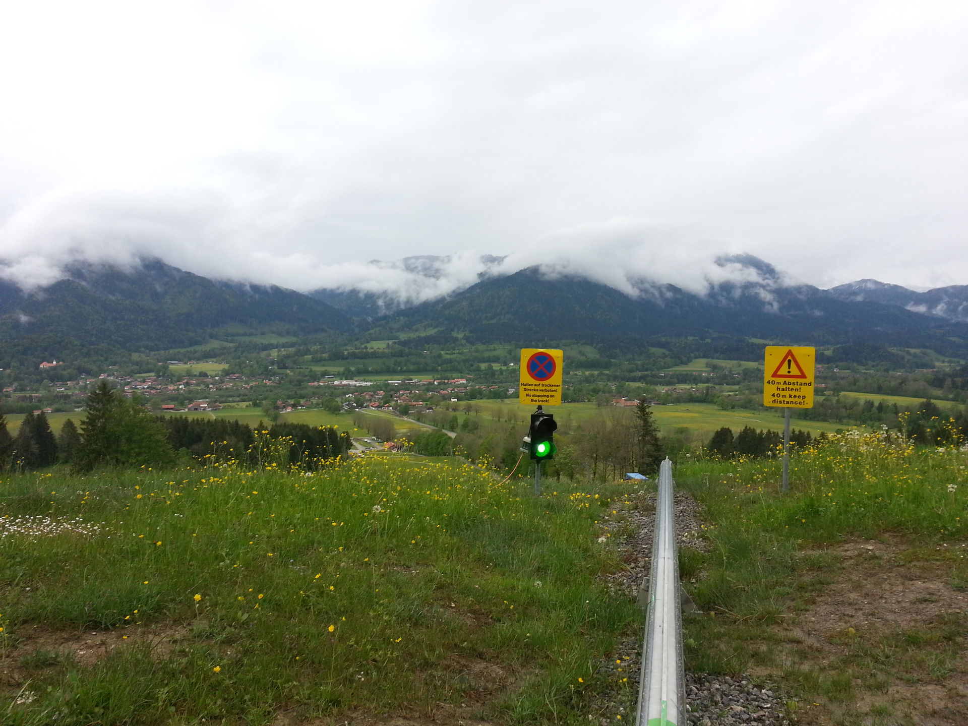 Die Fahrt ist angenehm lang und ganz ok; die durchgängig hübsche Aussicht auf viel grünes Voralpenland (bei guter Sicht bis nach München) entschädigt für die Abzüge beim Fahrkomfort. So viel gebremst wie noch nie, da die Bremsen auf der restfeuchten Strecke aber halt auch kaum griffen wurd's trotzdem ganz schön flott.