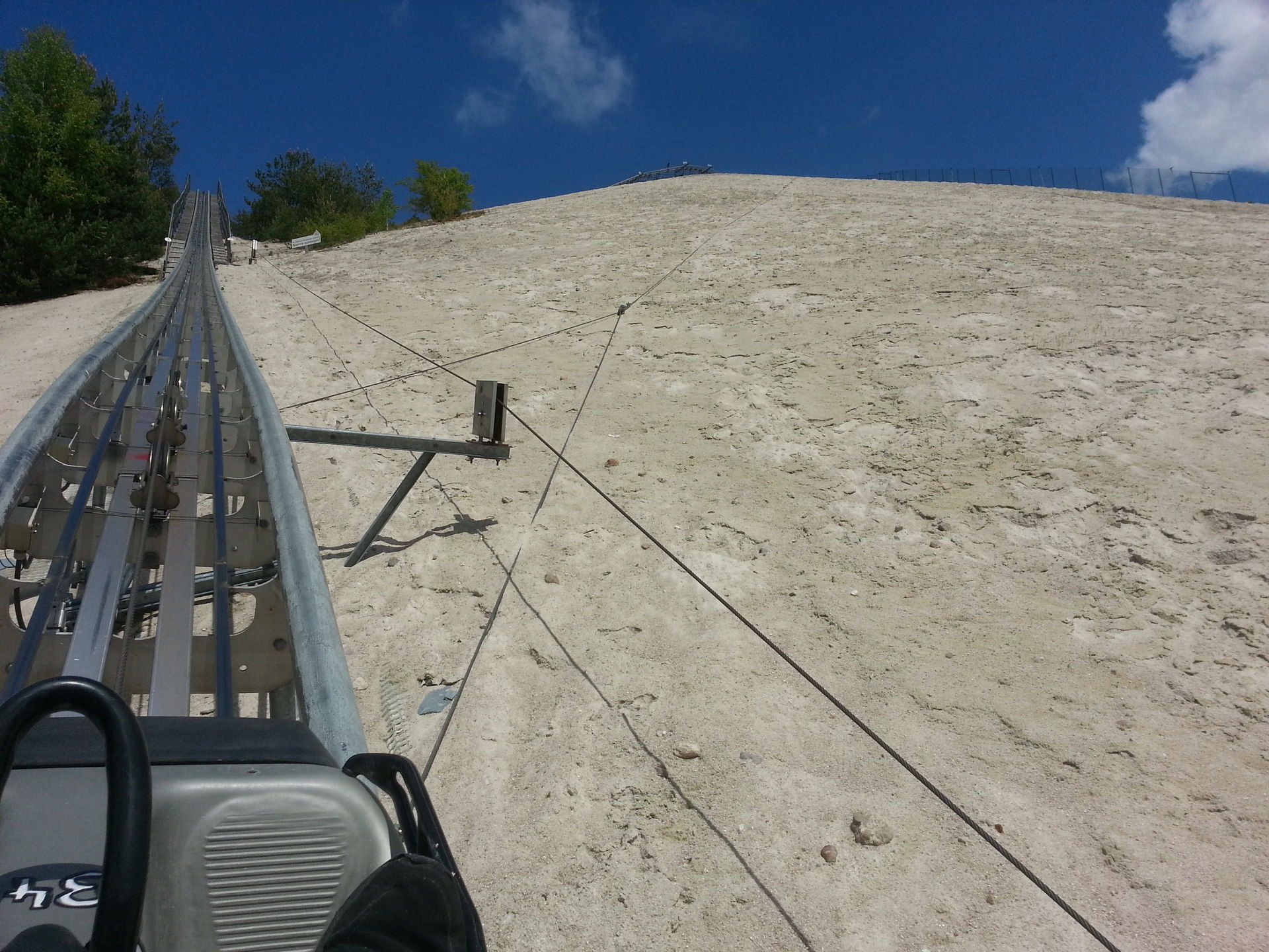 Hochbefördert wird man hier mal nicht mit Kette, sondern per eingehaktem Skilift (die Anlage kann im Winter tatsächlich binnen kürzester Zeit durch Umkehr der Lift-Laufrichtung zu einem Skilift umgebaut werden).