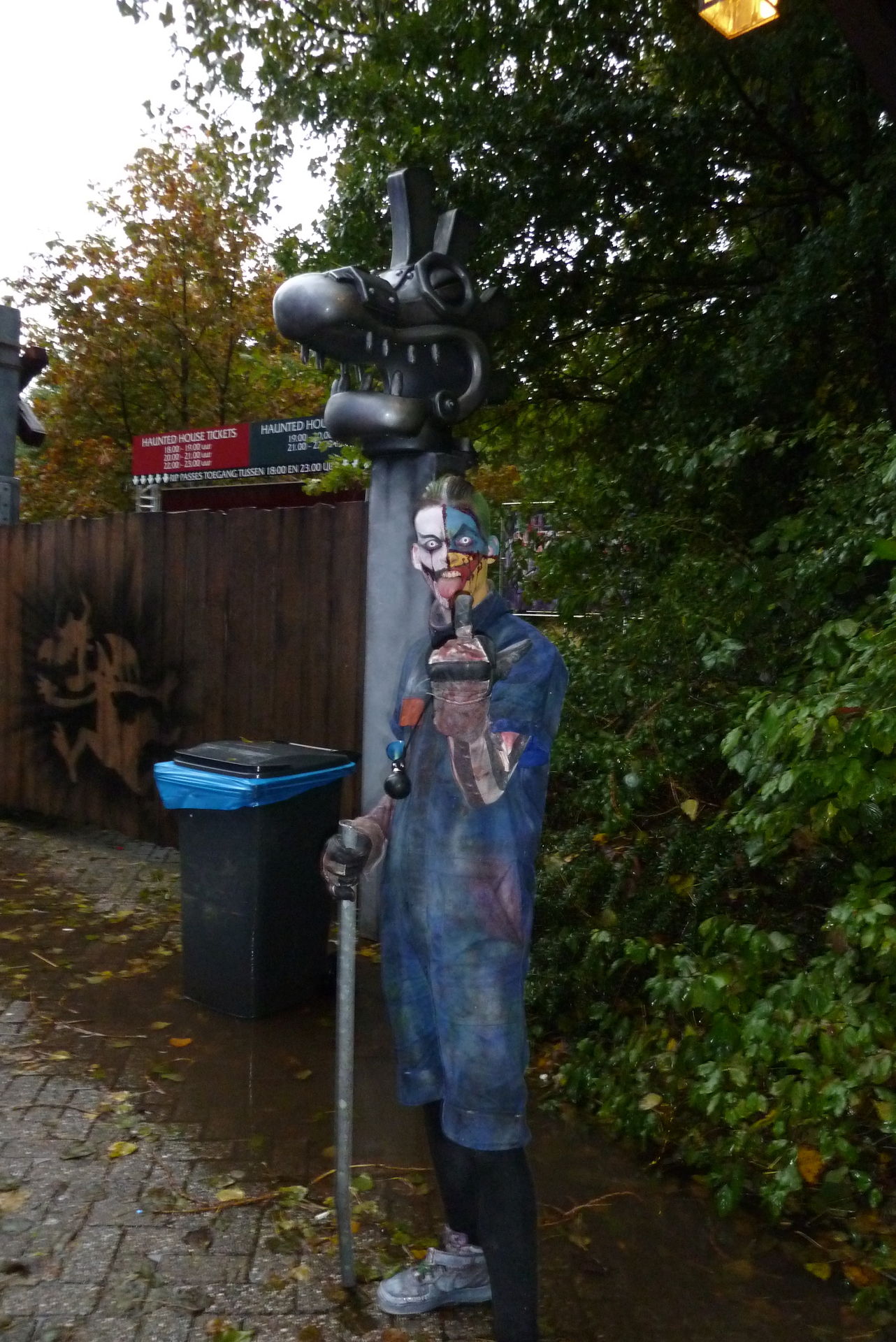 Früher war der Main Icon Dr. Shock, dann kam Eddie. Um zu sehen, wie die Story weiter ging und wie das ganze Event sich weiter Entwickelt hat, ging es am 13.10.2013 mal wieder in die Niederlande. Die erste Überraschung ereignete sich schon am Parkeingang, bzw. eigentlich schon vorher. Walibi öffnet inzwischen an Halloween Tagen nichtmals mehr die Kassen. Eintrittskarten können nur noch online erworben werden. Sicherlich ein sinnvolles Mittel um Überfüllungen entgegen zu treten. Ansonsten war es ein regnerischer voller Freizeitpark Tag. Wenig Fahren und dabei noch stundenlanger Regen - kein schöner Freizeitpark Tag.