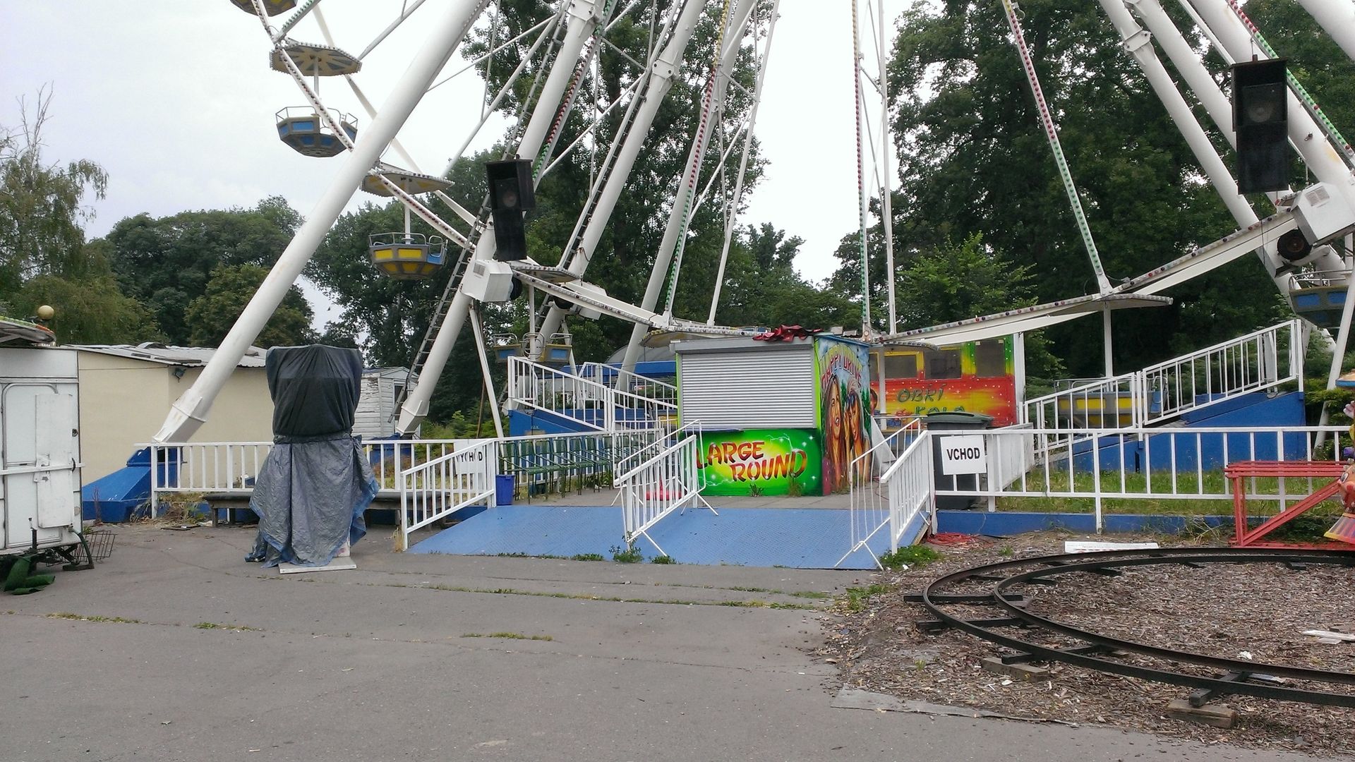 In der Hoffnung ein paar Minuten später würde noch jemand kommen, hab ich eine kleine Fotorunde durch das verlassene Gelände gemacht, wobei mir aufgefallen ist, dass hier doch einige Attraktionen, die eigentlich ganzjährig aufgebaut sein sollten, fehlen, wie z.B. der Twister, vom dem weit und breit keine Spur war. Alles andere machte einen sehr heruntergekommenen und versifften Eindruck. Kaum zu glauben, dass hier zweimal im Jahr, wenn die Kirmessen stattfinden, Hochbetrieb ist: