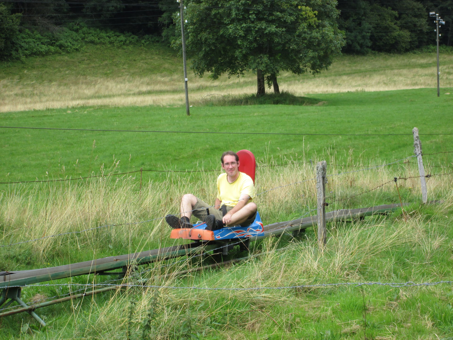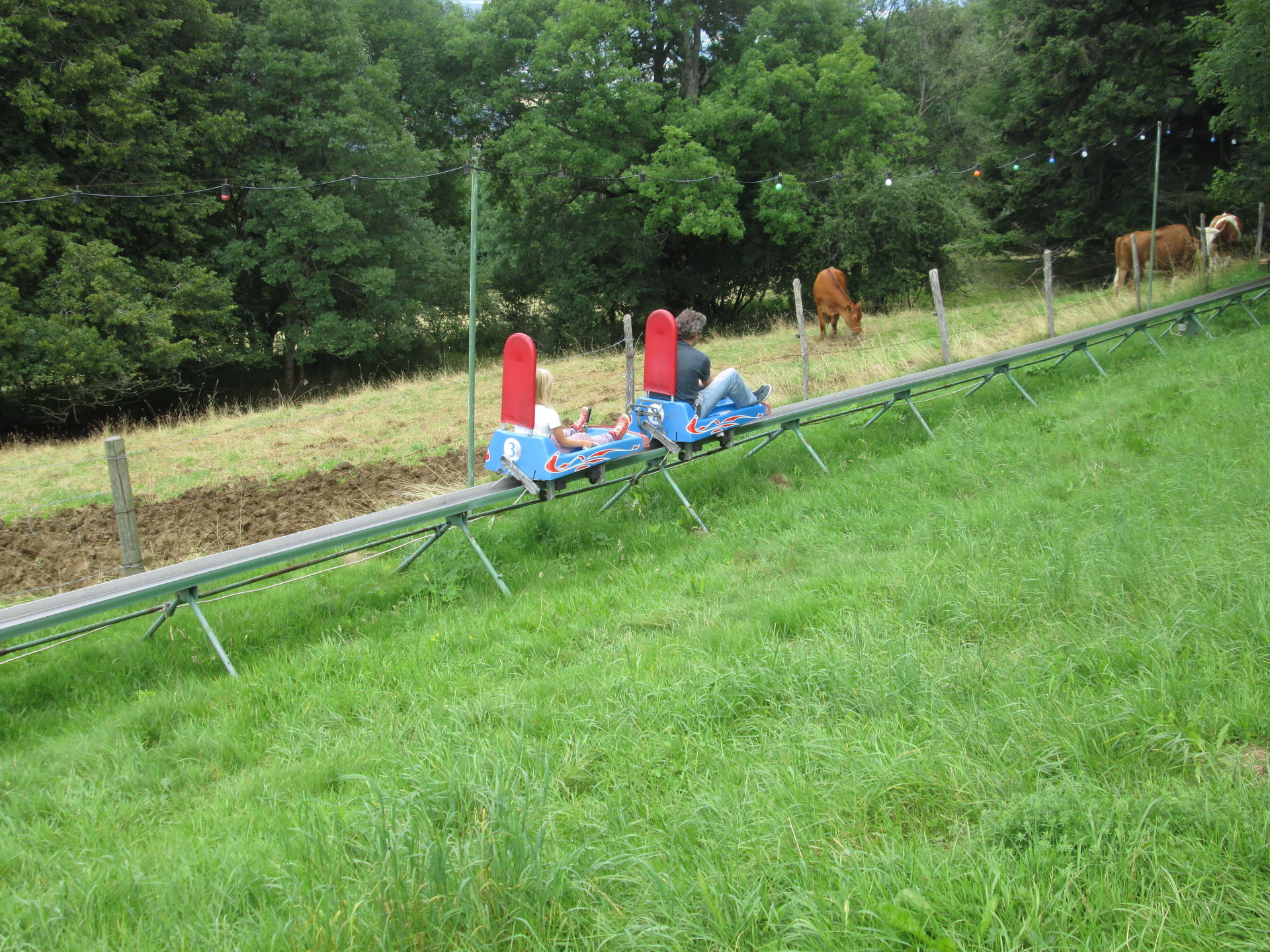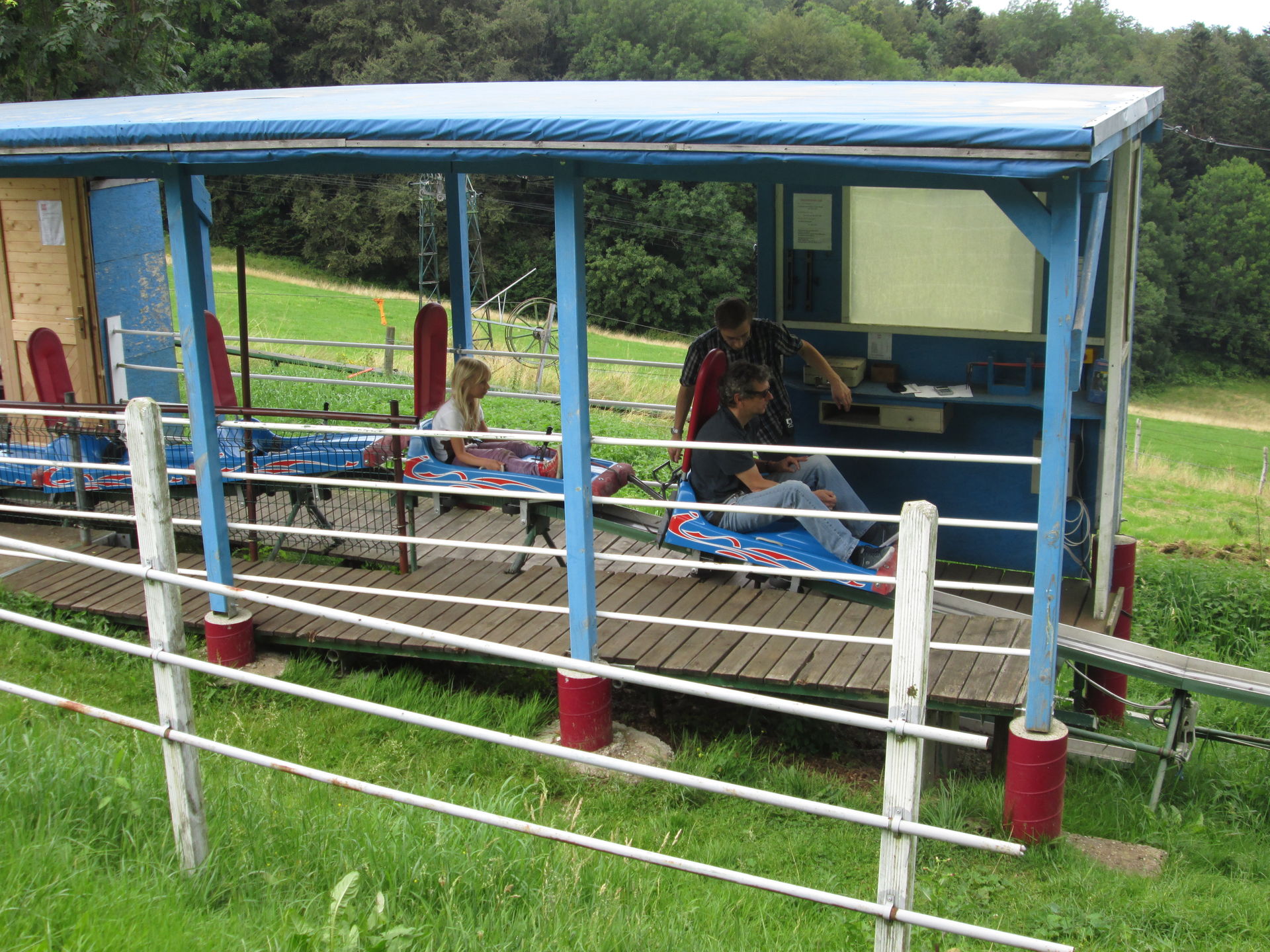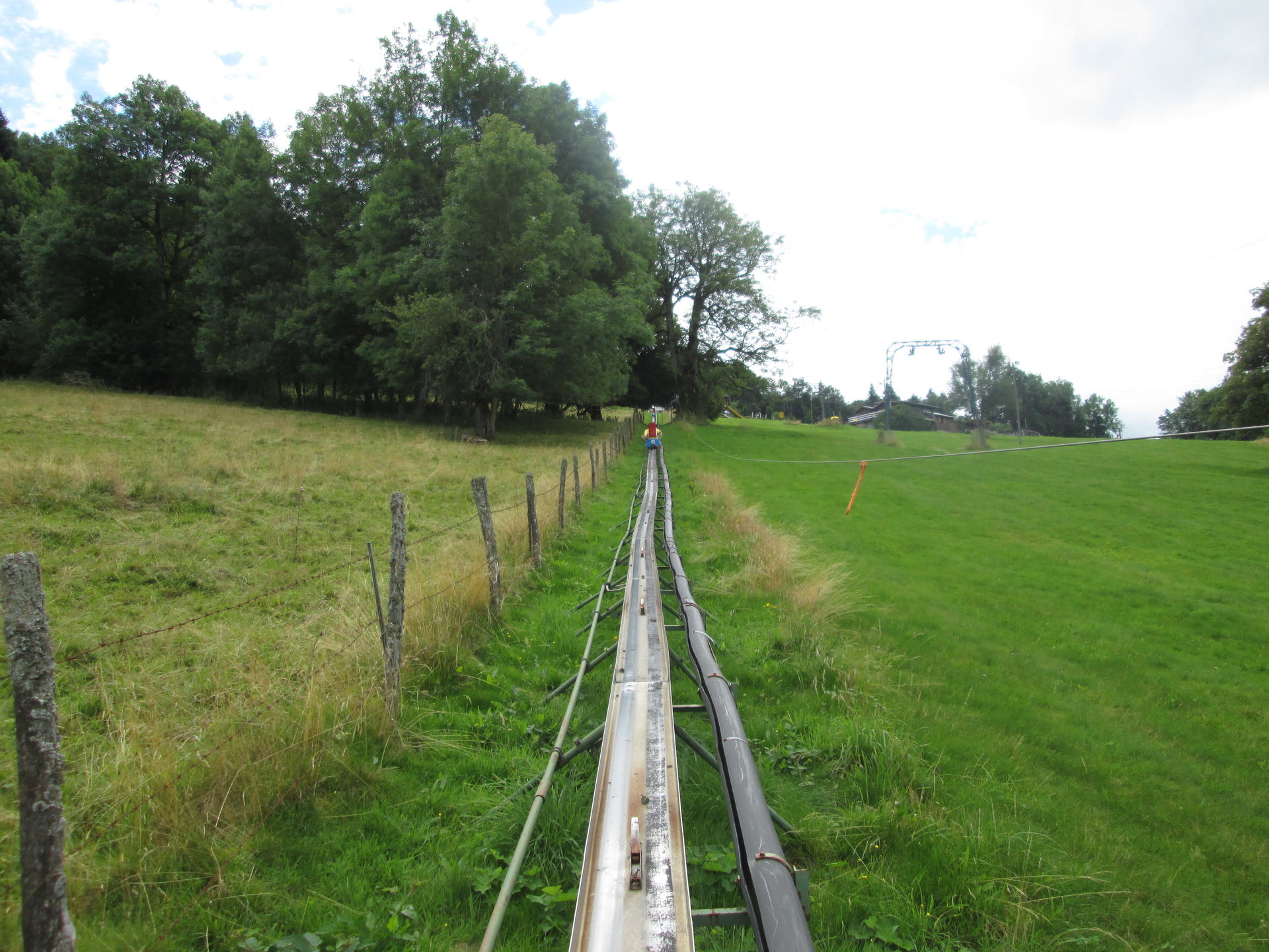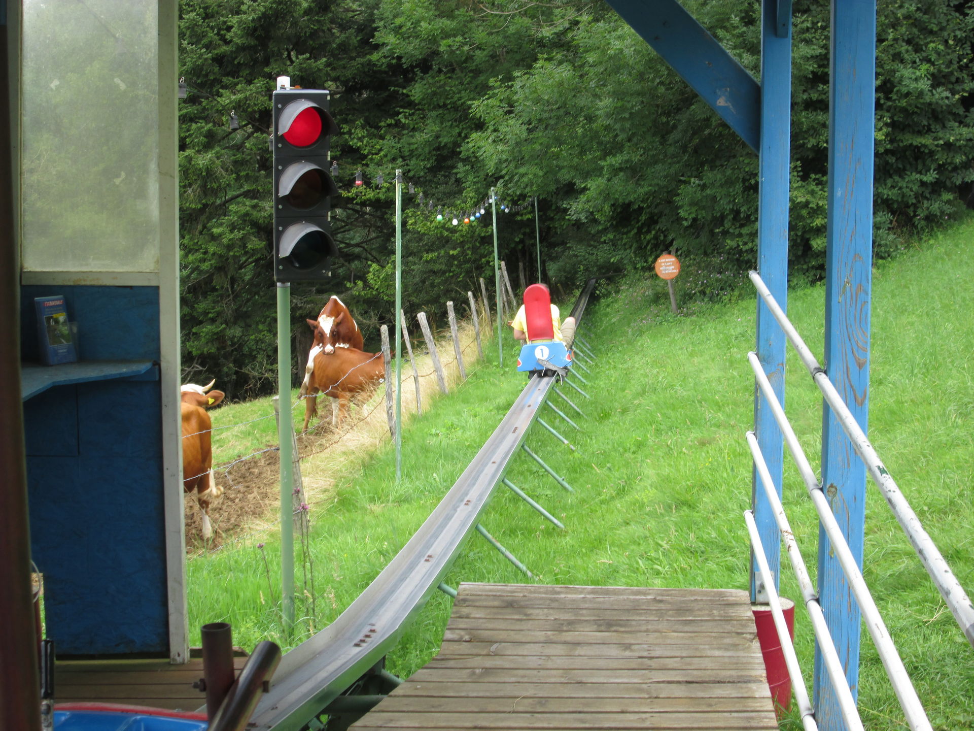 Bezahlt wird der Fahrtpreis direkt beim Einstieg in die Bobs. Wir entschieden uns gleich mehrere Fahrten zu machen, da man ab fünf gekauften Tickets statt 4¤/Fahrt nur 3¤/Fahrt zahlt. Einer der beiden Mitarbeiter nahm sich einen Schlitten und fuhr voraus, muss er doch am Ende der Strecke händisch dafür Sorge tragen, dass die Schlitten im Lift eingefädelt werden. Die Startampel lässt wirklich ausreichend Abstand zum Vordermann entstehen, sodass man hier vermutlich niemals das Problem haben wird, hinter zu langsamen Vorausfahrern zu "hängen". Springt diese dann auf grün, geht es zunächst gemächlich an der Kuhweide entlang in Richtung Wald. Dort verschwindet die Strecke und von außen ist sie nun kaum mehr einsehbar. Die ersten Kurven lassen gleich ein komisches Fahrgefühl entstehen, neigen sich doch die Schlitten den Fliehkräften folgend in den Kurven leicht nach außen. Hinzu kommt ein gefühlt unkontrolliertes Schlingern des Schlittens, was für ein auf Sommerrodelbahnen wirklich ungewohntes Gefühl der Unsicherheit sorgt.