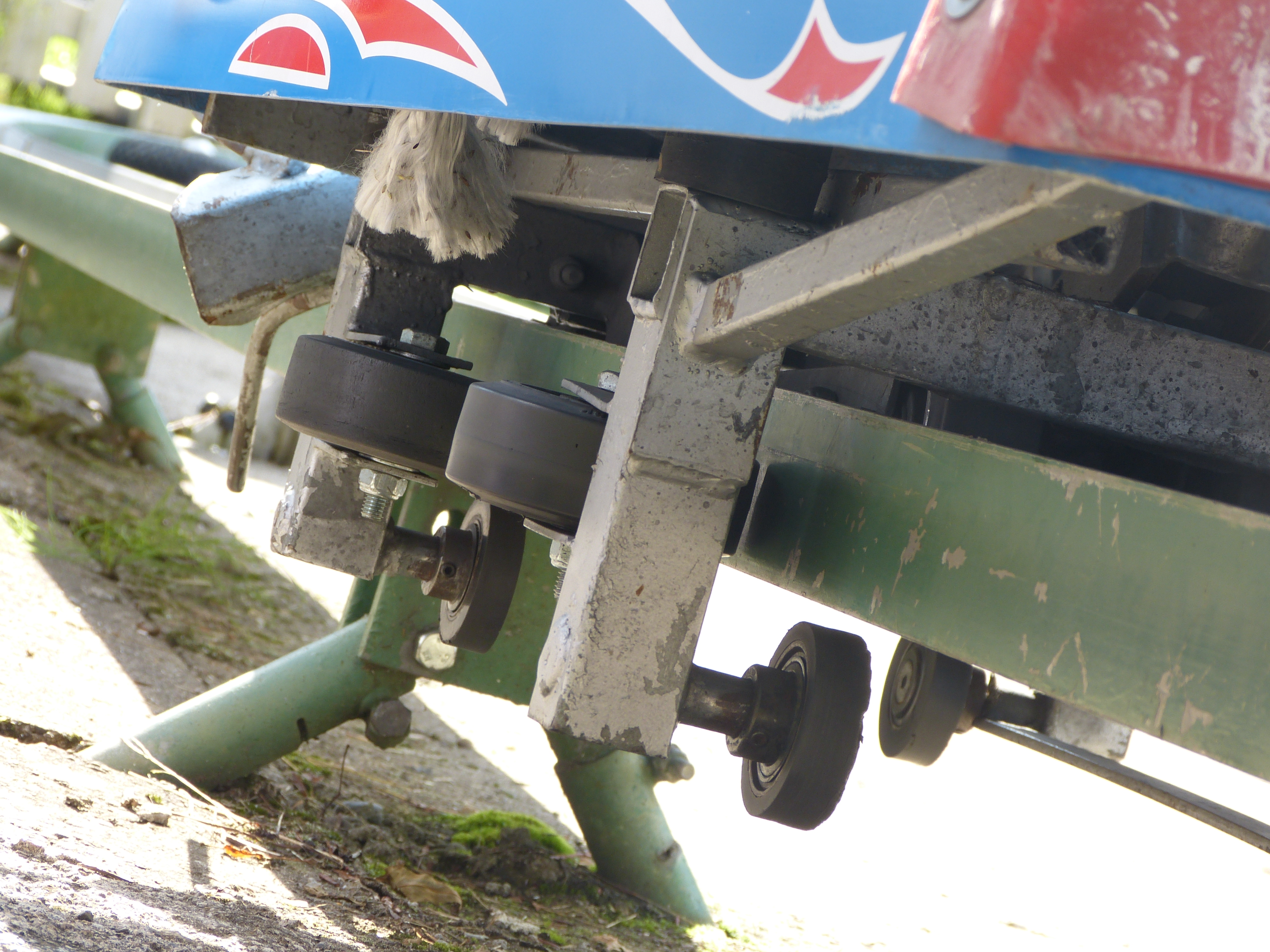 Damit der Schlitten auf dem Lift rollt, wird der Steurknüppel mittels Metallgestänge in Fahrposition gehalten.