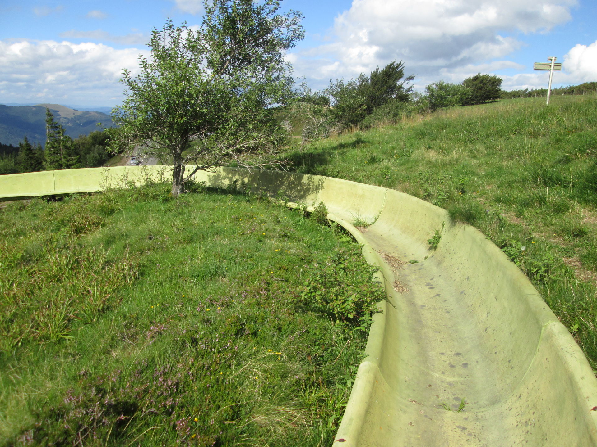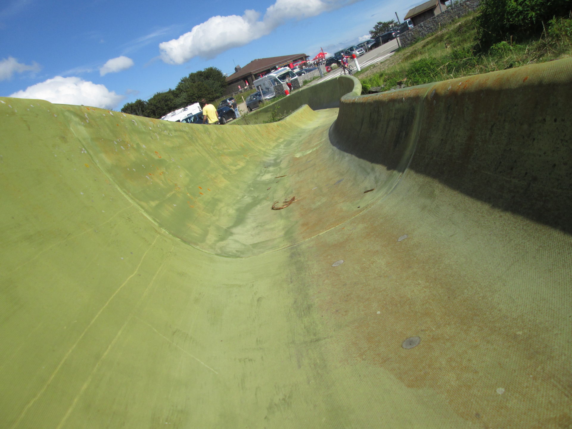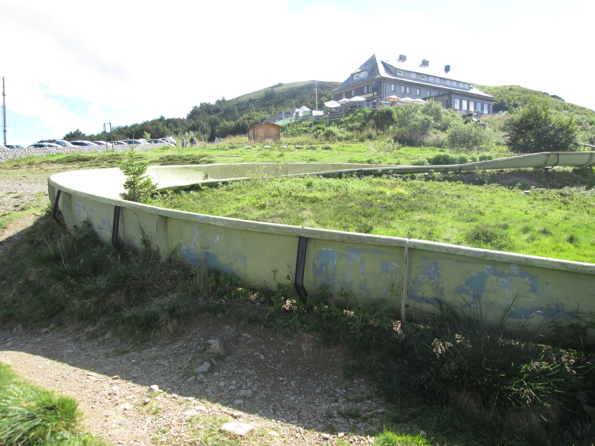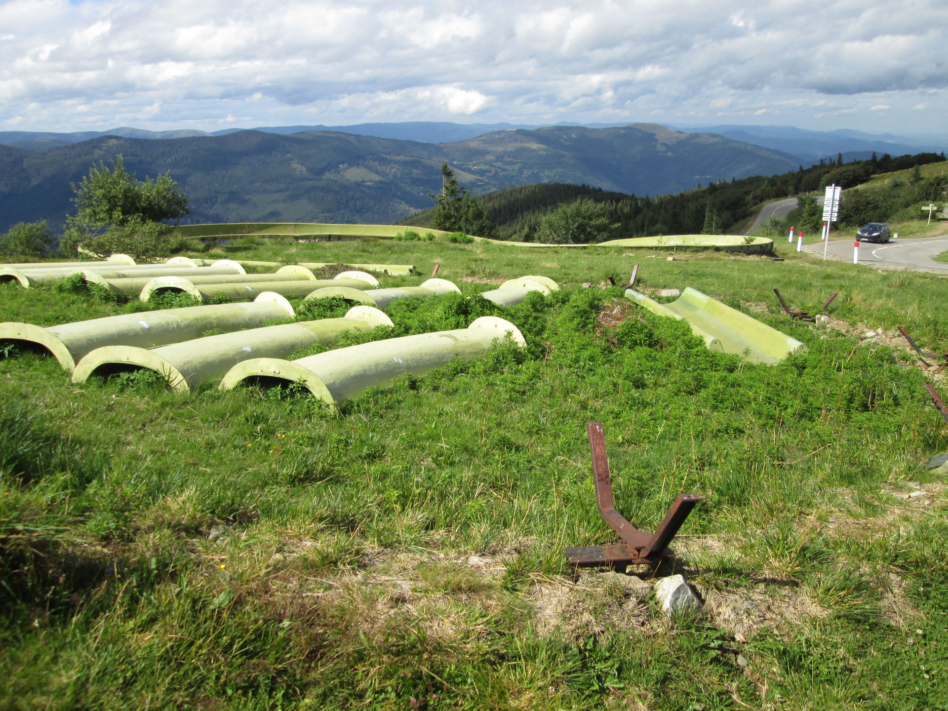 Auf dem Grand Ballon angekommen, war hier die typische Fülle aus Aussichtstouristen, Bikern, Quäl-dich-Rennradlern und Wanderern. Ich bin selbst schon ein paar Mal hier vorbeigekommen, jedoch hatte die Sommerrodelbahn hier immer geschlossen. Nun also ein neuer Versuch. Doch schon als wir auf den Parkplatz einbogen, war zu erkennen, dass die Sommerrodelbahn nicht lief. Als wir dann direkt an den Einstieg der Bahn gingen, wurde auch schnell klar, dass hier in Zukunft wohl auch kein Betrieb mehr stattfinden wird. Der Einstiegsbereich lag in Einzelteilen demontiert auf der Wiese. Also erkundeten wir das Gebiet und machten ein paar Fotos des Lost Place, der gar keiner ist. Martin nutzte die Chance und drehte eine volle Runde auf der Bahn. Freilich zu Fuß, Schlitten standen ja keine zur Verfügung.