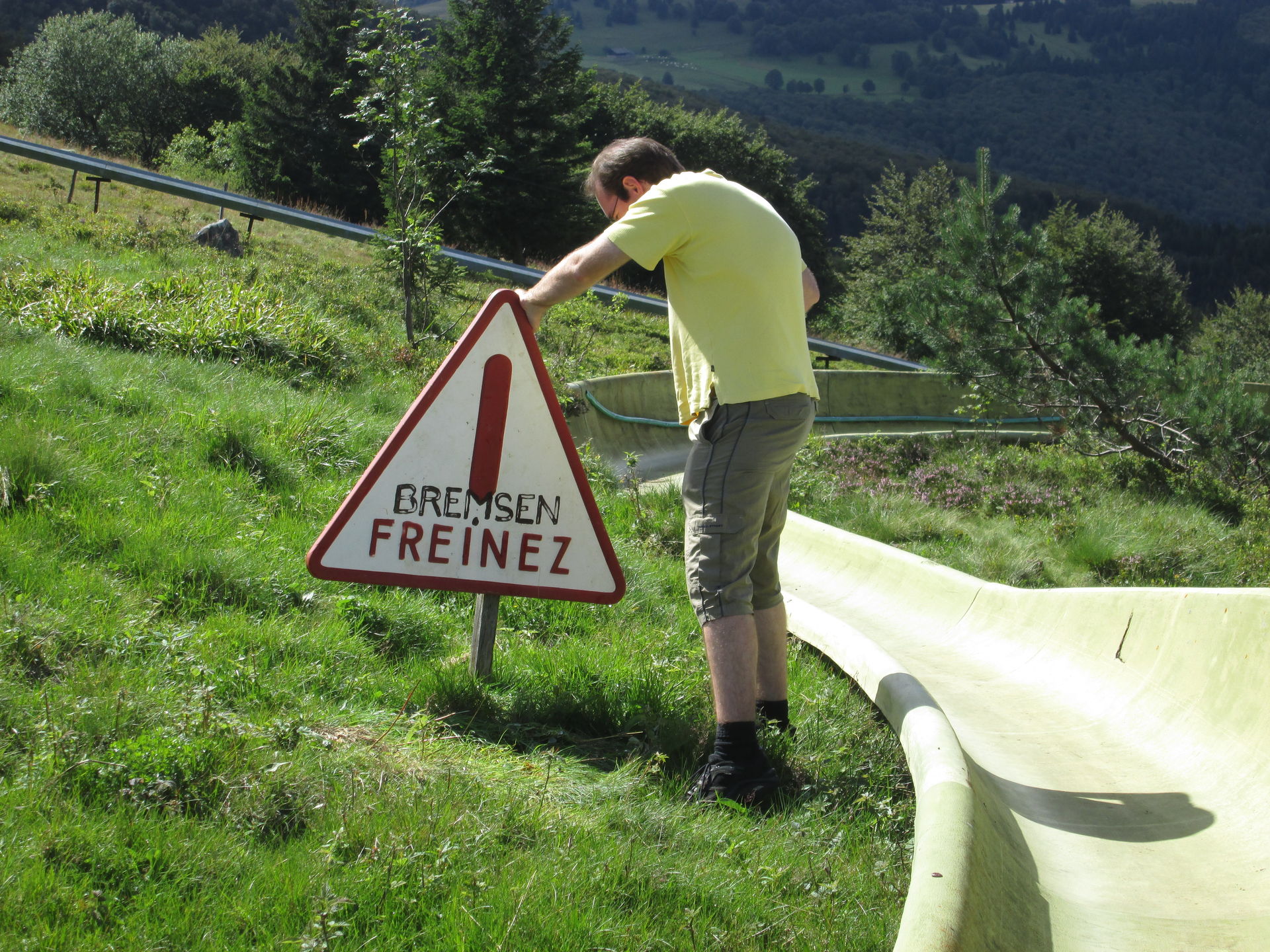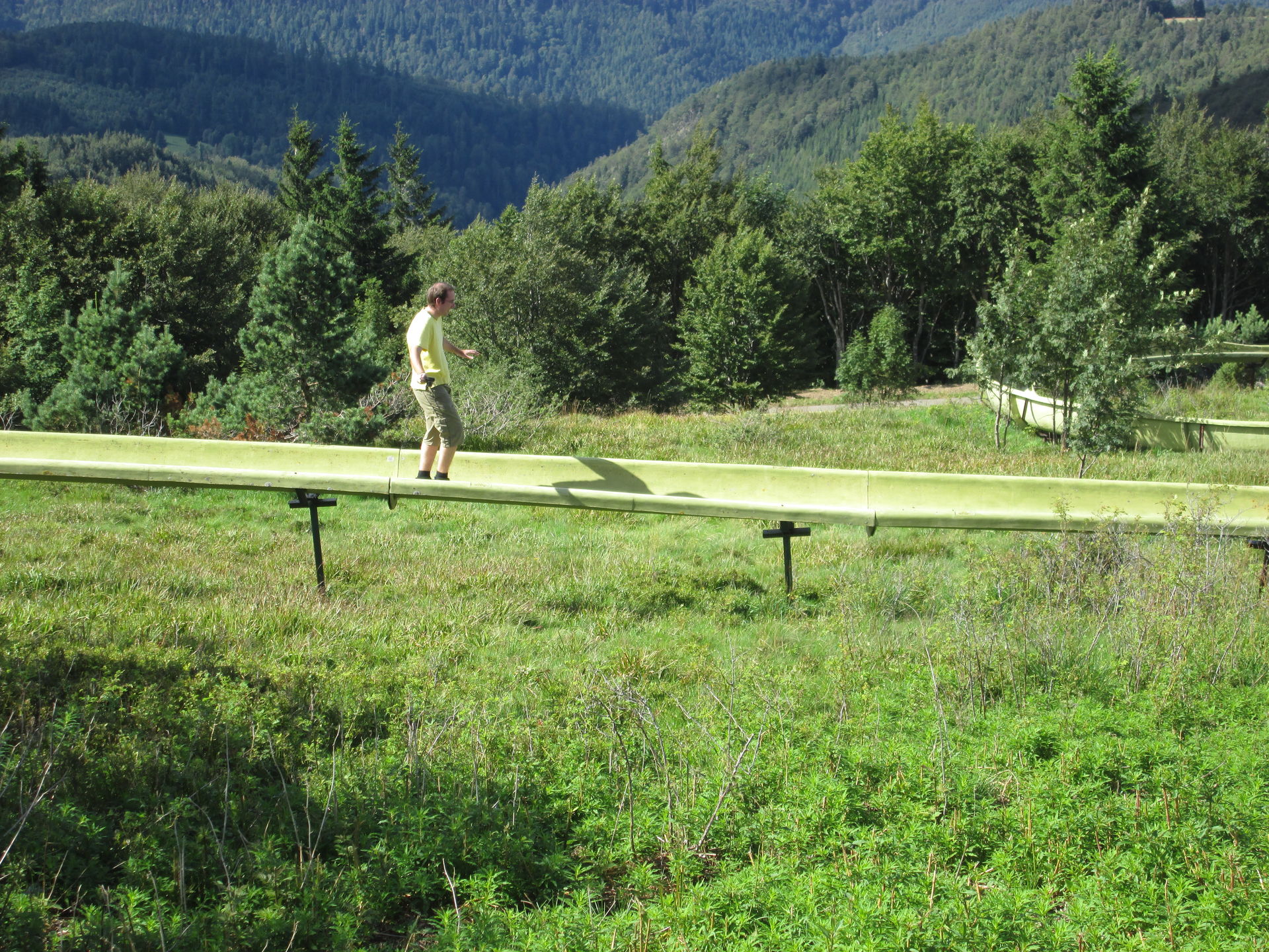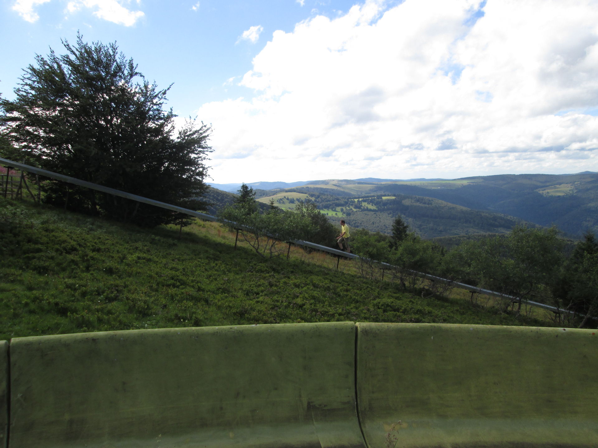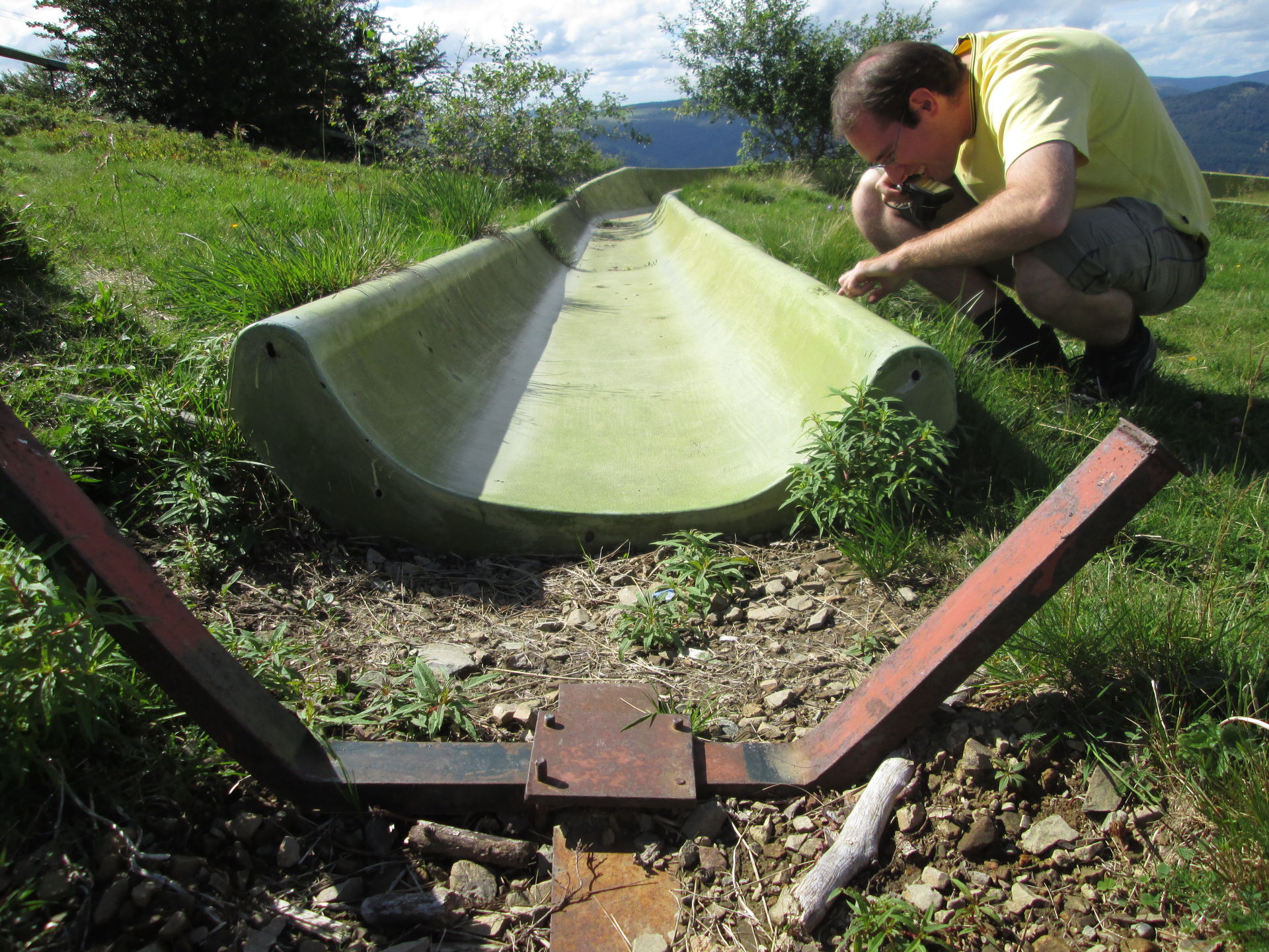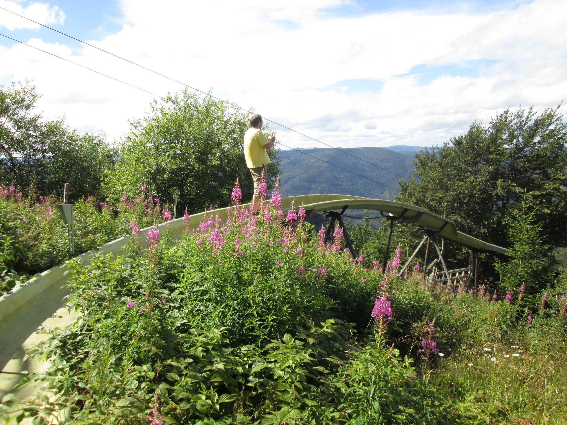 Auf dem Grand Ballon angekommen, war hier die typische Fülle aus Aussichtstouristen, Bikern, Quäl-dich-Rennradlern und Wanderern. Ich bin selbst schon ein paar Mal hier vorbeigekommen, jedoch hatte die Sommerrodelbahn hier immer geschlossen. Nun also ein neuer Versuch. Doch schon als wir auf den Parkplatz einbogen, war zu erkennen, dass die Sommerrodelbahn nicht lief. Als wir dann direkt an den Einstieg der Bahn gingen, wurde auch schnell klar, dass hier in Zukunft wohl auch kein Betrieb mehr stattfinden wird. Der Einstiegsbereich lag in Einzelteilen demontiert auf der Wiese. Also erkundeten wir das Gebiet und machten ein paar Fotos des Lost Place, der gar keiner ist. Martin nutzte die Chance und drehte eine volle Runde auf der Bahn. Freilich zu Fuß, Schlitten standen ja keine zur Verfügung.