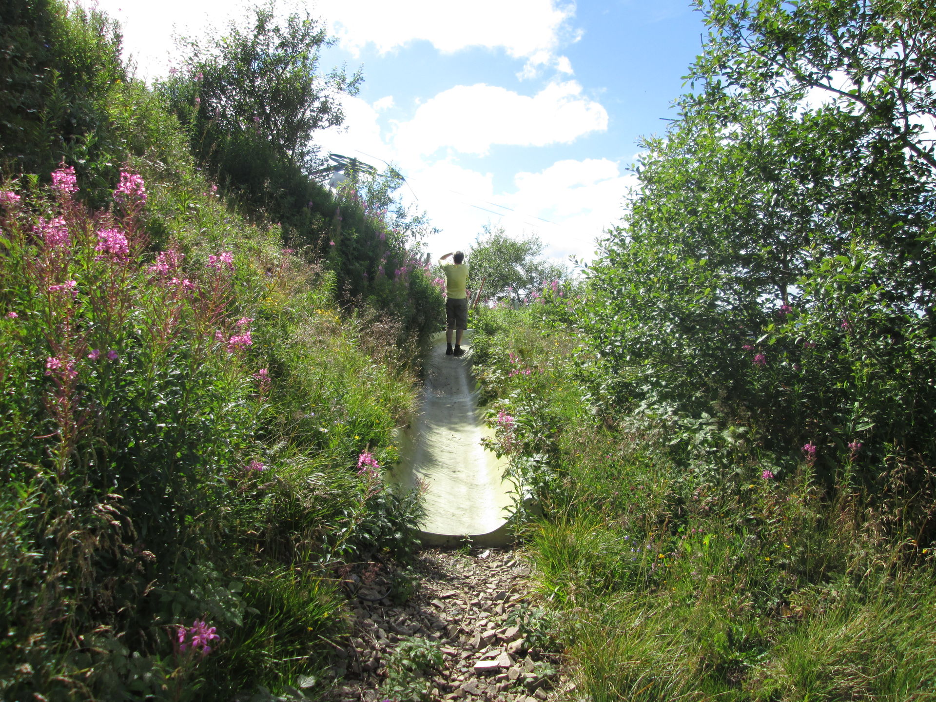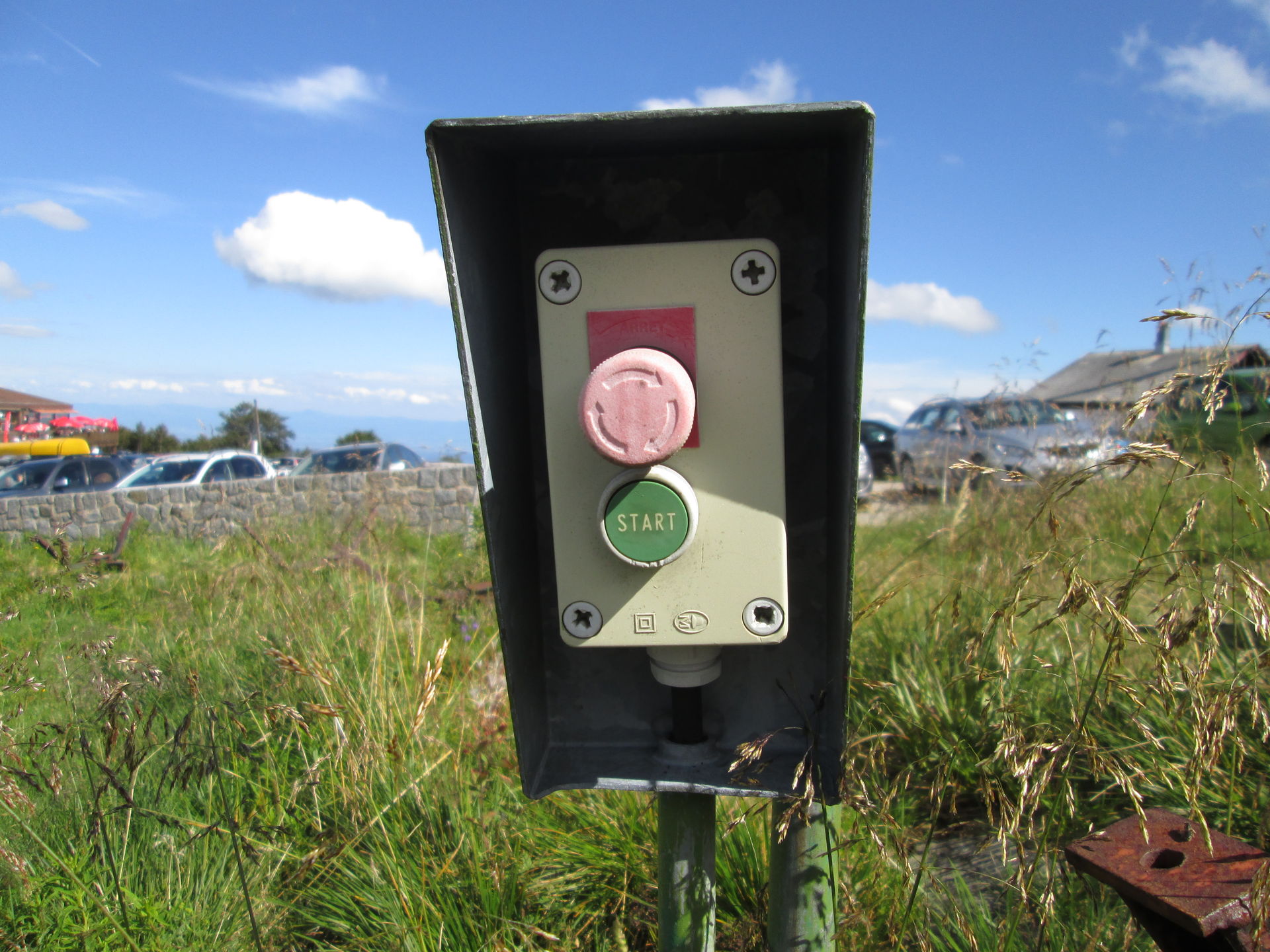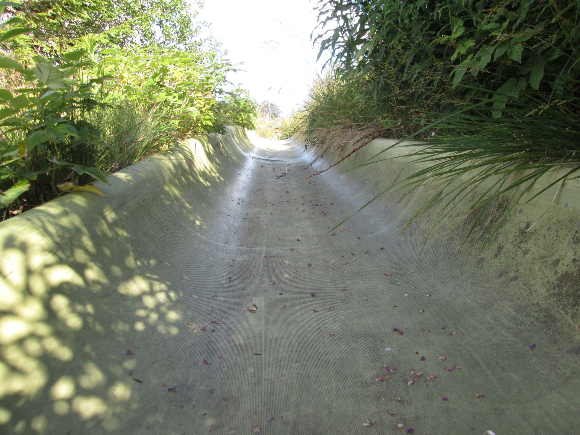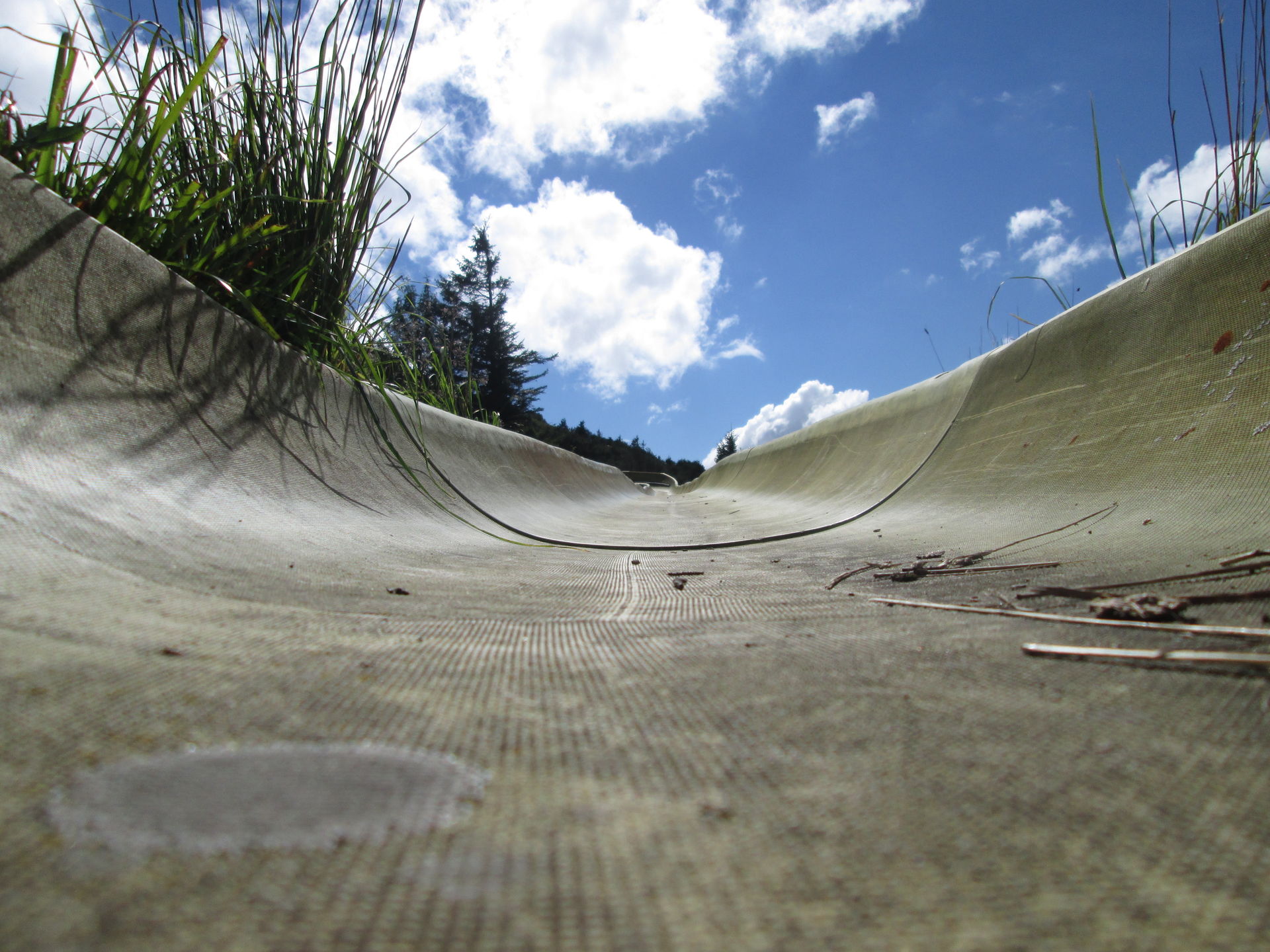 Auf dem Grand Ballon angekommen, war hier die typische Fülle aus Aussichtstouristen, Bikern, Quäl-dich-Rennradlern und Wanderern. Ich bin selbst schon ein paar Mal hier vorbeigekommen, jedoch hatte die Sommerrodelbahn hier immer geschlossen. Nun also ein neuer Versuch. Doch schon als wir auf den Parkplatz einbogen, war zu erkennen, dass die Sommerrodelbahn nicht lief. Als wir dann direkt an den Einstieg der Bahn gingen, wurde auch schnell klar, dass hier in Zukunft wohl auch kein Betrieb mehr stattfinden wird. Der Einstiegsbereich lag in Einzelteilen demontiert auf der Wiese. Also erkundeten wir das Gebiet und machten ein paar Fotos des Lost Place, der gar keiner ist. Martin nutzte die Chance und drehte eine volle Runde auf der Bahn. Freilich zu Fuß, Schlitten standen ja keine zur Verfügung.