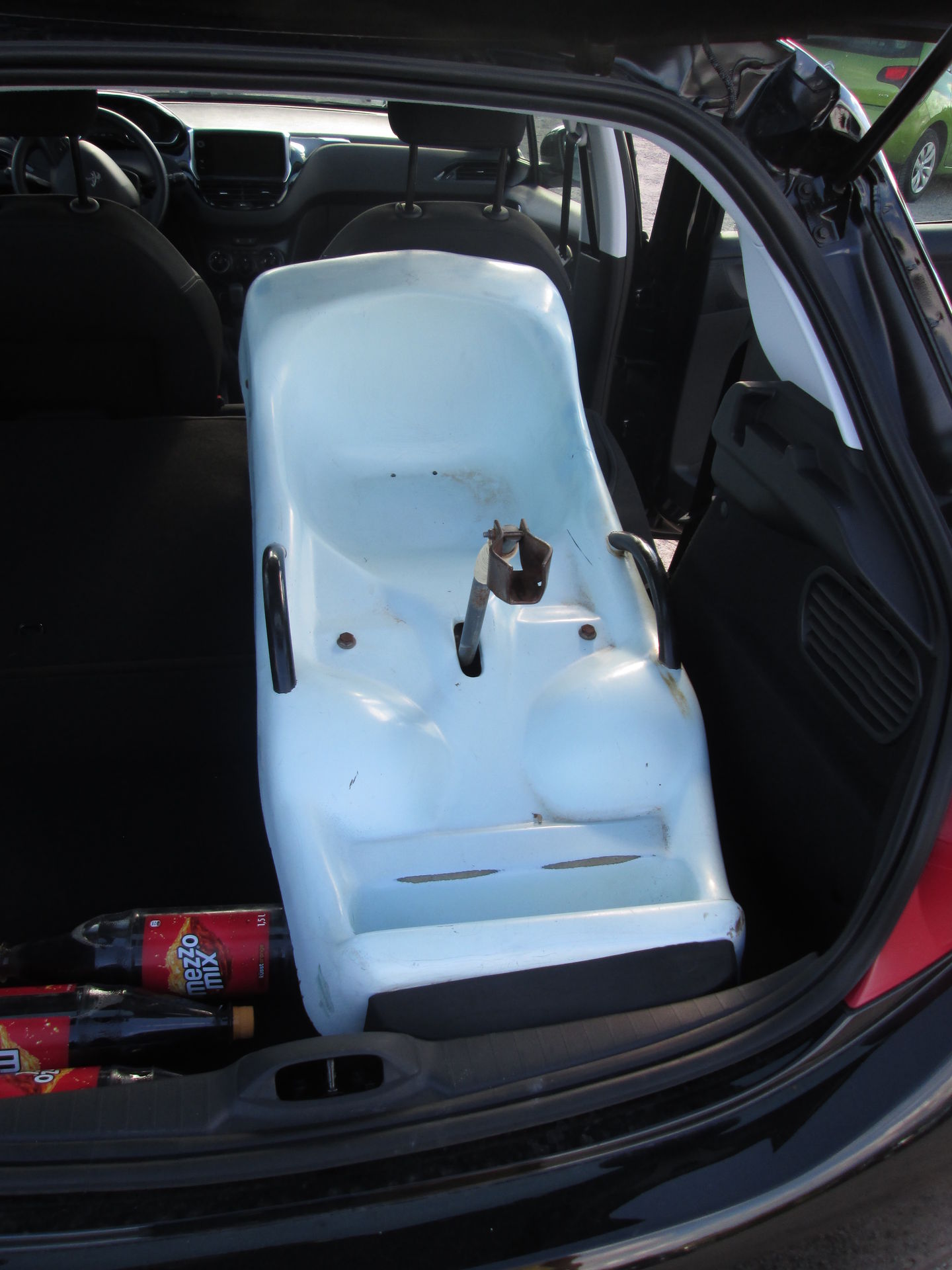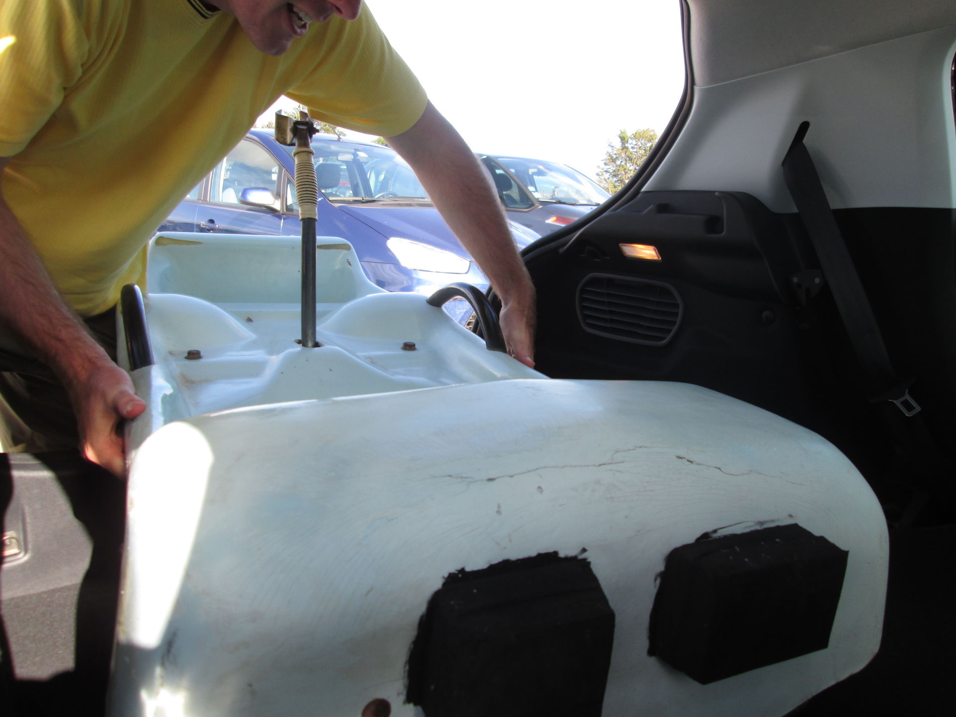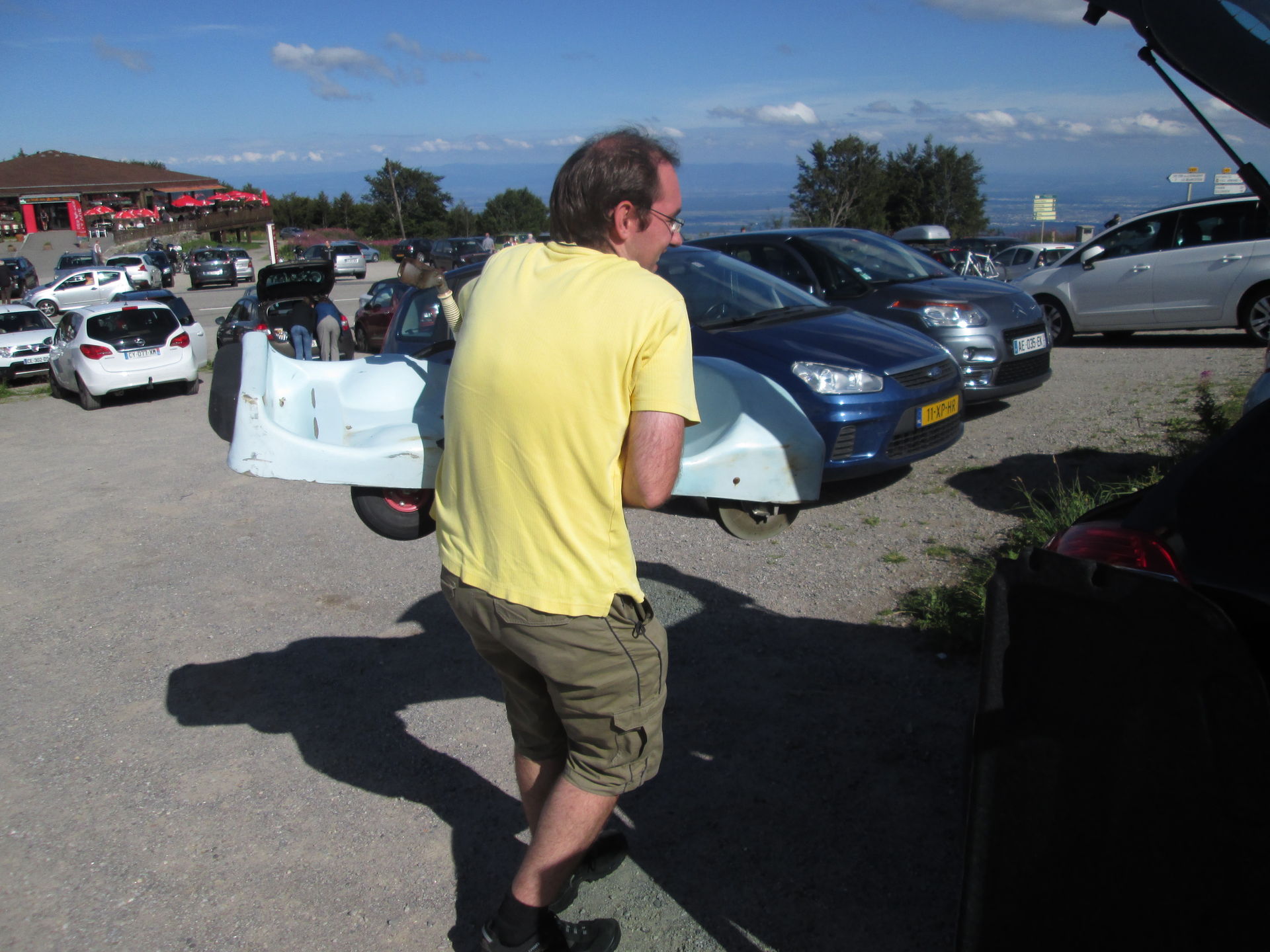 Nach der Fotorunde ging es zurück zum Ausgangspunkt und wie es der Zufall wollte, stand die Tür des kleinen Wartungshäuschens der Bahn offen. Wie sich später herausstellte, werkelte darin der Besitzer der Anlage. Wir kamen mit diesem ins Gespräch und er erzählte uns, dass die von BobFrance gebaute Sommerrodelbahn bereits seit 1987 in Betrieb war. Nun lohnt sich der Weiterbetrieb nicht mehr, denn im Gegensatz zur Lage im nahen Le Markstein würden die insgesamt fünf Anrainergemeinden des Grand Ballon die Rodelbahn nicht unterstützen. Nun würde sie eben abgebaut werden. Er bot uns die gesamte Anlage auch für einen Euro an, aber Martin entschied, dass unser Auto zu klein wäre. Dafür nahm sich Martin noch einen der ausrangierten Schlitten als Andenken mit. Nach Umlegen der Rücksitzbank passte dieser hervorragend in den Peugeot und sorgte im Verlauf der Tour noch für den ein oder anderen neugierigen Blick von Passanten.