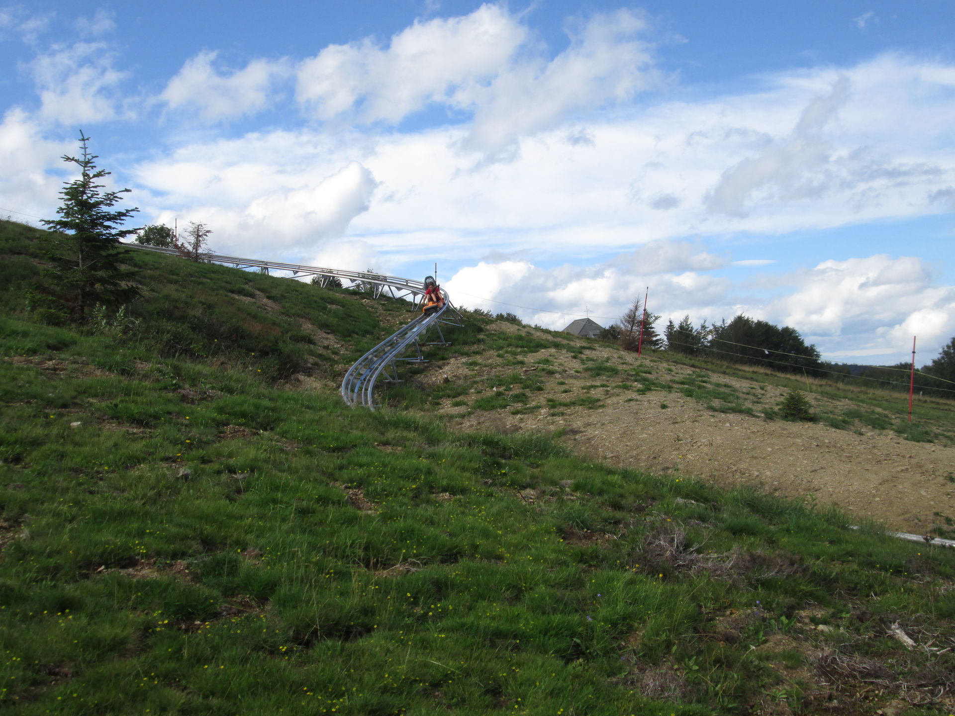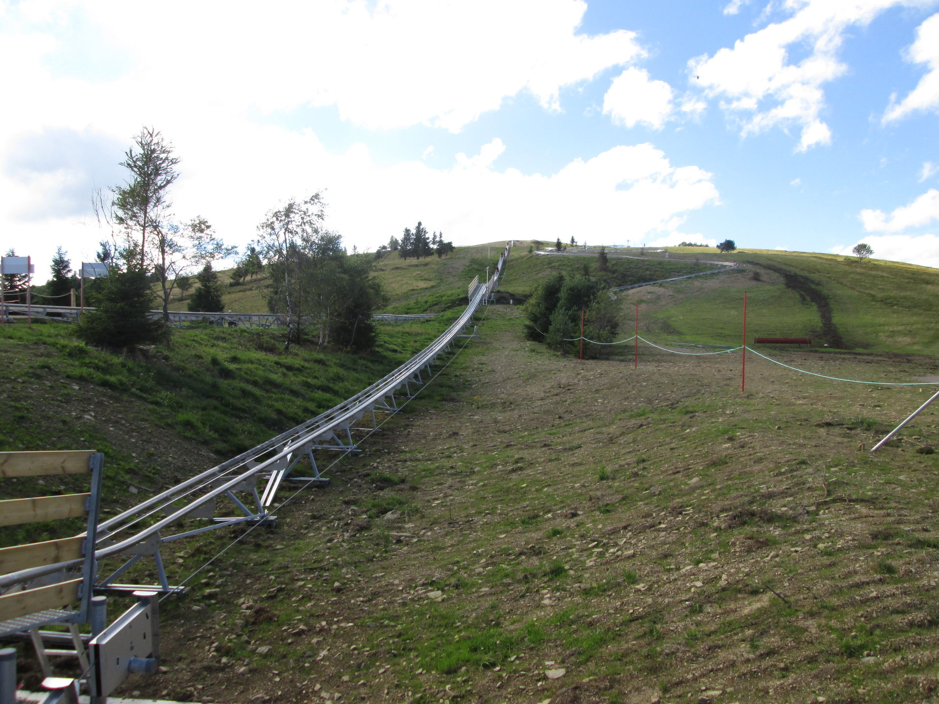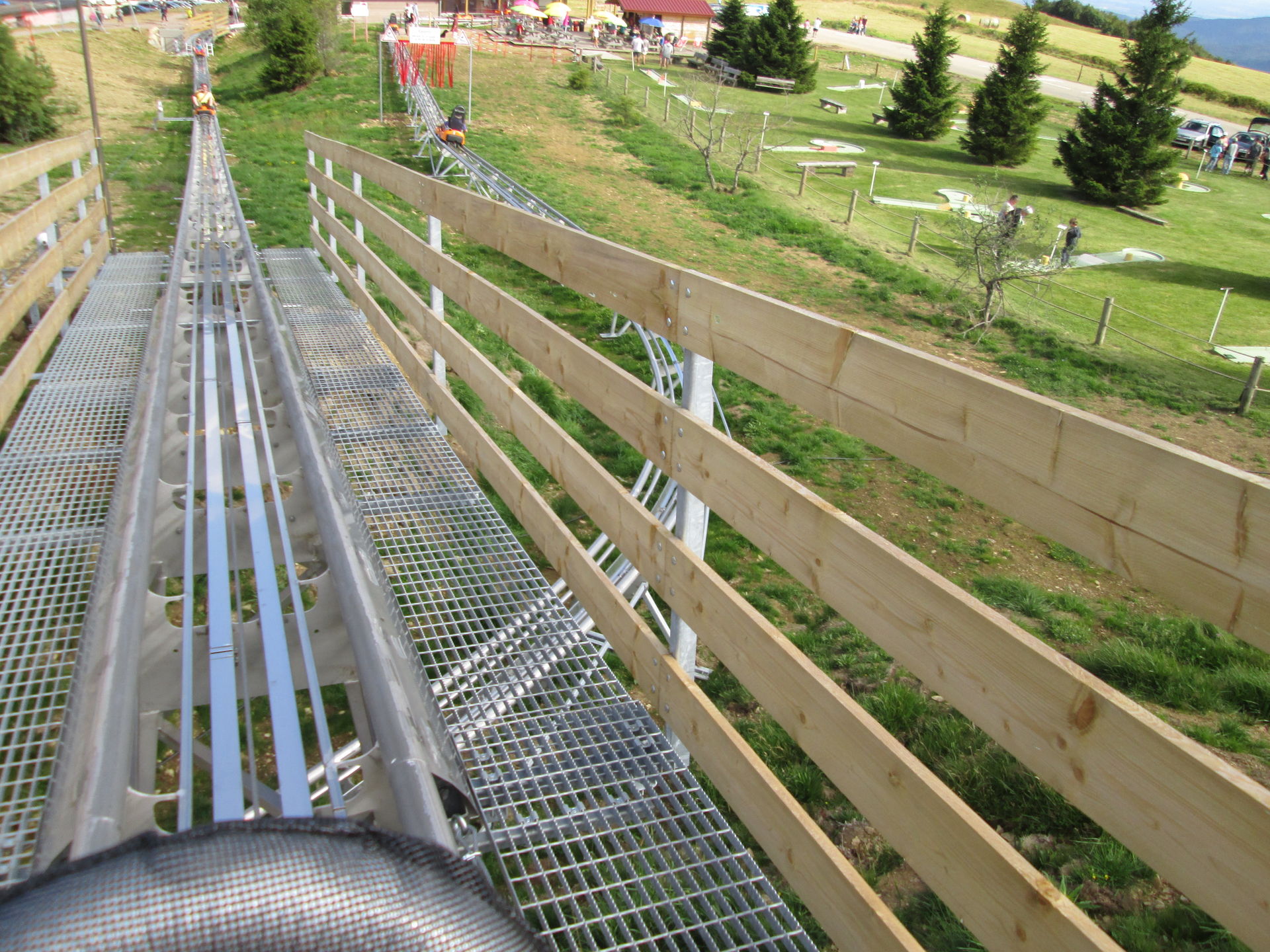 Keine 15 Minuten Autofahrt vom Grand Ballon entfernt, befindet sich Le Markstein, einer der größten Wintersportorte in den Vogesen. Neben diversen Liften und Restaurationsbetrieben (unter anderem eine Surferbar - ja Surfer, nicht Snowboarder) stand hier bis zum letzten Jahr Sommerrodelbahn von BobFrance, ähnlich der auf dem Grand Ballon. Diese wurde nun durch einen neuen Alpine Coaster von Wiegand mit dem sperrigen und wenig kreativen Namen "Luge sur Rail 4 Saisons" ersetzt. Eröffnung war am 05.07.2014 und die gesamte Konstruktion war bei unserem Besuch auch nur provisorisch abgesichert. Wie auch bei anderen aktuellen Auslieferungen von Wiegand ziehen sich auch hier Wirbelstrombremsen über die gesamte Strecke. Allerdings wird man ob des ohnehin eher flachen Terrains sowieso nicht besonders schnell. Alles in allem eine nette Bahn, aber definitiv nichts besonderes oder etwas, das einen Umweg lohnt. Wer dort sowieso Urlaub macht, kann das Bähnchen ja mitnehmen.