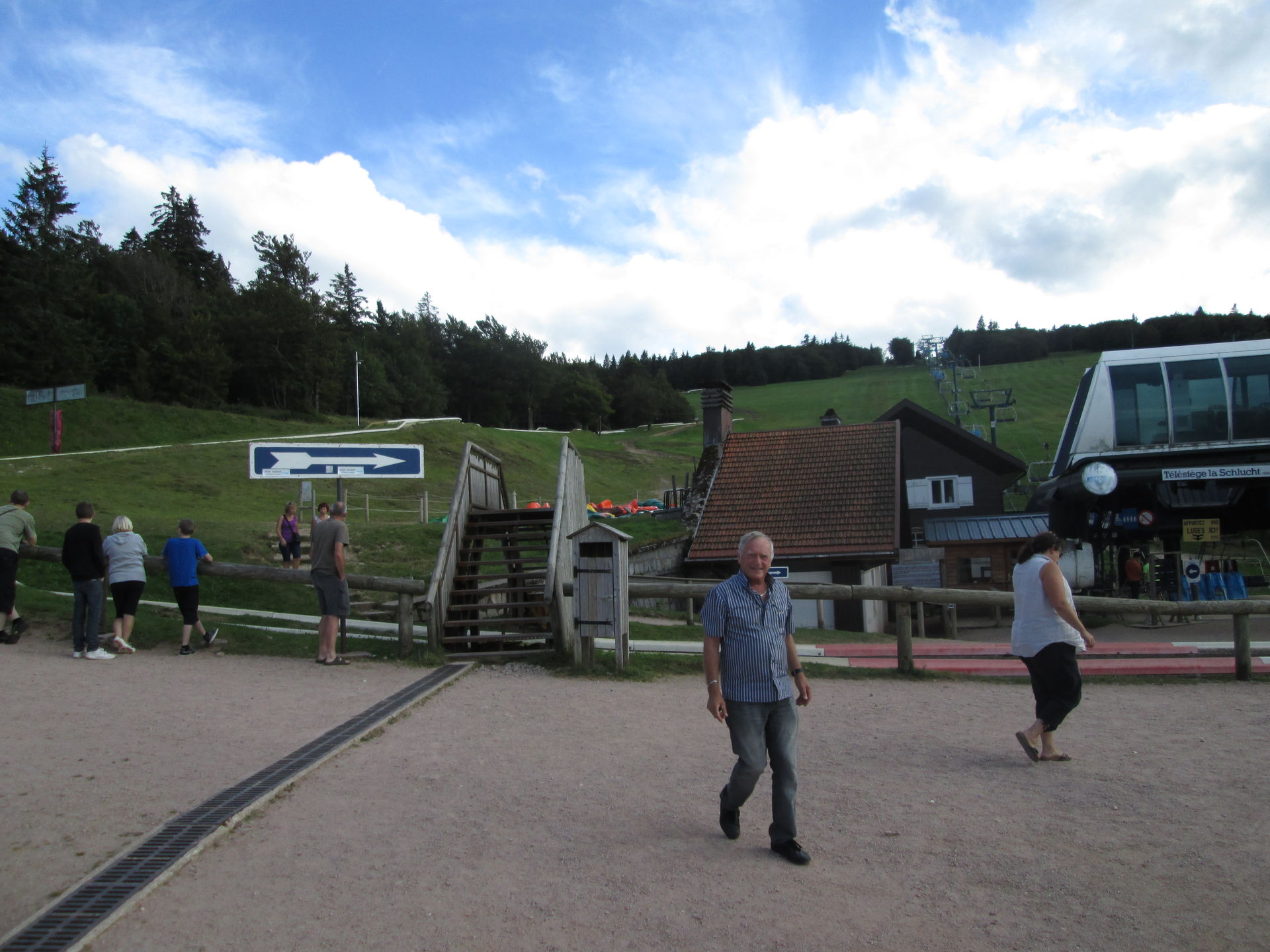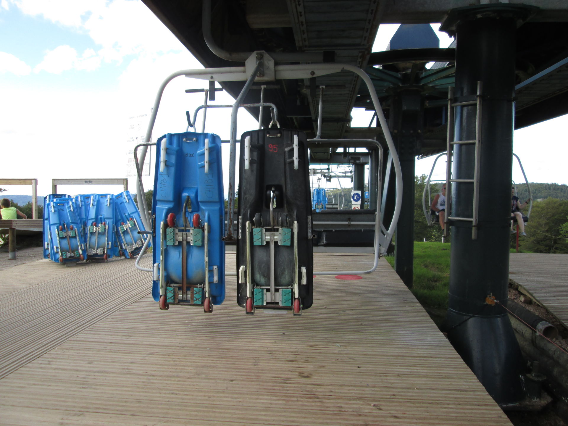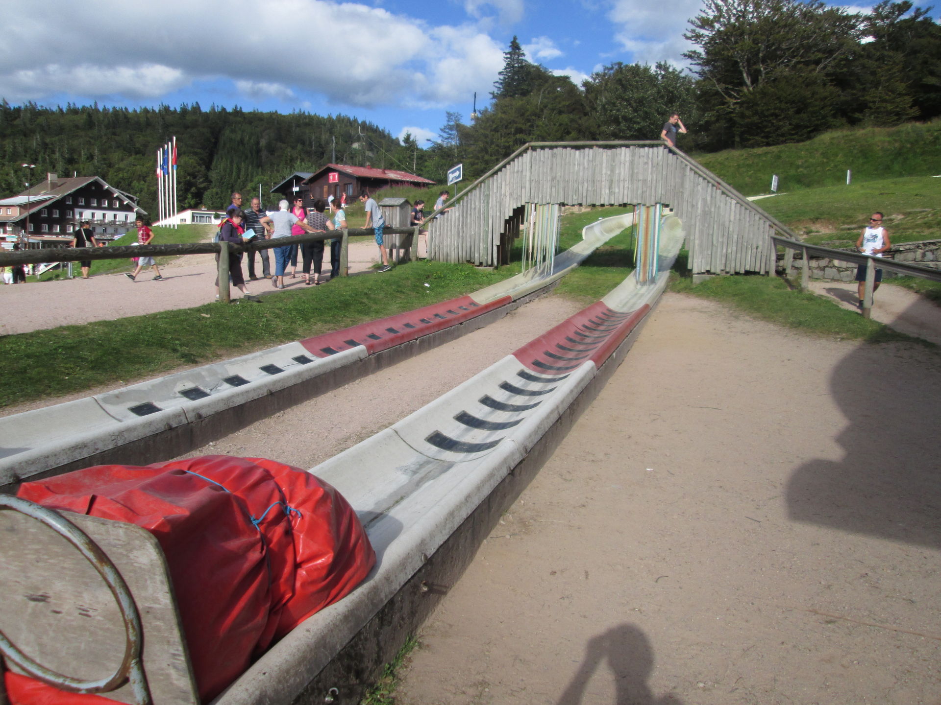 Mit der doppelten RolbaRun-Bahn in La Schlucht stand nun nach dem eher mauen Alpine Coaster von vor wenigen Minuten zuvor wieder eine äußerst spaßige Bahn an. So spaßig, dass wir die 6,30¤/Fahrt (inkl. Sessellift) gleich zwei Mal über die Theke wandern ließen. Es ist eine sehr flotte Fahrt mit vielen Steilkurven, die immer mal wieder durch kleinere Abfahrten, bei denen man ordentlich abheben kann, unterbrochen werden. Noch dazu kommt etwas Racing-Feeling auf, da man sich mit seinem Nebenmann auf der Parallel-Bahn duellieren kann. Wobei Parallelbahn nicht ganz stimmt: die beiden Bahnen haben ein leicht unterschiedliches Layout, z.B. überkreuzen sie sich an einer Stelle der Strecke. Aufwärts gehts mit einem viersitzigen Sessellift. Irgendwie habe ich leider aufgrund der großen Begeisterung kaum Bilder gemacht.