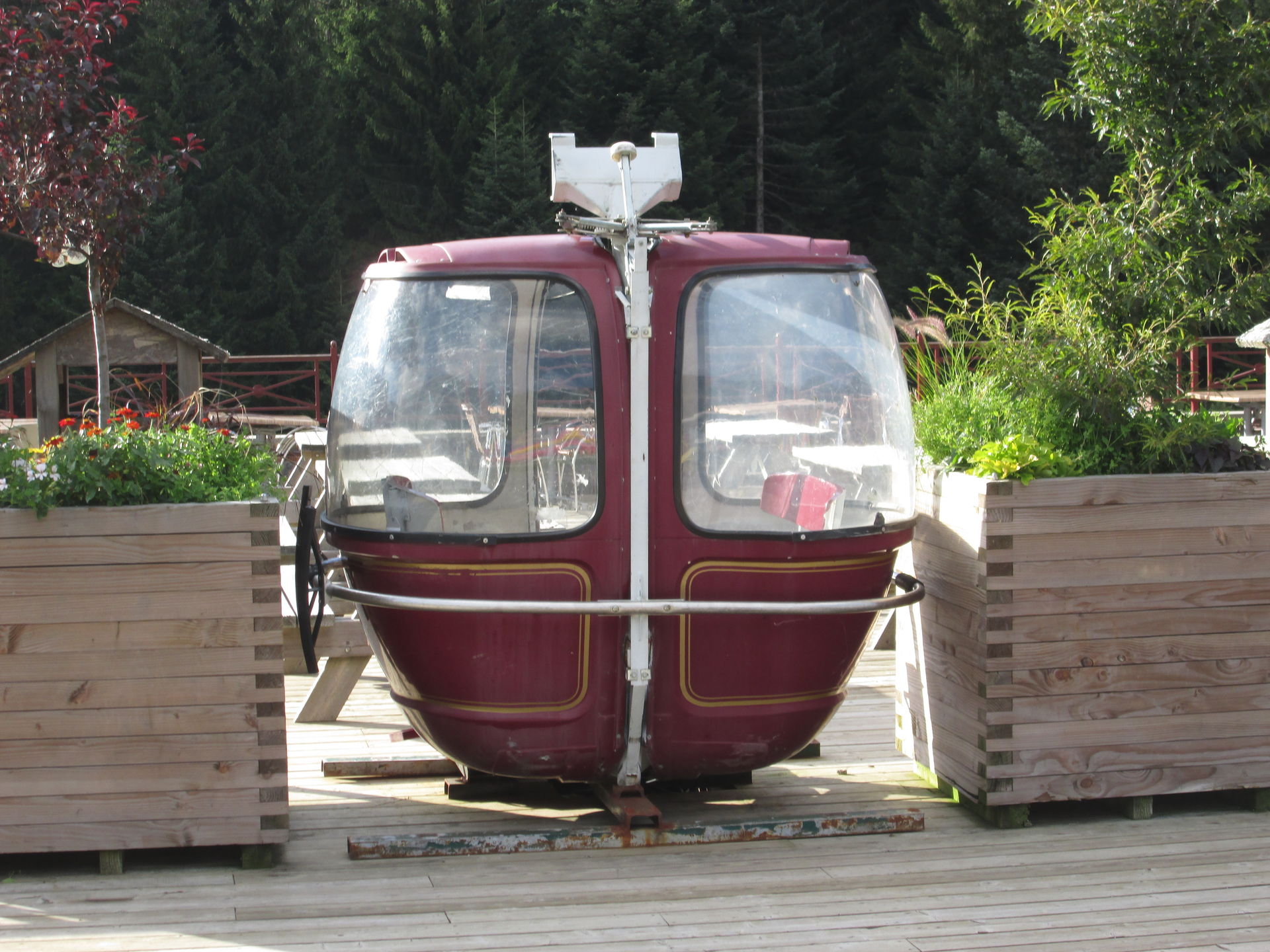 Eine alte Seilbahngondel, die zum Einlassen der Passagiere interessanterweise einfach komplett aufklappt.