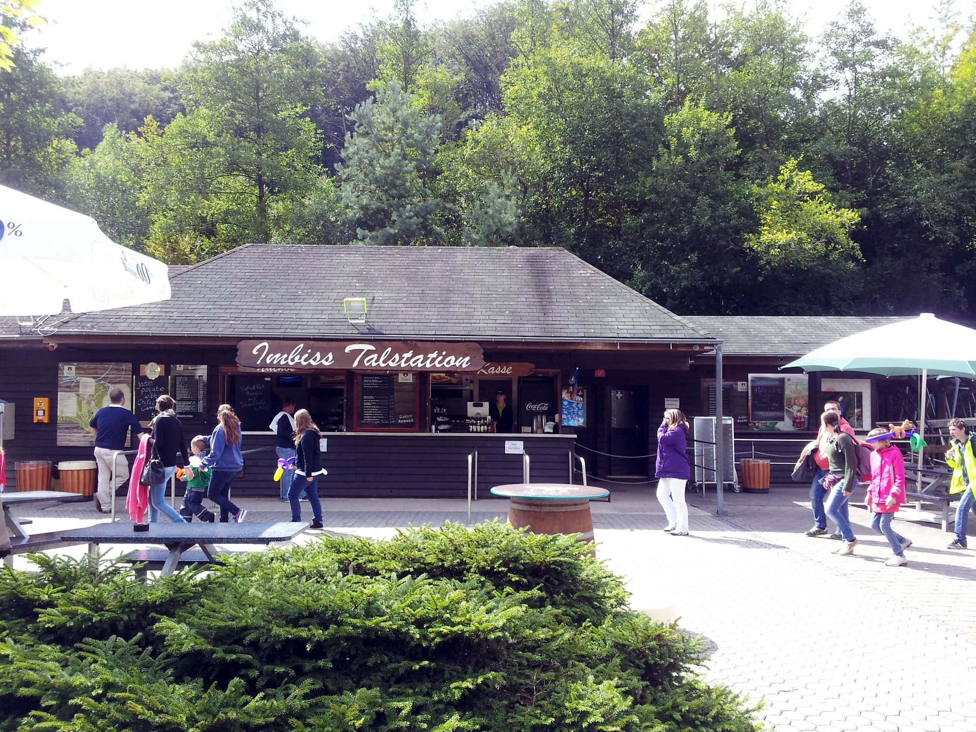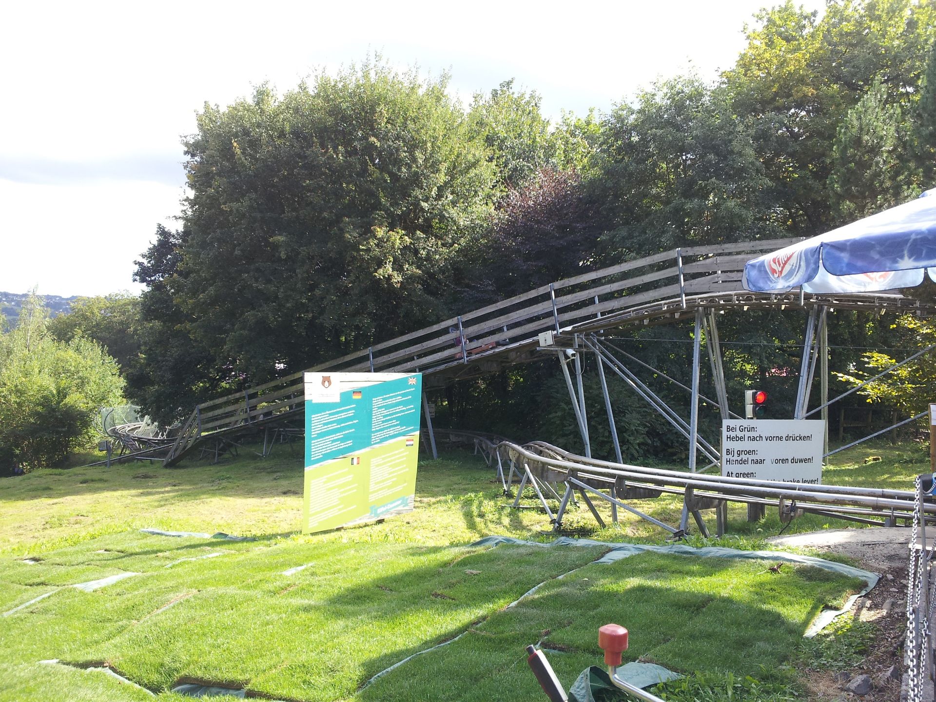 Vor wenigen Jahren hatte man die geändert, sodass man gleich wieder runter fuhr (wahrscheinlich um Personal zu sparen). Jetzt hat man die ursprüngliche Situation wieder hergestellt. Man muss also oben aussteigen und sich zum Runterfahren neu anstellen. Ist natürlich blöd, wenn viel los ist und man quasi doppelt anstehen muss. Trotzdem finde ich das gut, denn der Alpine Coaster dient damit auch als Transportmittel. Besonders an diesem Tag, denn der Eifel-Express (ein Traktor mit Personenanhängern) fuhr zum Jubiläum nicht - offenbar hatte man mit mehr Besuchern gerechnet und in der Talstation diverse Bierzeltgarnituren aufgestellt.