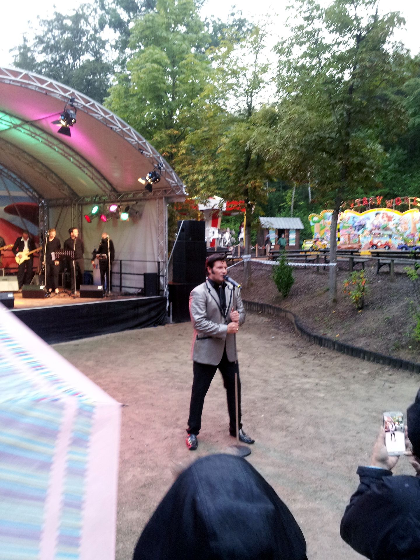 Kurz nach 17 Uhr stand ich nun also klatschnass im strömenden Regen an der Talstation. Eigentlich war ich nun mit dem Park durch. Also was tun die nächsten 6 Stunden? Erstmal den Regenschirm auspacken und schauen, was gerade auf der Bühne los ist. Eine ulkige Zirkusshow. Beziehungsweise deren Finale. Hat mich zwar nicht so brennend interessiert, aber was besseres hatte ich ja gerade nicht.