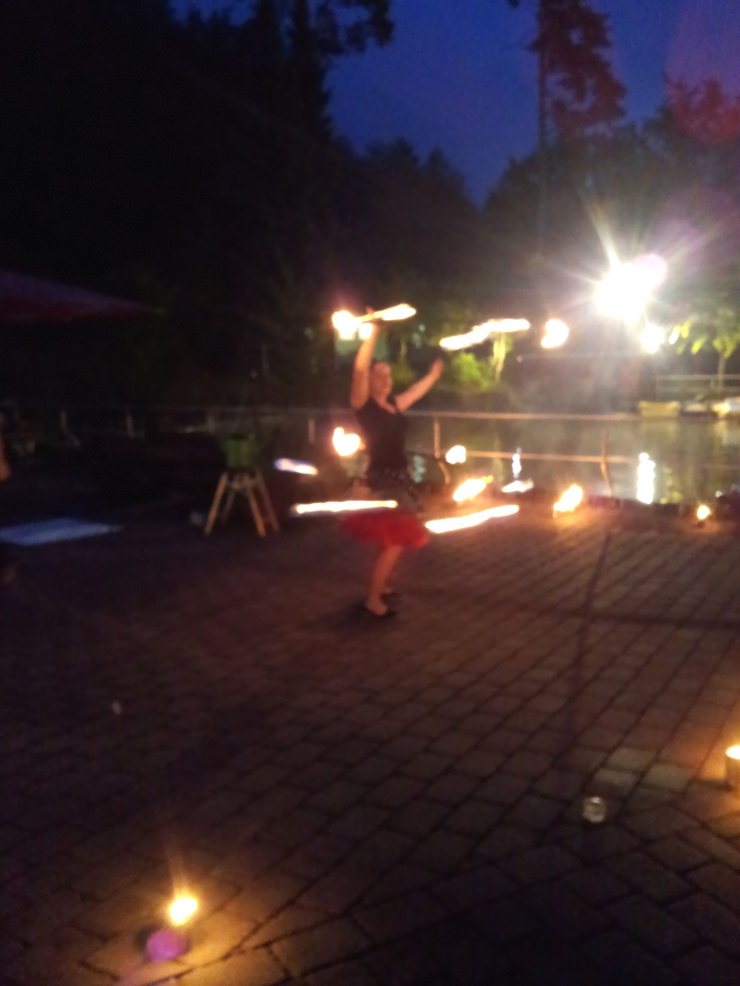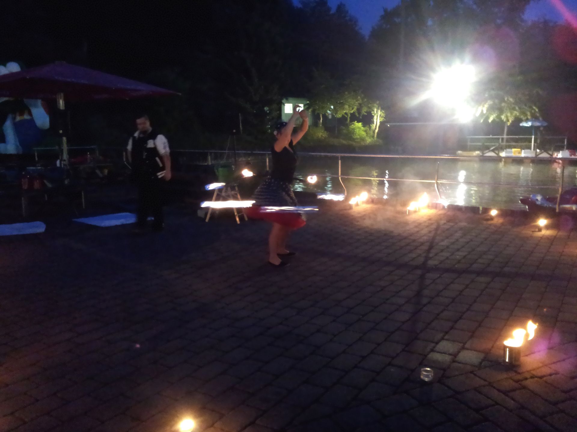 Hula Hoop geht auch mit zwei brennenden Reifen.