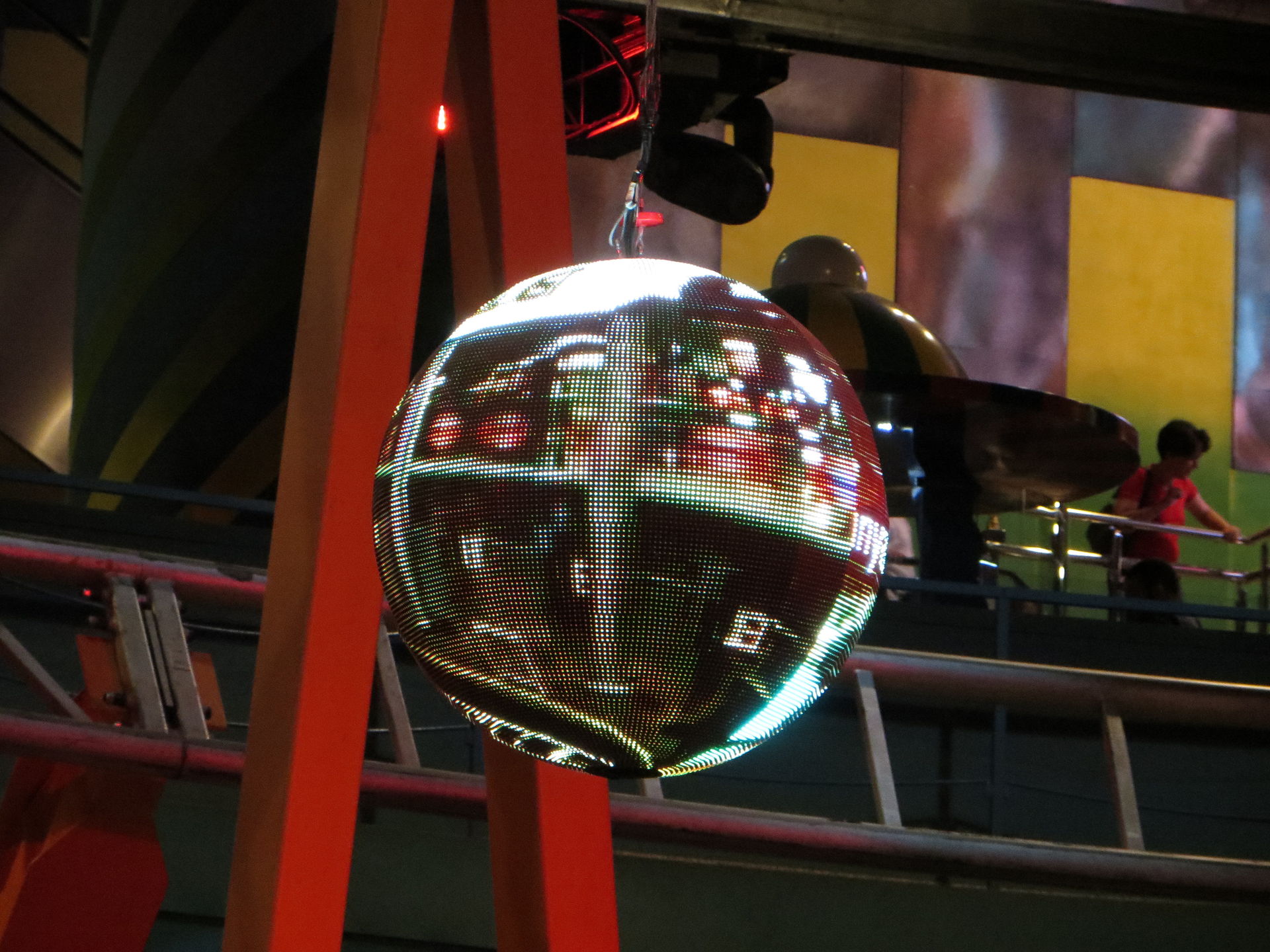 Durch die Farbwechsel der Hallenbeleuchtung und die Videokugeln in der Halle wird das ganze optisch sehr aufgewertet.