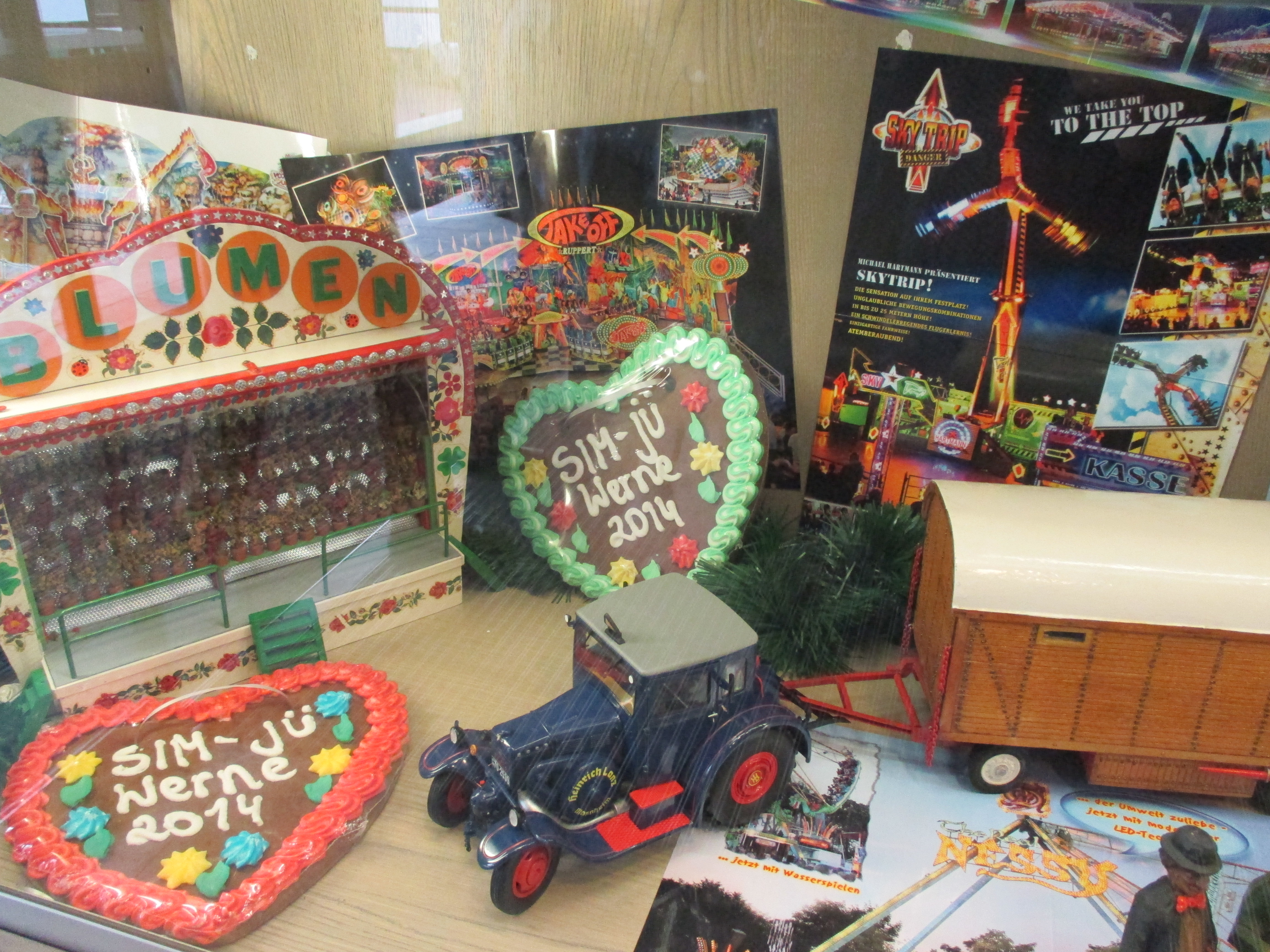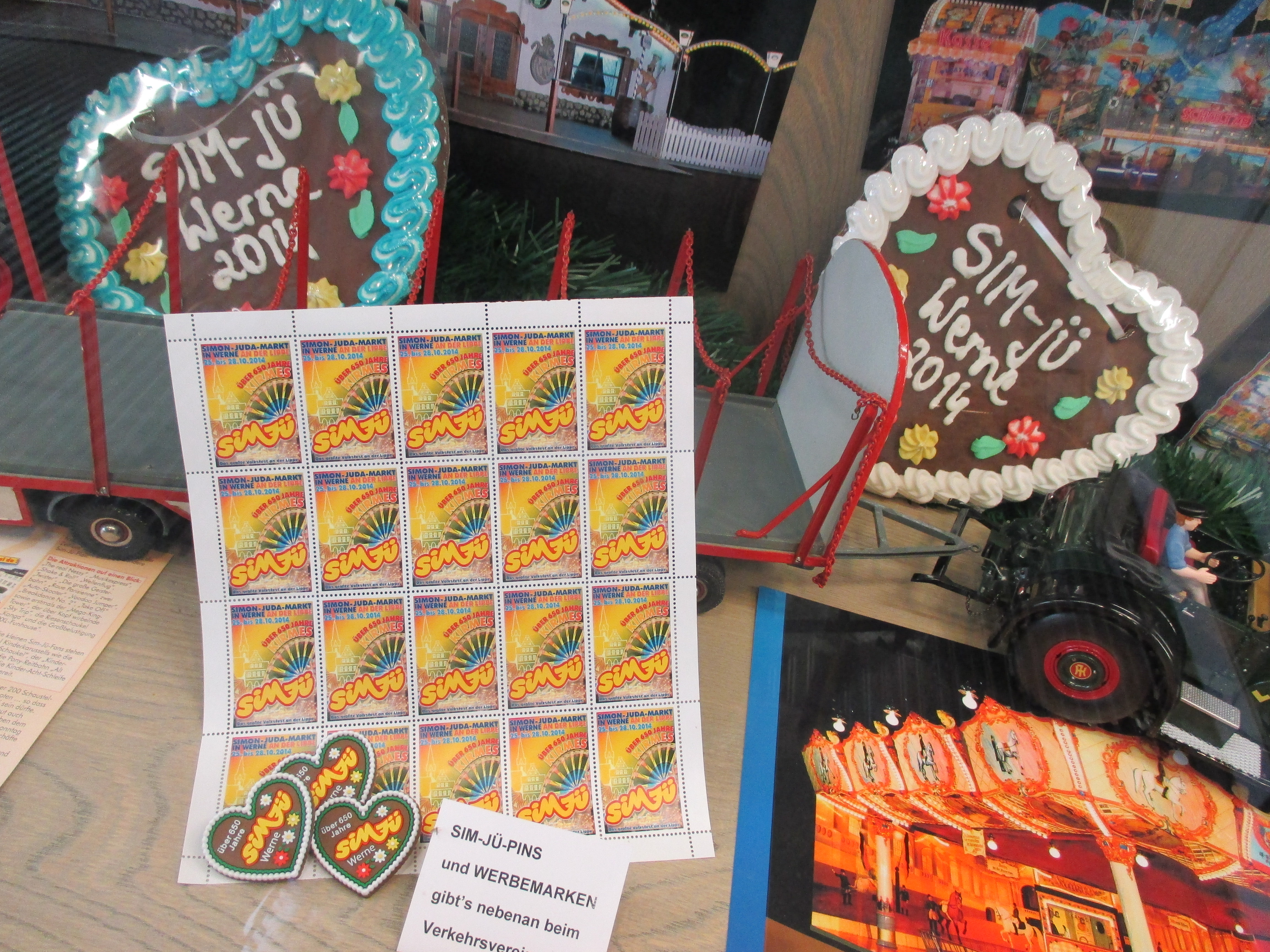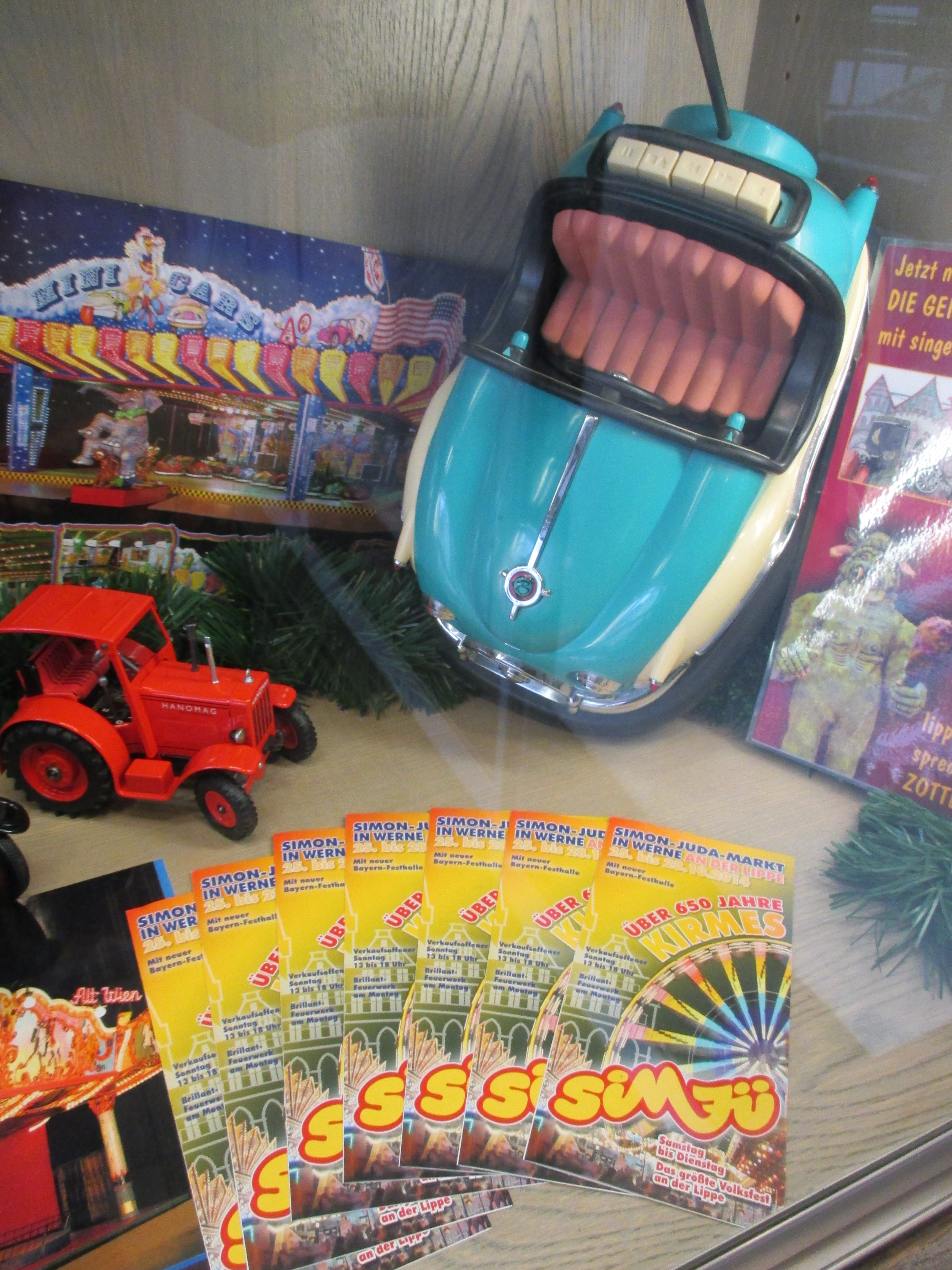 Zuvor geht es aber noch zum Geldtanken in die Sparkasse, die mit einer hübschen Vitrine zu Sim-Jü (kurz für Simon-Juda-Markt) aufwartet.