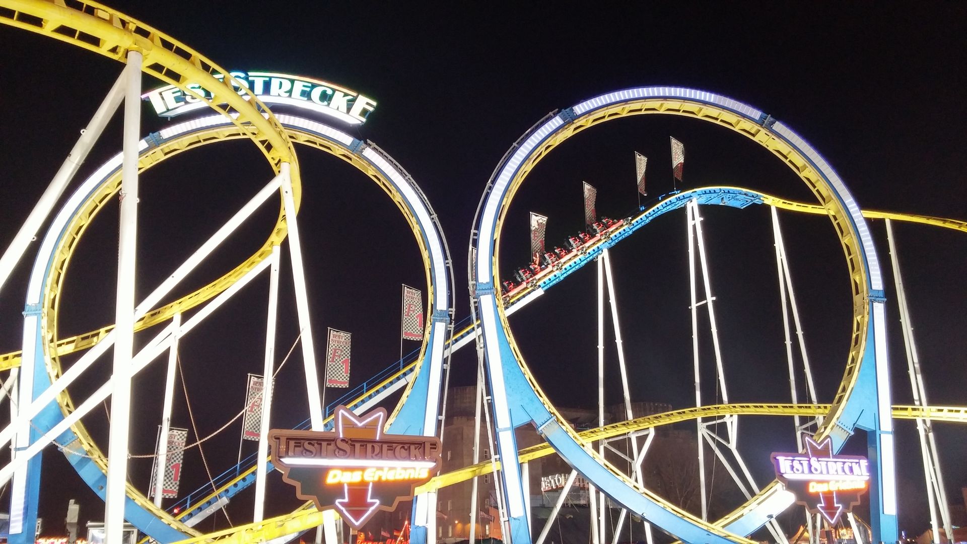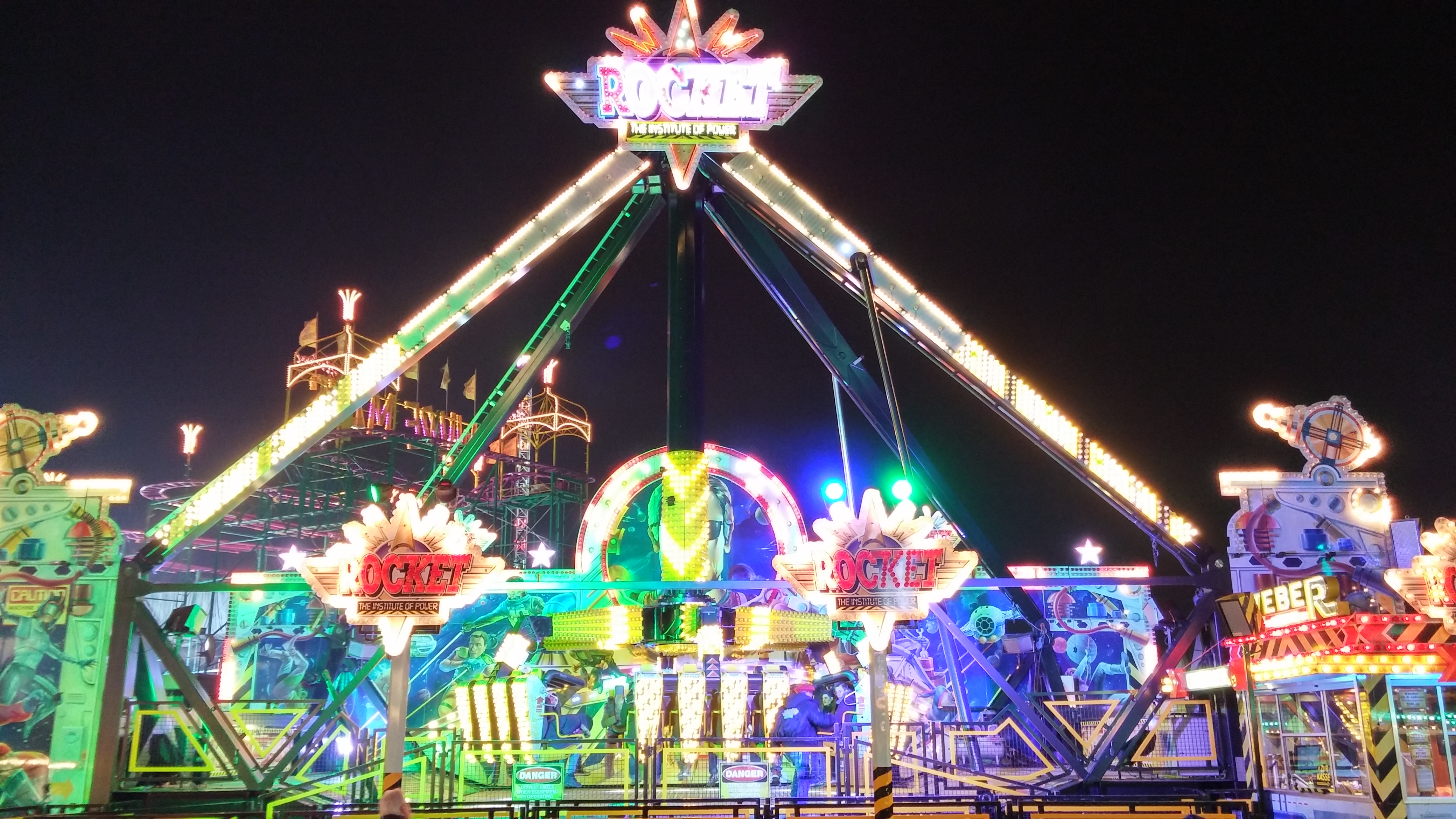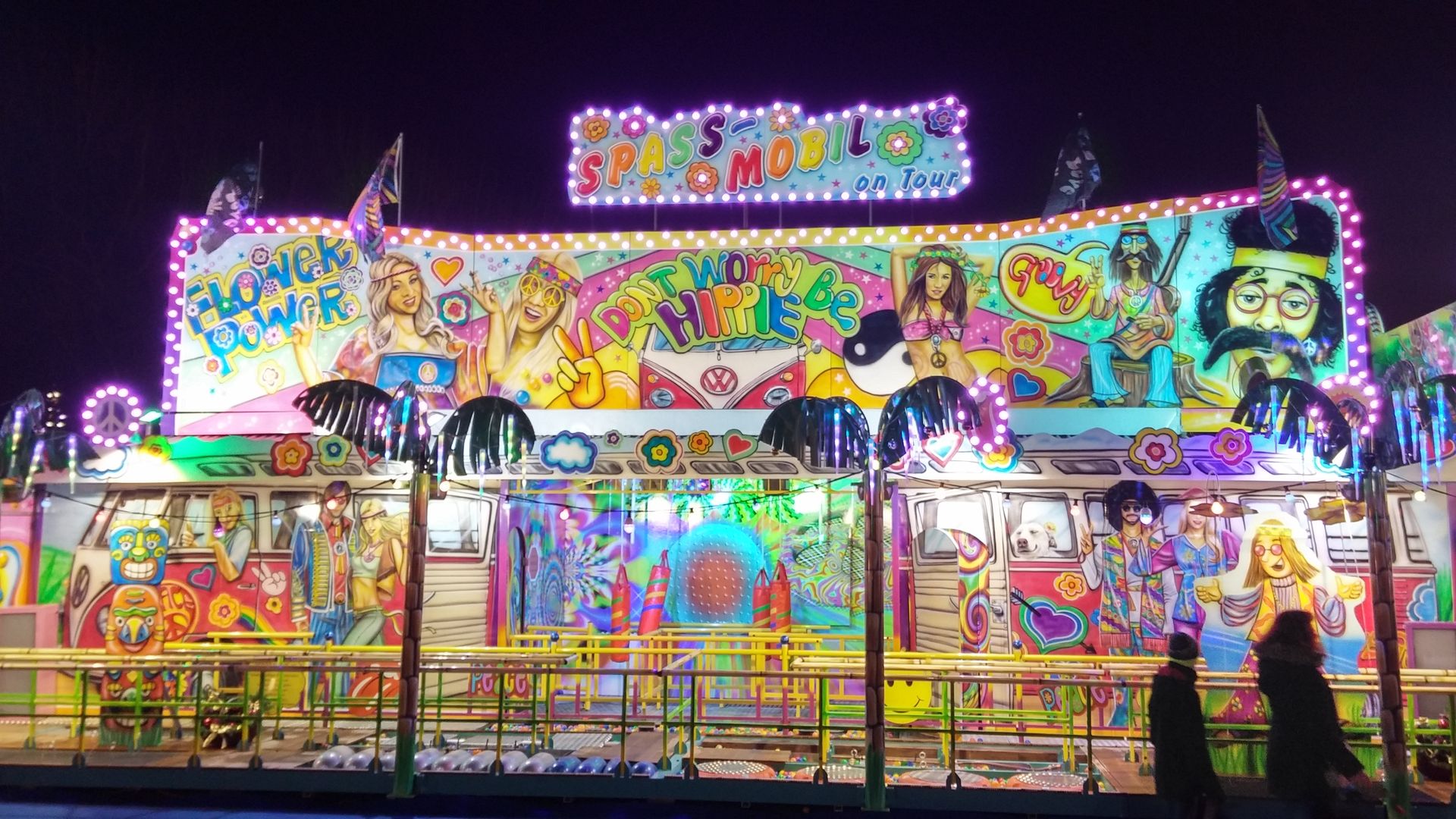 Ich will mich da gar nicht groß rechtfertigen, tue es aber dennoch: Dank Schlafausbeute von etwa 1,5 Stunden die Nacht zuvor war ich eh nicht sonderlich fit, samt, ich nenne es mal, eher wenig essen. Nach der ersten Runde hat Fabian es recht ordentlich gemeint mit der Fahrzeit aber auch der Intensität, so dass mir nicht schlecht war, aber direkt noch eine Runde hätte ich auch nicht gewollt. Beim zweiten Rundgang war ich mir unsicher, ob eine Fahrt eine gute Idee ist und bin auch sonst nichts gefahren, selbst mein Favorit Capriolo und Afterburner nicht - ich wusste einfach nicht, wie sich das mit der zwischenzeitlich eingenommenen Frites special, Müdigkeit und evt. Fahrtüchtigkeit auf dem Rückweg verträgt. In Sachen Rocket war ich sogar ganz froh, bei der Kombination deftig schwingen,s schnell drehen, rechtsrum, linksrum, rechtsrum, stoppen um drei Leute raus zu lassen, und dann nochmal eine rechts-links Zugabe hatte damit das auf jeden Fall beste Preis-Fahrzeitverhältnis: Ein Euro für mindestens 3,5 Minuten...