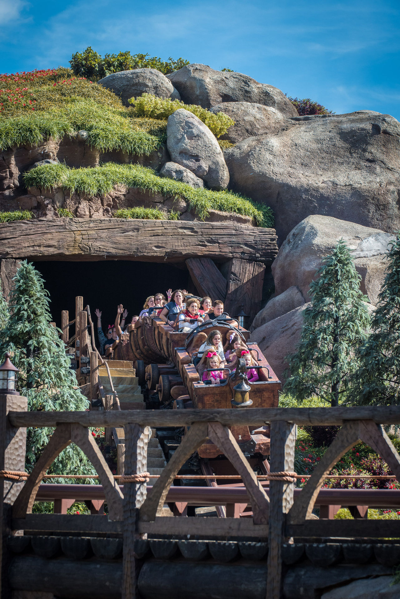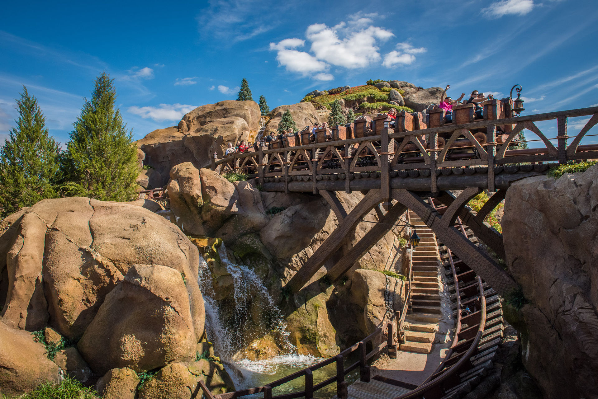 So weit, so gut. Gespannt waren wir alle natürlich auf die „Seven Dwarfs Mine Train“, das neue Zentrum des New Fantasyland. Bei dieser schön thematisierten Anlage mit Darkride-Part und leicht schwingenden Wagen hat Disney viel richtig gemacht: die Fahrt ist rasant, macht Spaß und die Anlage ist wirklich schick. Der Darkride-Part ist kurz, aber State of the Art. Weniger Spaß machten uns die zahlreichen und ausgeprägten Downtimes, die die Anlage während unserer vier Besuchstage hatte, zumal man sich fragt, wieso das wohl so ist. Klar, man könnte jetzt mit der Binse um die Ecke kommen, dass man das halt kriegt, wenn man beim Holländer kauft. Fest steht aber, dass der Ride mehr down als up war und somit kontinuierlich bei 70-90 Minuten Wartezeit stand. Und das ist für die Bahn eindeutig zu lang. Heigh Ho!