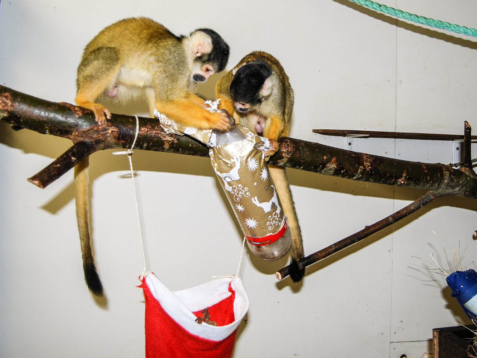 Weihnachten bei den Totenkopfäffchen, die die Mehlwürmer in der Flasche mit größtem Appetit verspeisen.