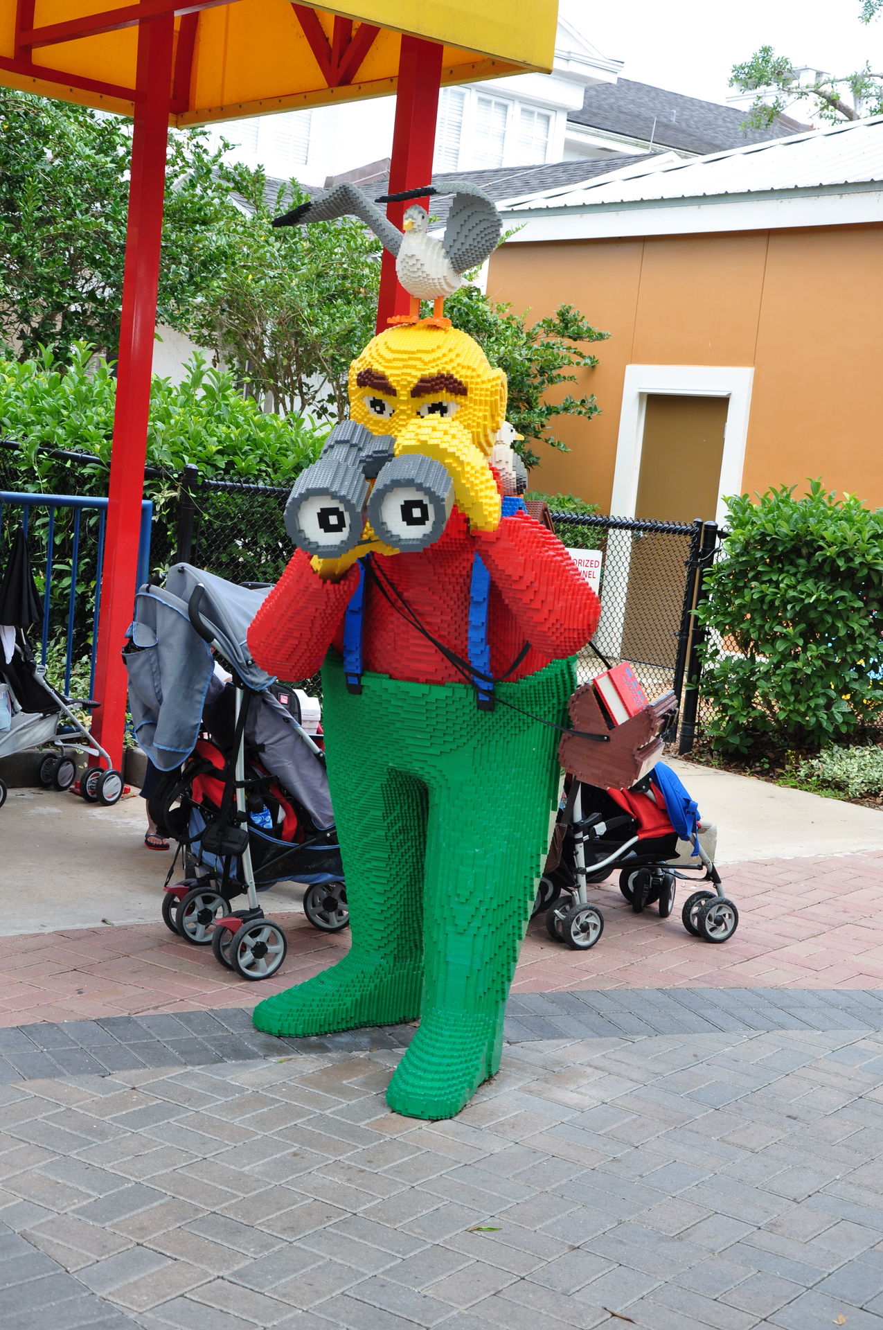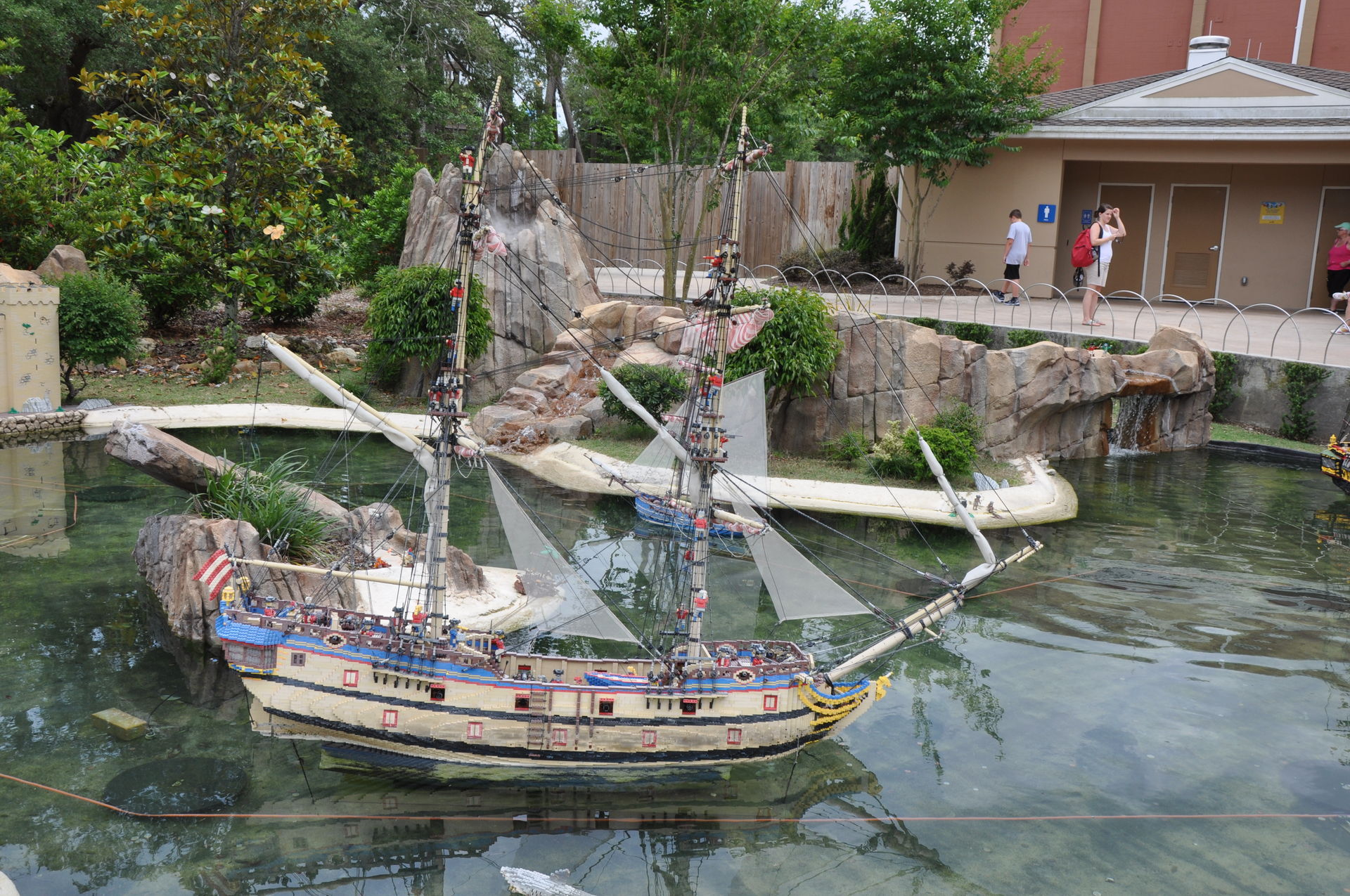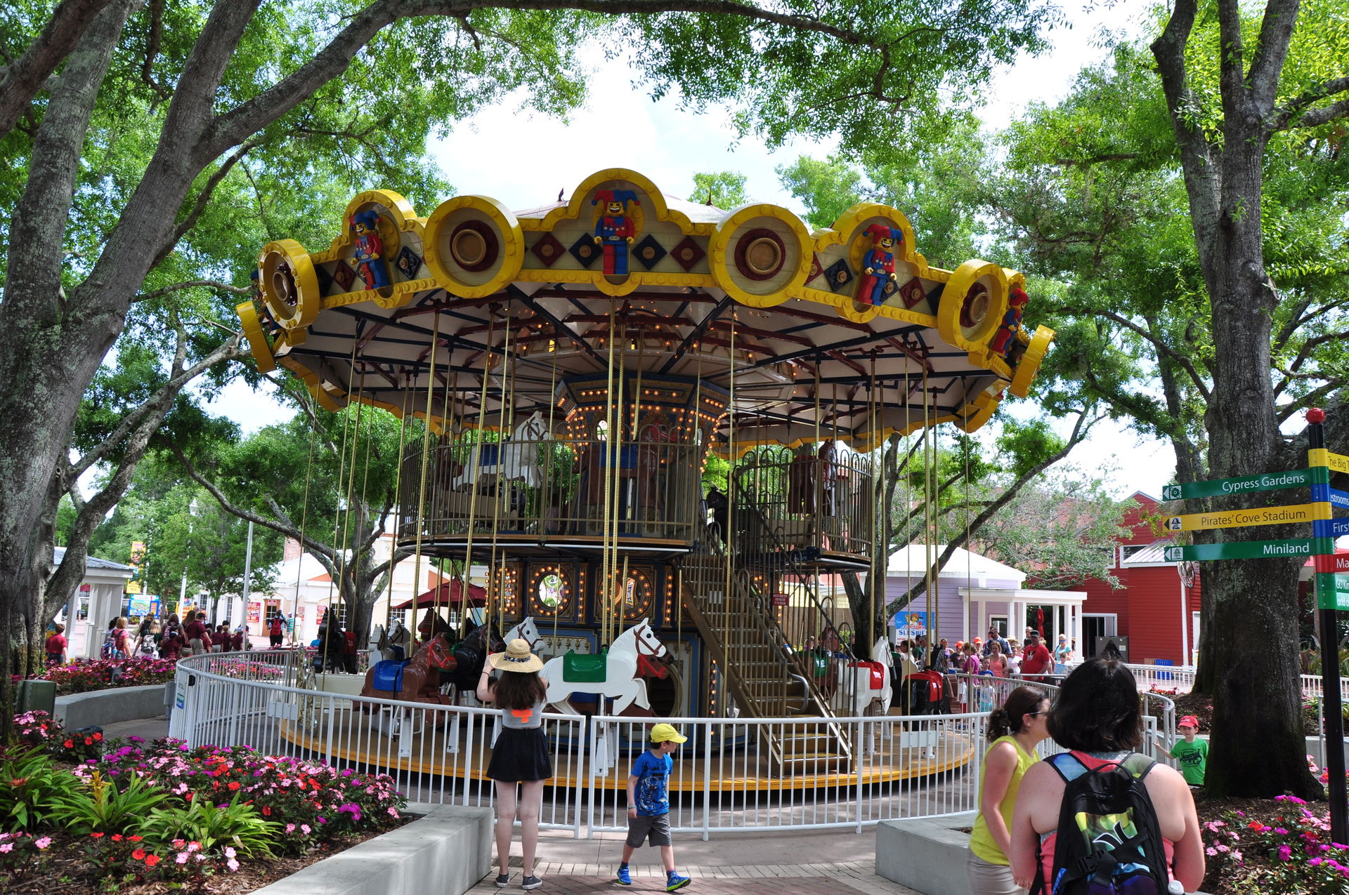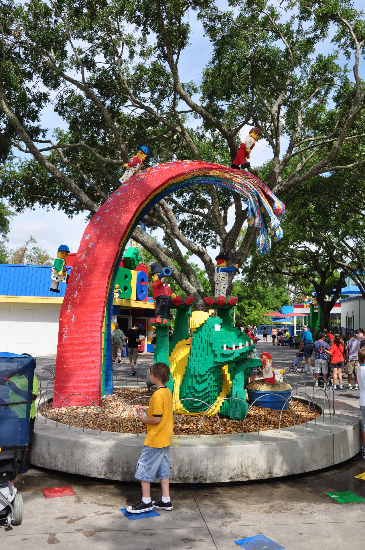 Die bunten Bauklötze gibt es noch gar nicht so lange in Florida. Der Park öffnete erst am 15.10.2011 seine Pforten. Davor hatte er eine eher wechselvolle Vergangenheit als Cypress Garden hinter sich. Diesem Umstand verdankt der Park auch, dass er den einzigen Woody aller Legoländer hat. Denn dieser wurde vom Vorgängerpark mit übernommen. Der Park liegt schön am Ufer des Lake Eloise und nutzt diesen auch für seine Shows. Diese haben wir jedoch nicht gesehen. Eine weitere Besonderheit ist der zugehörige Wasserpark. Dieser hatte am Tag unseres Besuches leider geschlossen. Das Wetter war so schwül gewesen, da hätten wir uns gerne erfrischt. Ob wir die Zeit dafür gefunden hätten ist fraglich, denn wir haben unseren Besuch dann vorzeitig wegen eines heftigen Gewitters abgebrochen. So konnten wir dann noch in Ruhe Koffer packen. Etwas mehr haben wir uns darüber geärgert, dass auch die Flying School wegen Wartungsarbeiten geschlossen hatte. Ist dieses doch der größte Coaster im Park. Da man den Weg schon an der Driving School abgesperrt hat, kam ich nicht einmal in die Nähe um Fotos zu machen.