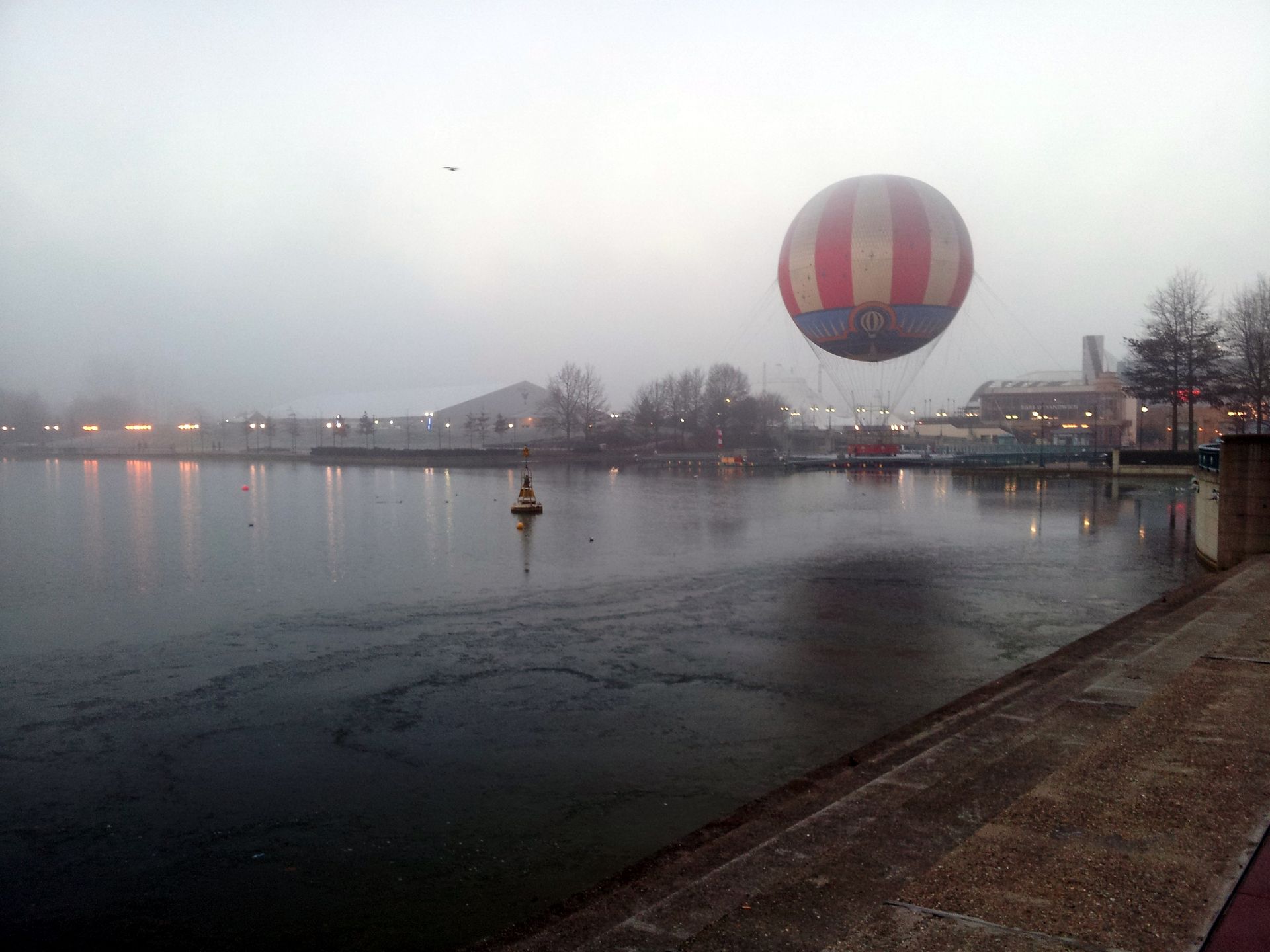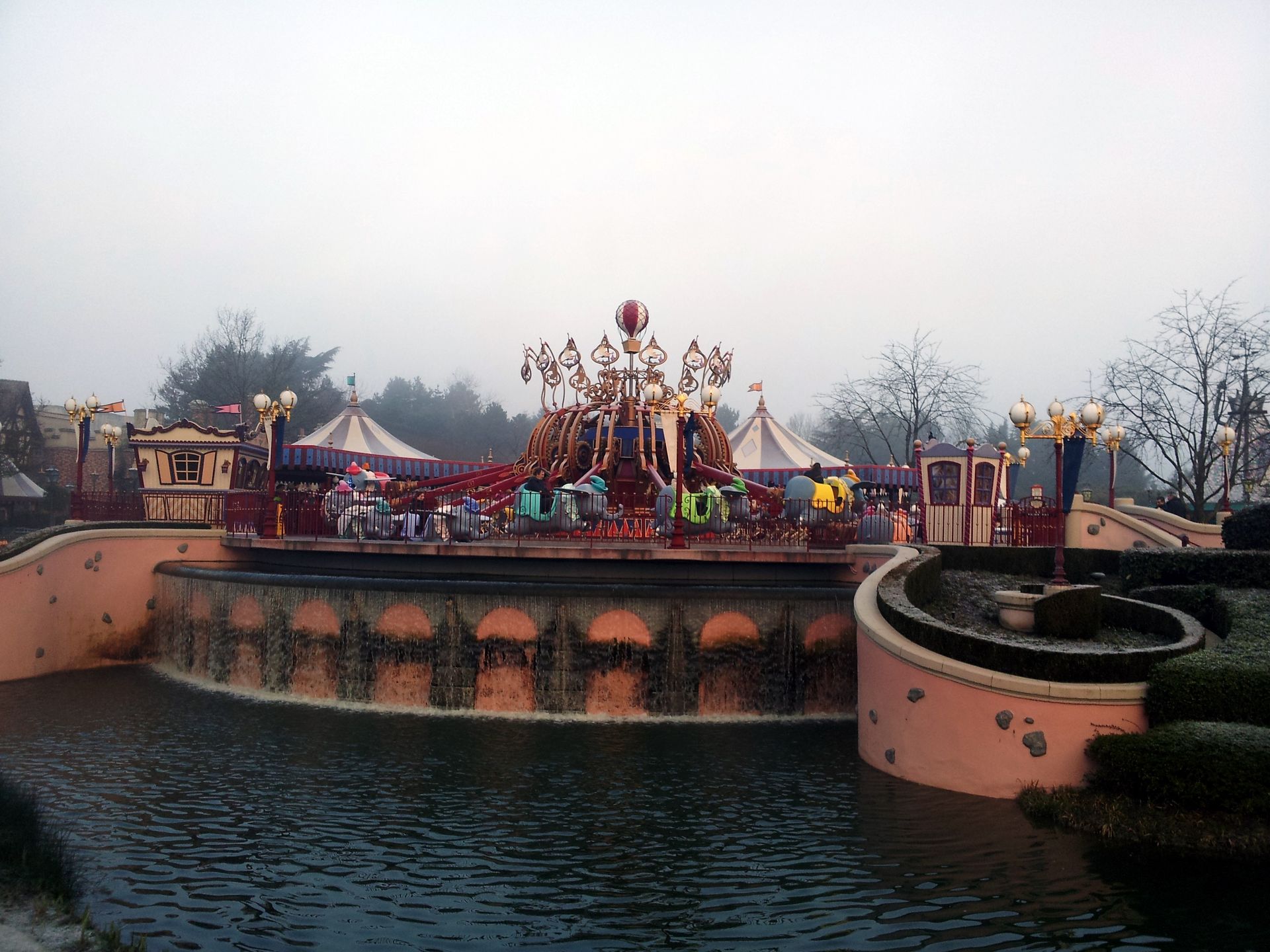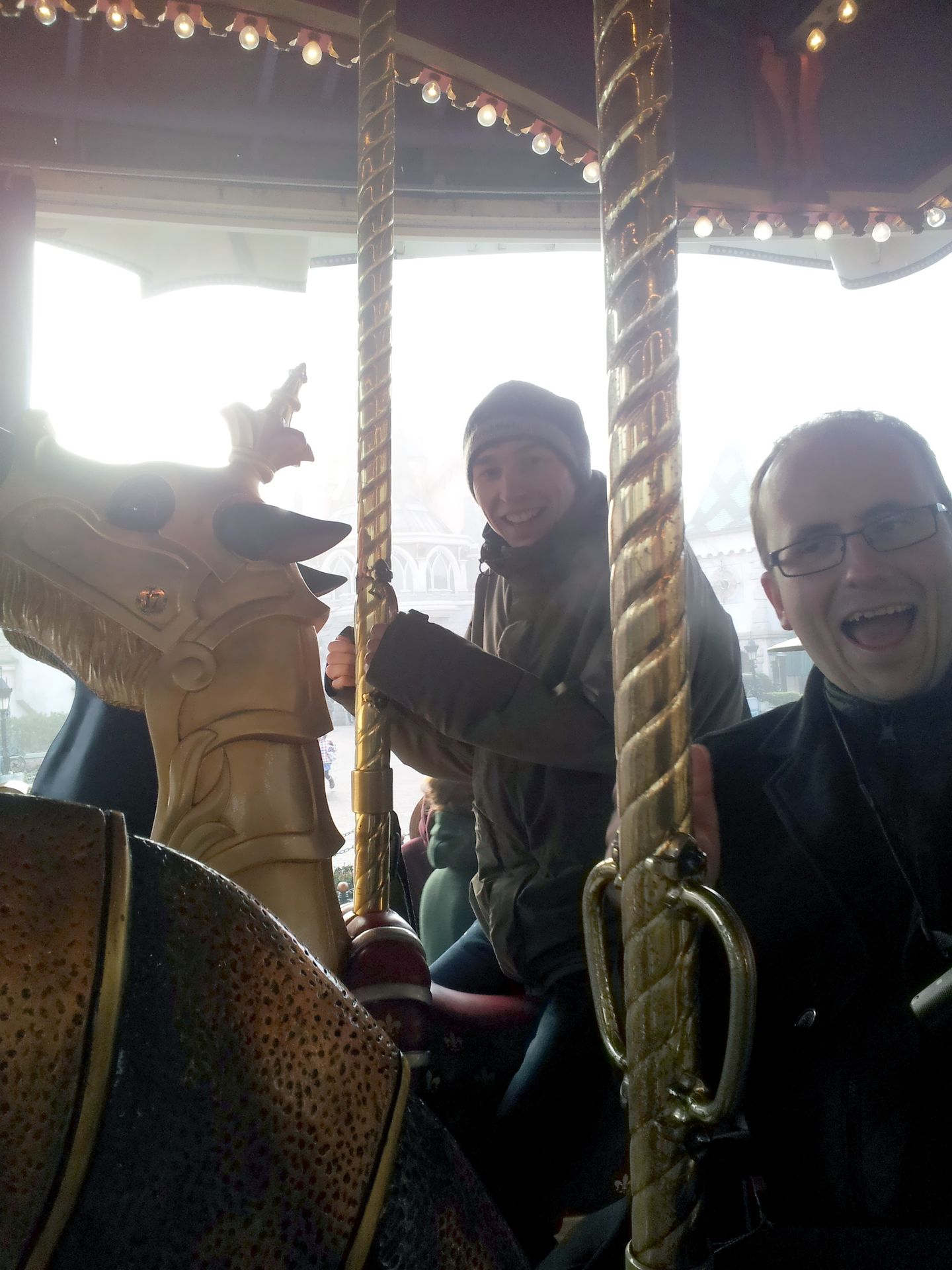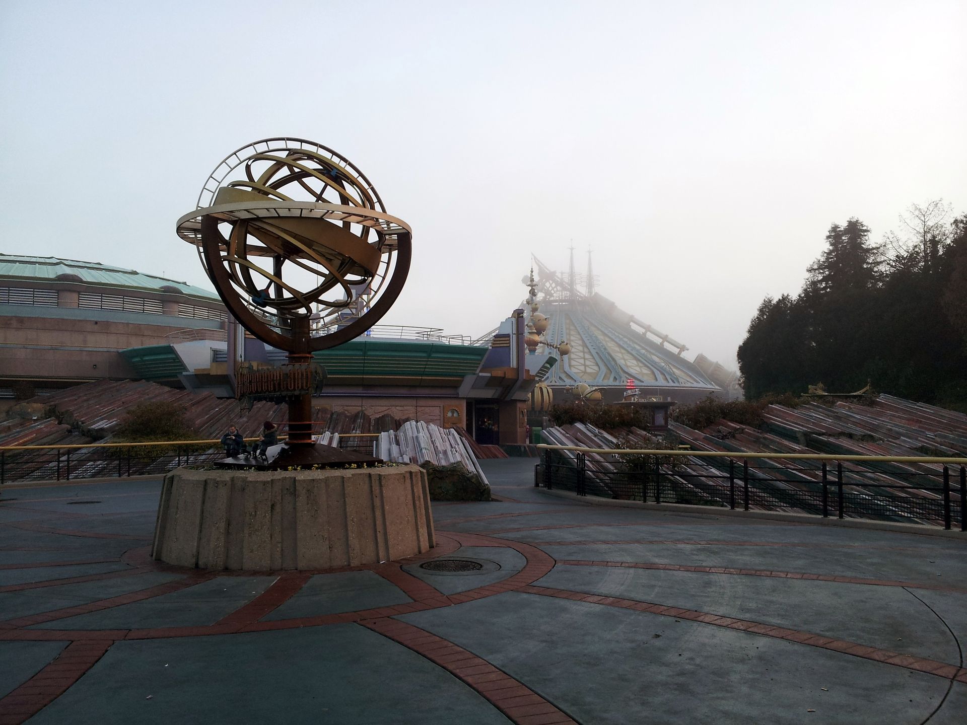 Es war gar nicht so leicht, da rein zu kommen, denn die Gondeln waren mit einer hauchdünnen Eisschicht bedeckt und sowohl außen wie auch innen relativ glatt. Entsprechend kalt war die Fahrt, aber die Fliehkraft - besonders am Boden - ist schon nicht schlecht. Leider ist die Fahrt extrem kurz. Ich wollte gerade mein Handy auspacken, um eventuell von oben ein Foto von Space Mountain machen zu können, da senkte sich die Gondel aber schon wieder. Also länger als ein paar Minuten würde ich dafür sicherlich nicht anstehen...
