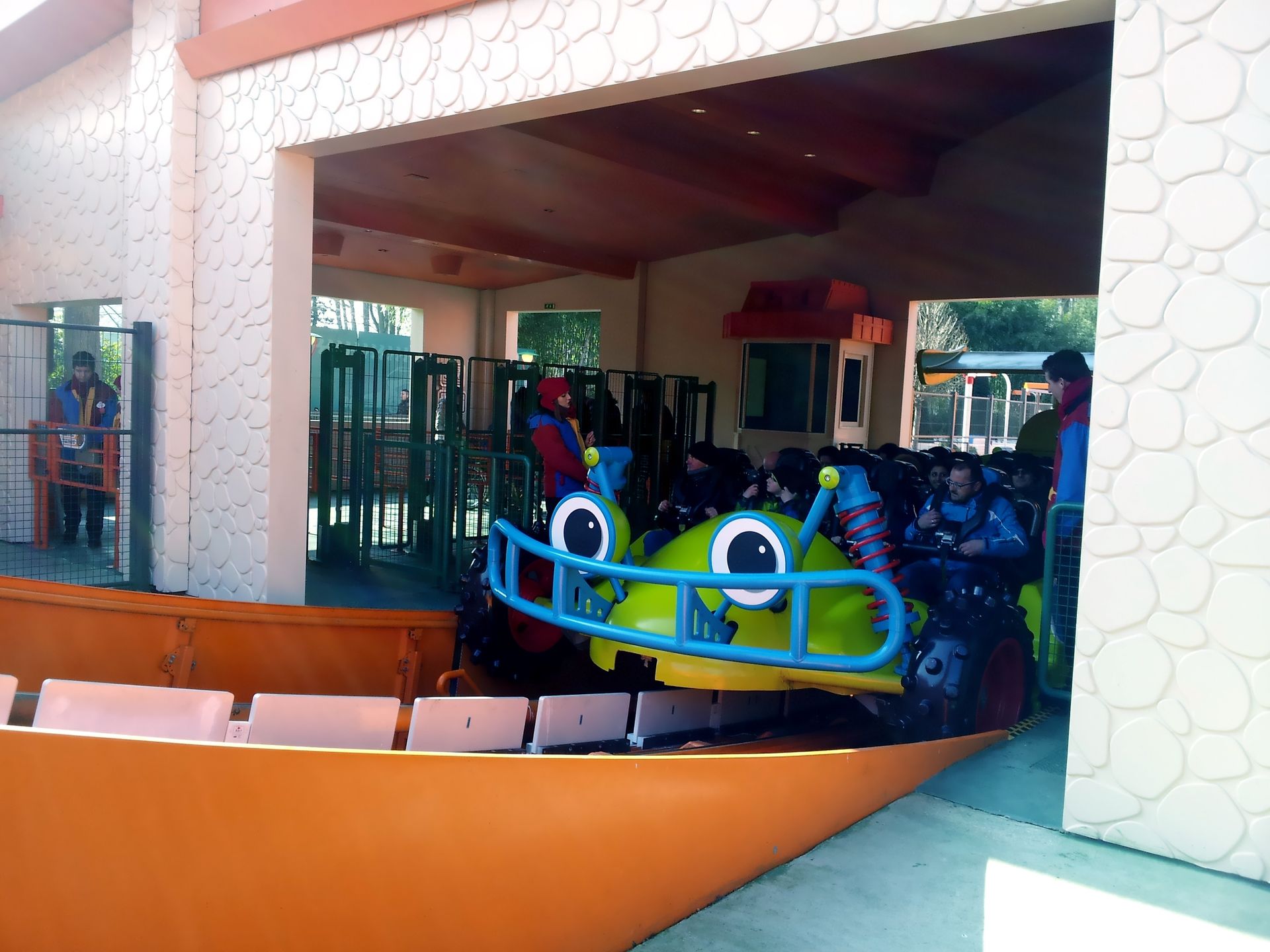 Allein schon der Anblick der Station ist beim ersten Mal echt überwältigend. Immer drei Fahrzeuge mit zwei Reihen á drei Personen fahren hier zusammen. Da es sich um ein schienenloses System handelt, können die Fahrzeuge auf der großen Fläche quasi "frei" herumfahren. Das sieht dann so aus, als würden sie völlig chaotisch einfach kreuz und quer herumfahren. Aber natürlich hat das alles System und sie fahren immer gleich (wenn man mehrmals fährt und darauf achtet, merkt man das auch relativ schnell).