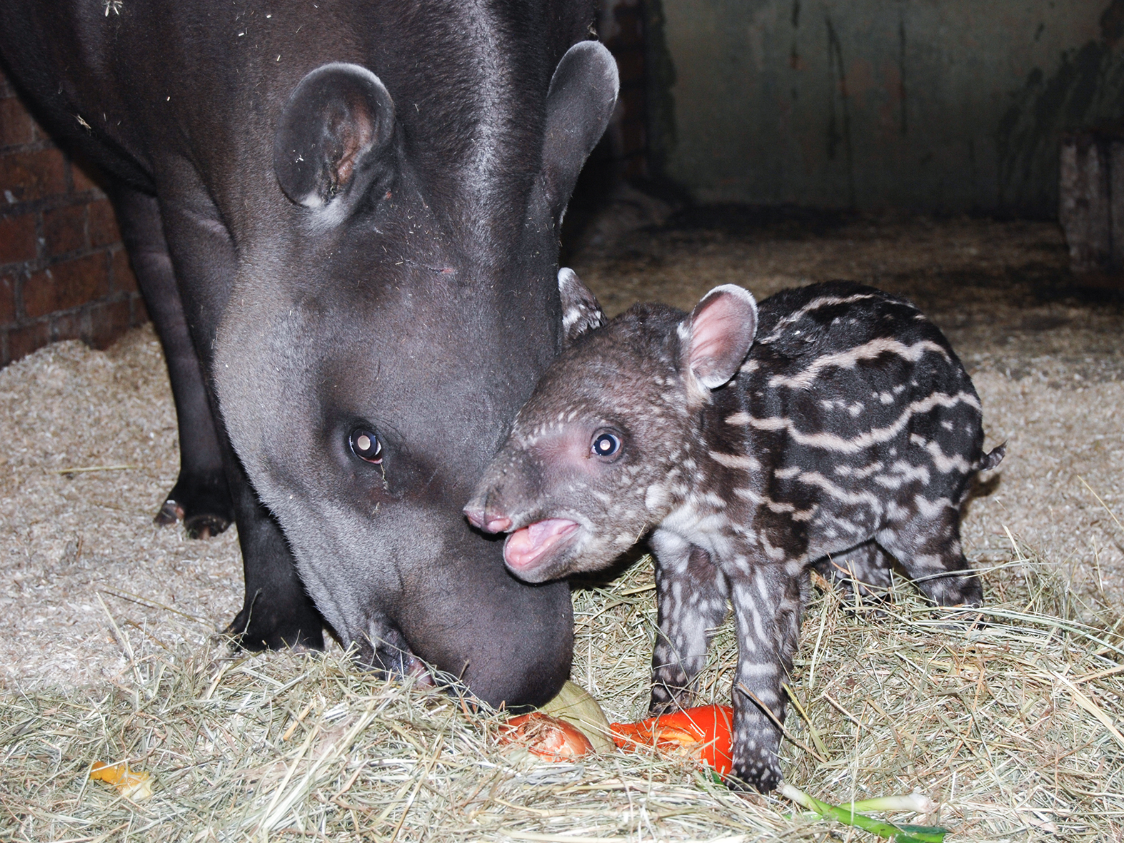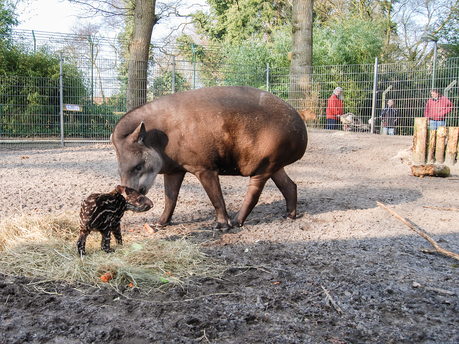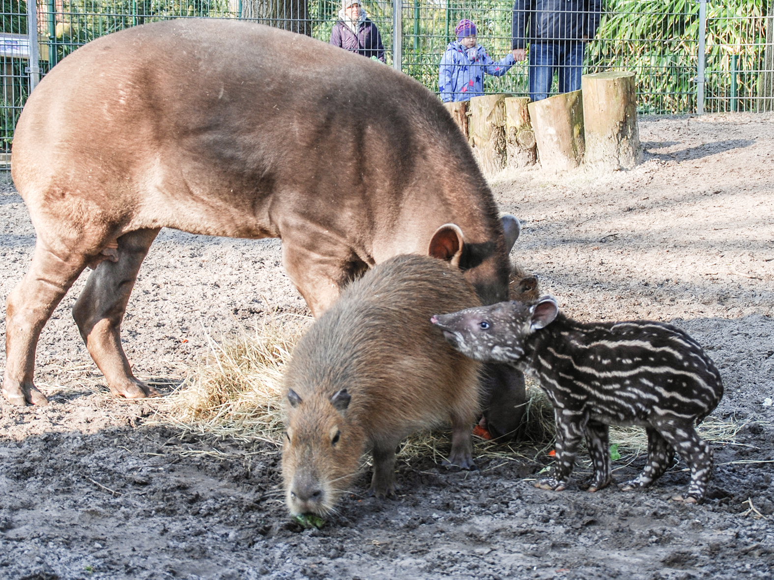 Am 17. Februar gab es bei den Flachlandtapiren im Jaderpark zum wiederholten Male Nachwuchs. Mutter Peggy brachte ein kleines Mädchen zur Welt. Gesund und munter legte es gleich nach der Geburt die ersten Schritte zurück. Die Jungtiere der südamerikanischen Flachlandtapire sind mit ihren hellenStreifen eigentlich gut getarnt. Im Licht- und Schattenspiel des tropischen Urwaldes der Amazonasregion fallen sie so nicht auf, zumal sie sich regungslos ins Dickicht drücken. Andererseits sind sie gleich mit dem ersten Lebenstag in der Lage der Mutter zu folgen, schaffen aber noch keine großen Strecken. Dies nutzen wir auch unter Zoobedingungen. Ist das Wetter trocken und nicht zu kalt, darf das Kleine bereits jetzt der Mutter tagsüber auf die Freianlage folgen. Hier trifft es sowohl auf Vater Ferdinand als auch auf die Wasserschweine, die hier ebenfalls leben. Tapirväter haben in der Natur eigentlich nichts mit der Aufzucht ihrer Kinder zu tun, verhalten sich aber ausgesprochen tolerant und friedlich. Bei schlechterem Wetter können Besucher das Tapirhaus betreten un d die junge Familie im Innenraum besuchen.