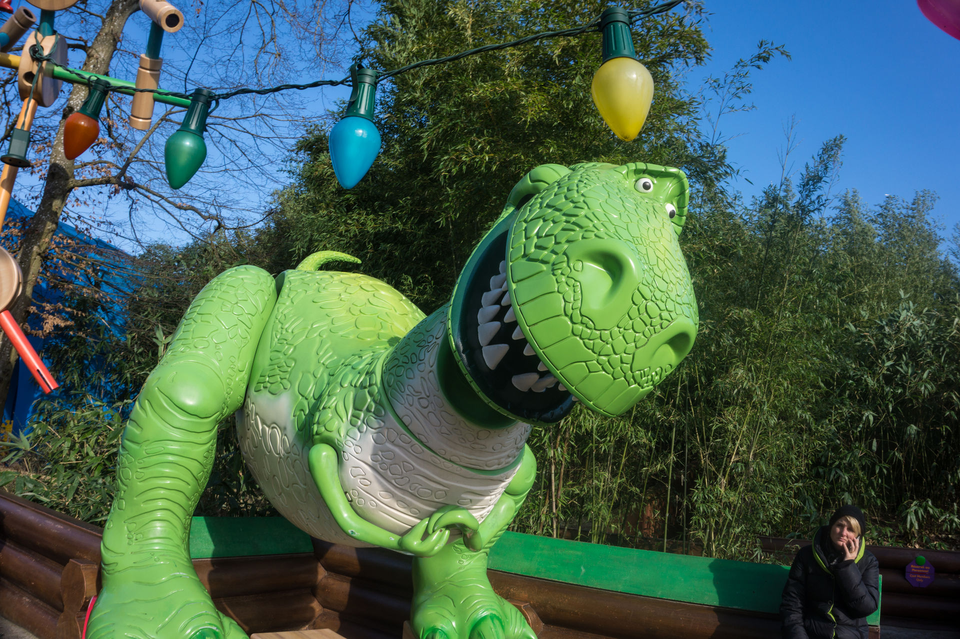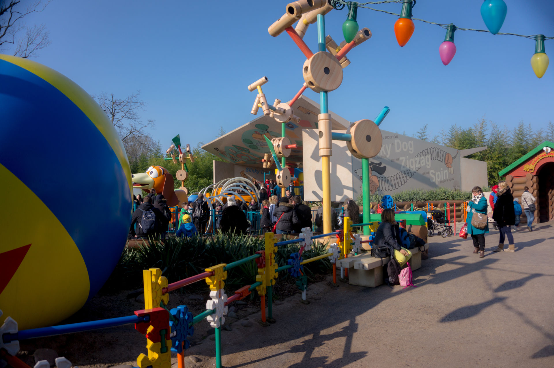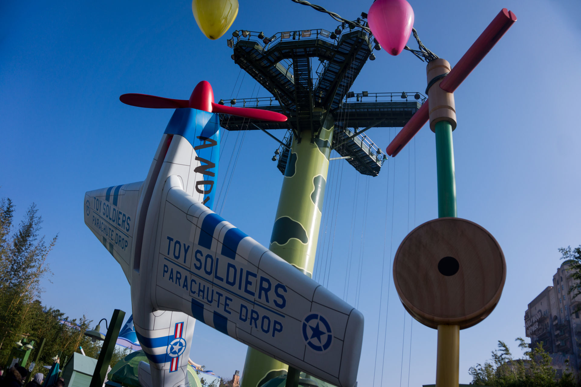 So zum Beispiel das Toy Story Playland mit seinem Musikexpress Slinky Dog Zigzag Spin, welcher ein noch öderes Fahrprogramm bietet als der Flipper VolPaiute aus dem spanischen Freizeitpark Port Aventura, welcher bekanntermaßen seine Runden im Wartungsmodus dreht, dem nicht gerade schönen Parachute Tower Toy Soldiers Parachute Drop, sowie der