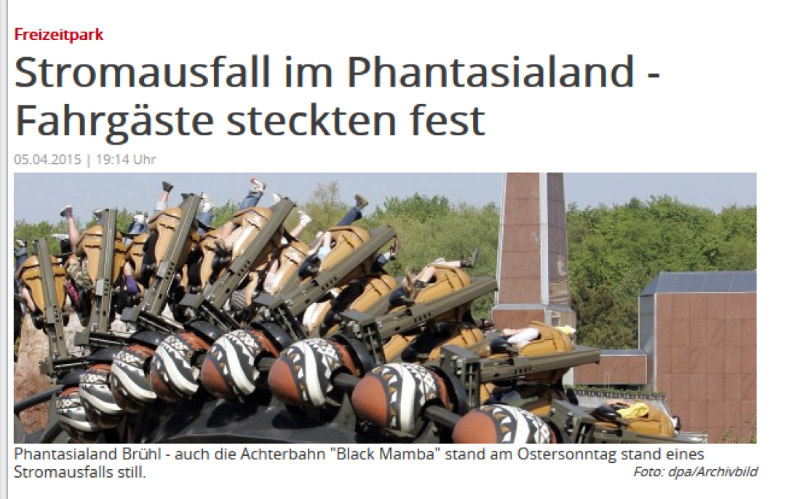 Kölner Stadt Anzeiger Wegen eines technischen Defekts ist in Teilen Brühls der Strom ausgefallen. Betroffen waren auch die Fahrgeschäfte des Phantasialands. Fahrgäste der Black Mamba seien „not amused“, hieß es auf Facebook. Mittlerweile ist der Fehler behoben.