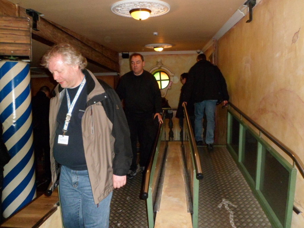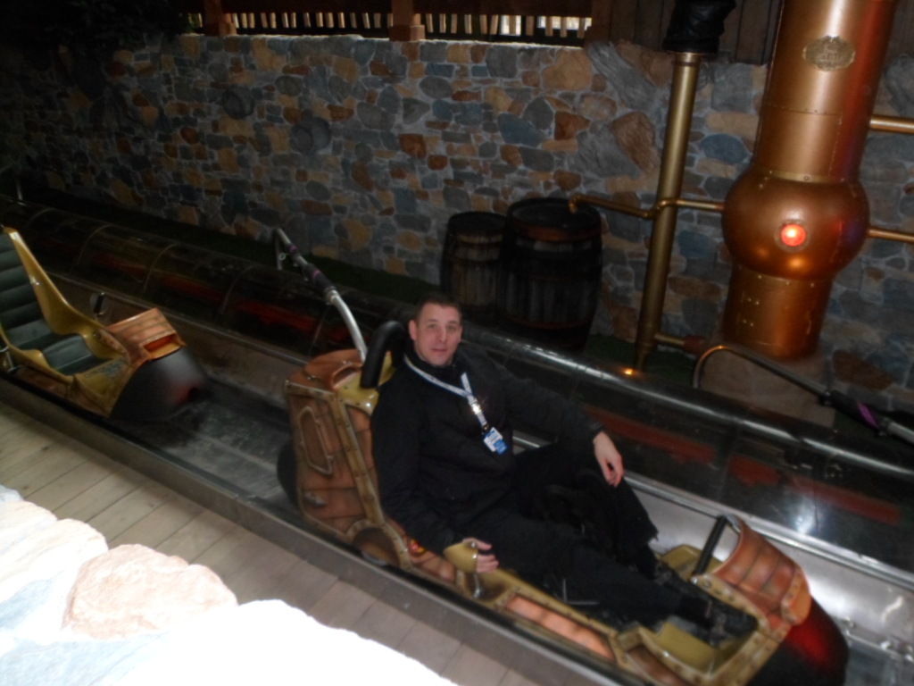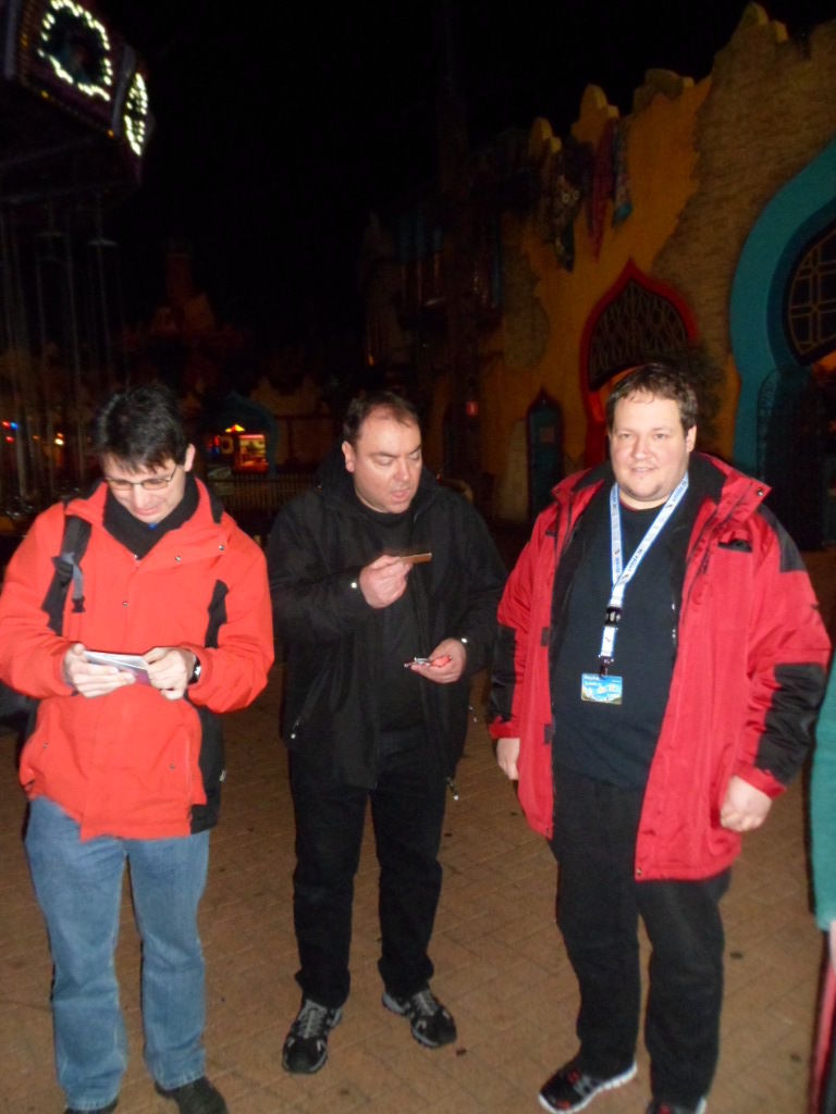 Beim Wirbelwind angekommen las ich von weitem irgendwas mit technischen Schwierigkeiten (jedenfalls habe ich das so verstanden) und verabschiedete mich innerlich vom Count aber fragte trotzdem bei der Mitarbeiterin, deren Job es scheinbar war die Botschaft des Schildes mehrsprachig zu vertonen, wo denn nun das Problem ist. Sie erklärte, dass die Bahn erst bei 7 °C fahren könne und es mit 5°C noch zu kalt war. Also ging es weiter Richtung Boosterbike. Das fuhr auch aber schnell fiel auf, dass jeder auf dem Zug ein schnörkeliges „T“ auf dem Rücken hatte. Das nenne ich mal eine Teambuilding-Maßnahme. Wir beobachteten wie der Zug schleppend aber erfolgreich über die Bunnyhops fuhr und konnten kurz darauf selbst auf den Motorrädchen Platz nehmen. Die Bahn macht immer noch viel Spaß aber so langsam war ich etwas verfroren und wünschte mir wieder rein zu können. Zum Glück wurde mein Plan reingehen-17-Getränke holen-weitersehen abgenickt. So genau weiß ich garnicht mehr wie es dann weiterging. Irgendwann im Laufe des Tages fand ich mich mit NOS und Sonic im Teetassenkarussel wieder und wurde durch meine Nackenmuskulatur daran erinnert, dass die Rücken- und Nackengymnastik in der Vorwoche ausfallen musste. Außer Sonic und NOS konnte ich auch nichts mehr von meiner Umgebung erkennen, war inzwischen total orientierungslos, hörte mich aber laut lachen also musste ja irgendwie doch alles in Ordnung sein. Eine Wiederholungsfahrt wollte ich aber nicht und lehnte auch den Rest des Tages diverse drehwurmfördernde Mitfahrgelegenheiten ab. Während Ahriman und Sonic auf dem Karussel den Drehteller der Gondel beackerten, saß ich ruhig auf einem der Pferdchen und schaute belustigt zu.