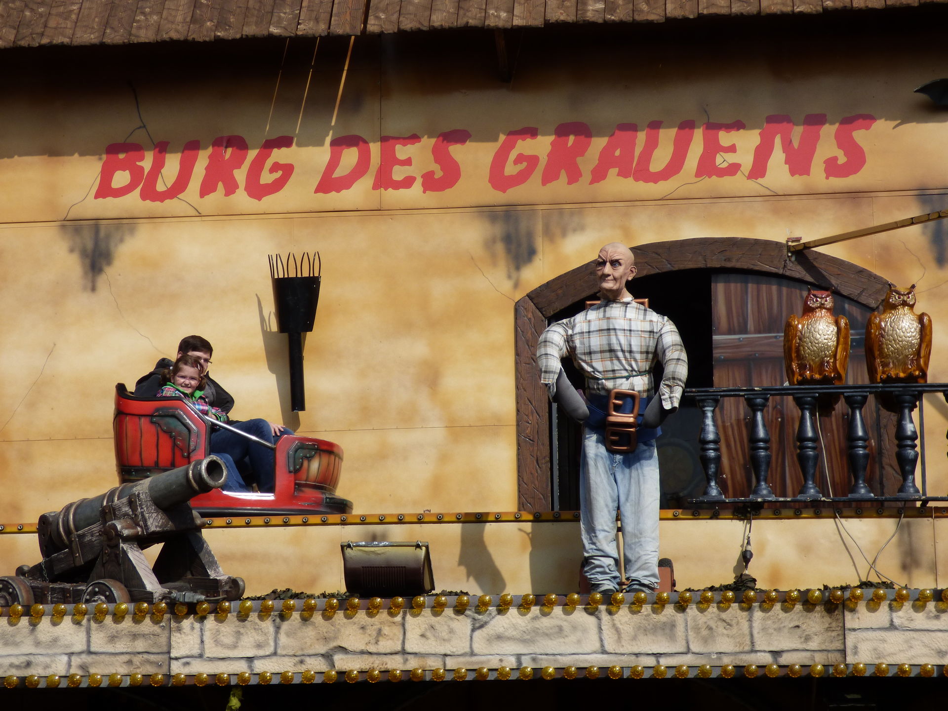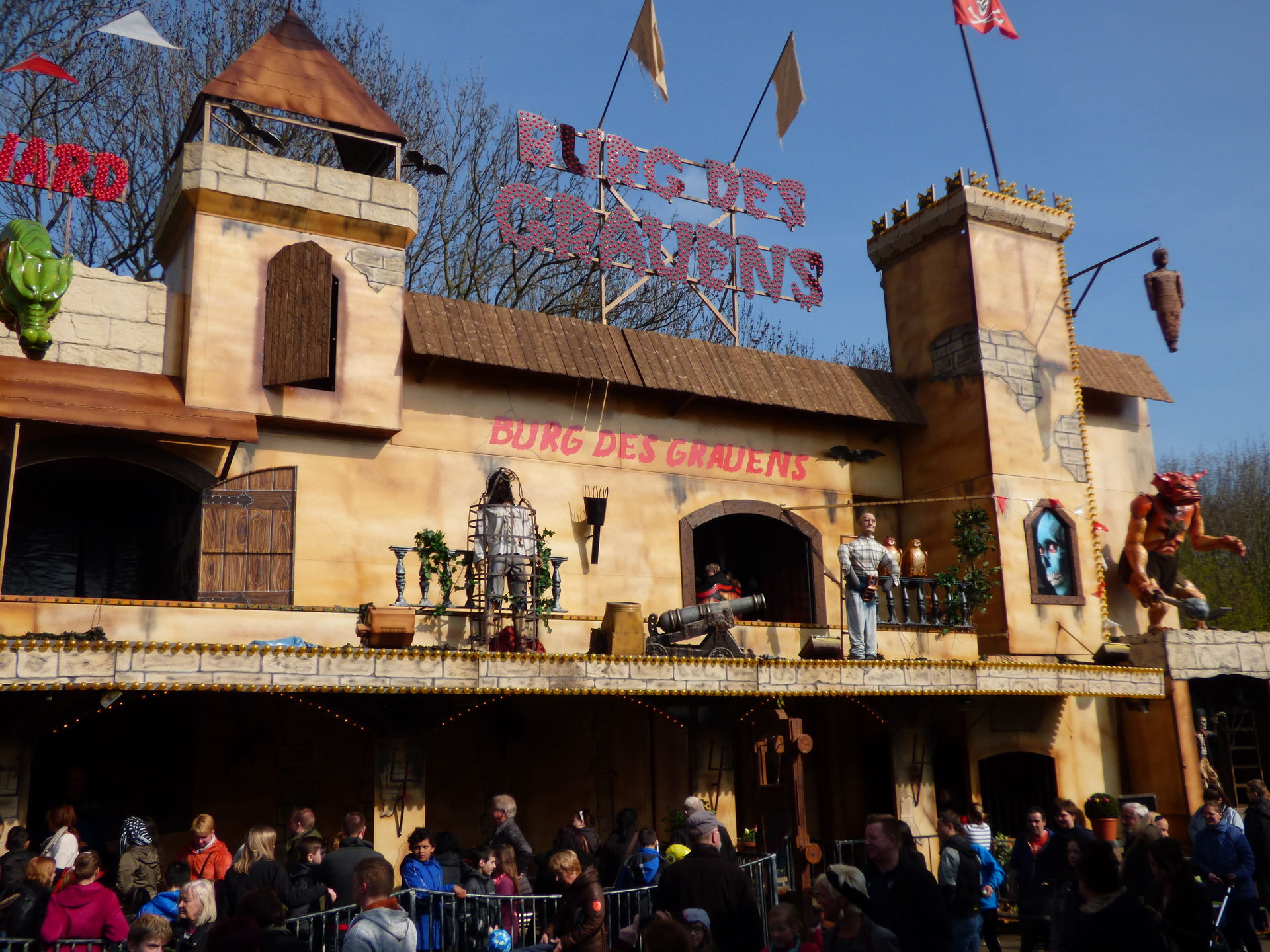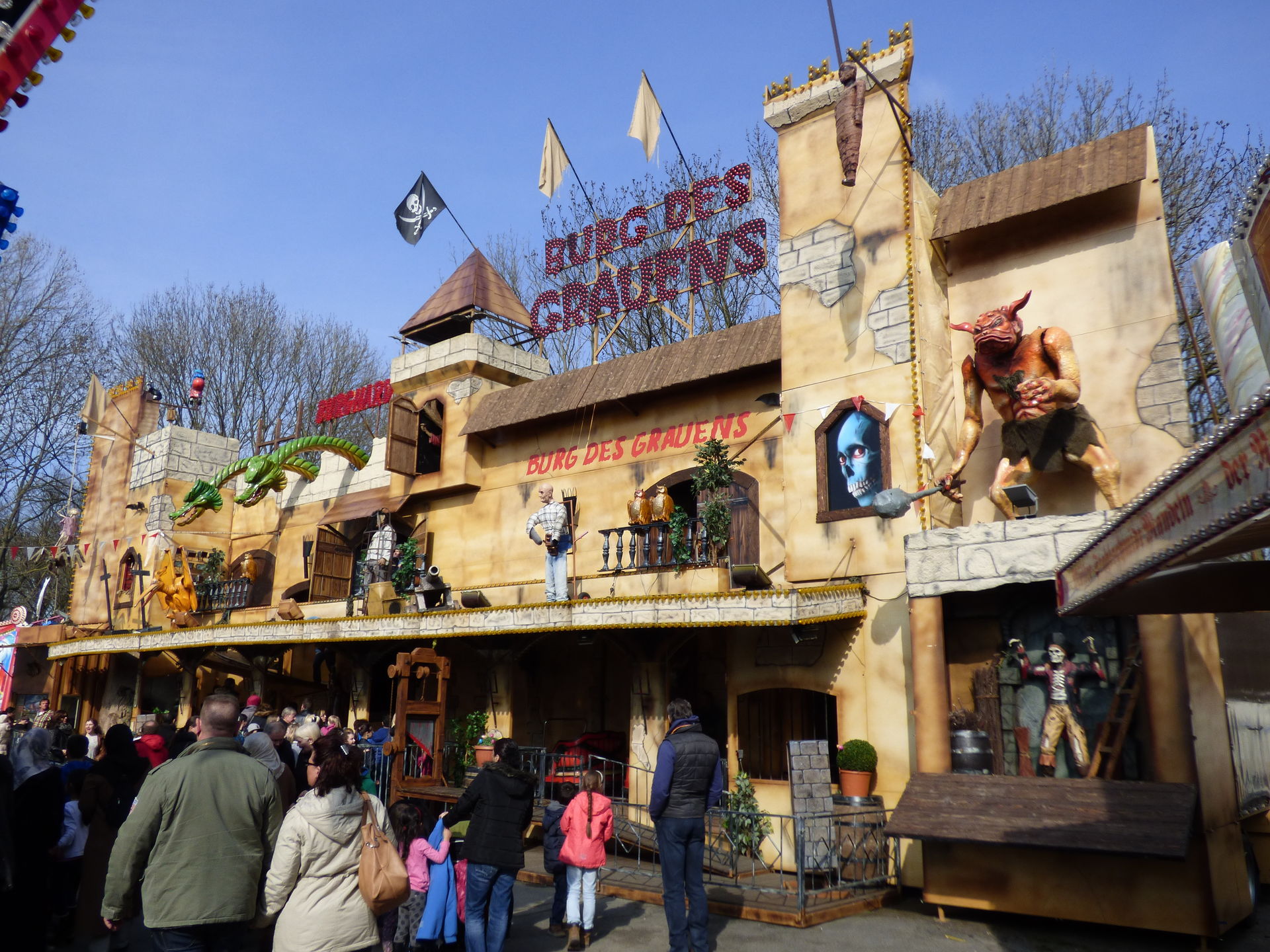 Burg des Grauens auf dem Platz. Außen relativ schlicht gehalten aber dennoch irgendwie einladend wenn man davor steht. Im Inneren erwartet den Besucher solide Gruselunterhaltung in einer kompakten, kleinen Geisterbahn inklusive Live Erschrecker. Kann man sich definitiv mal ansehen.