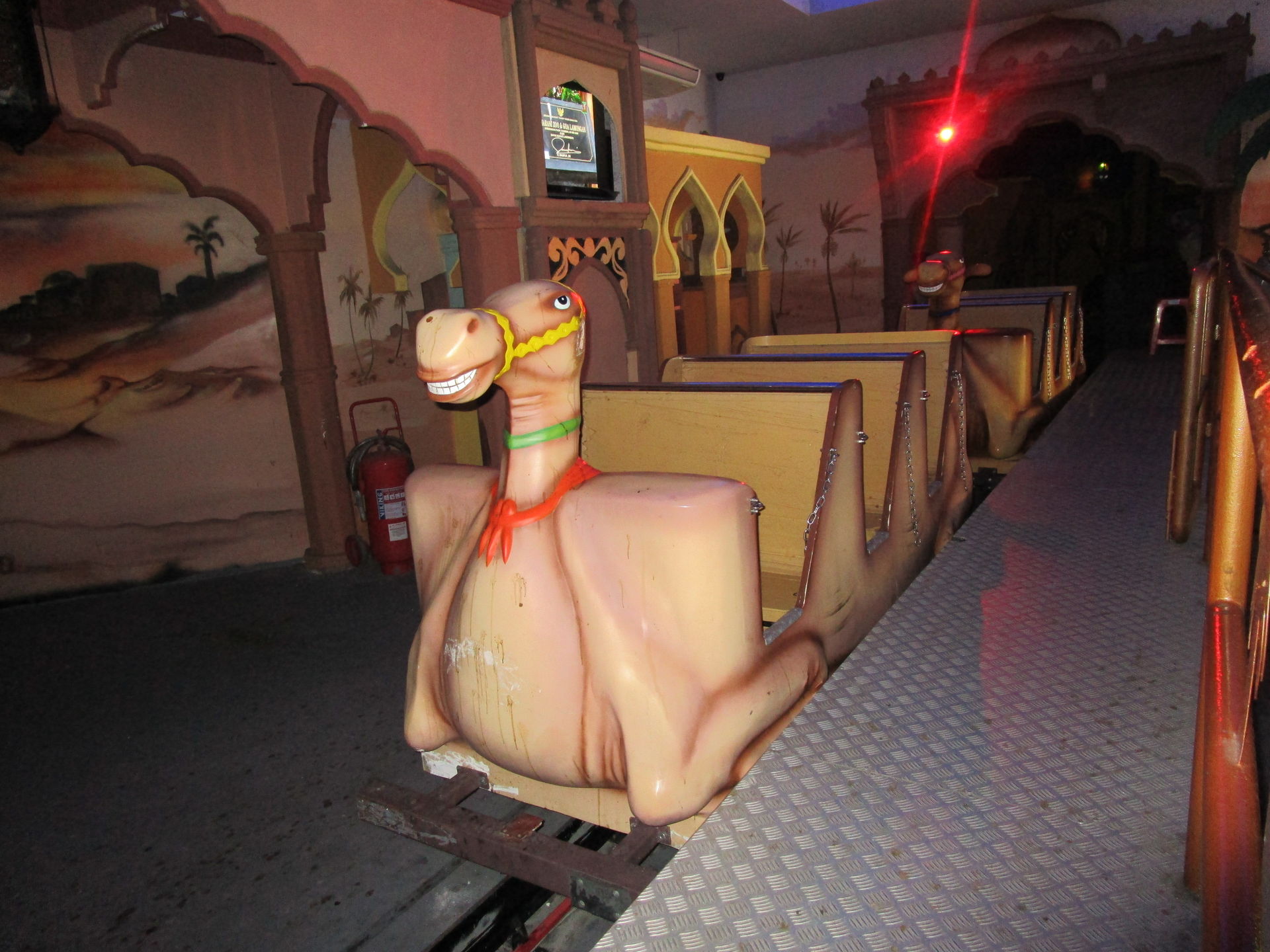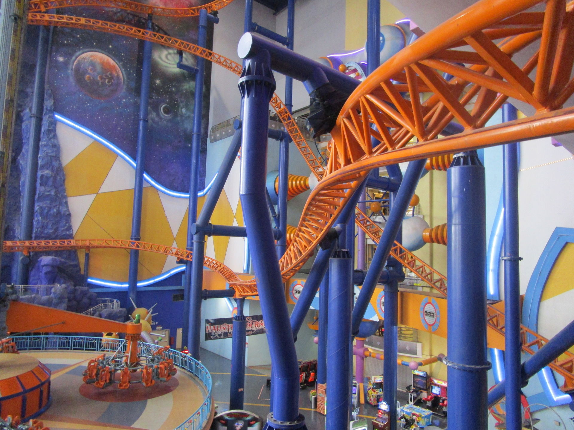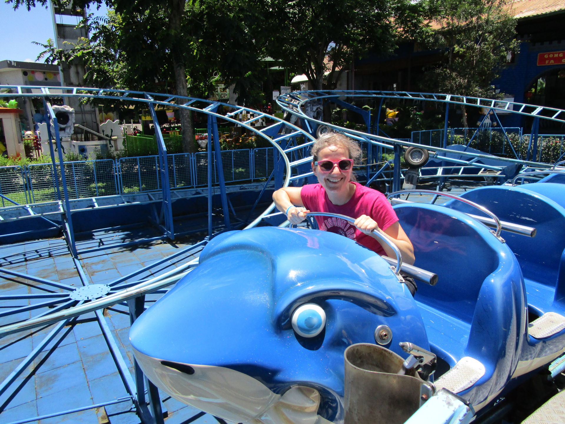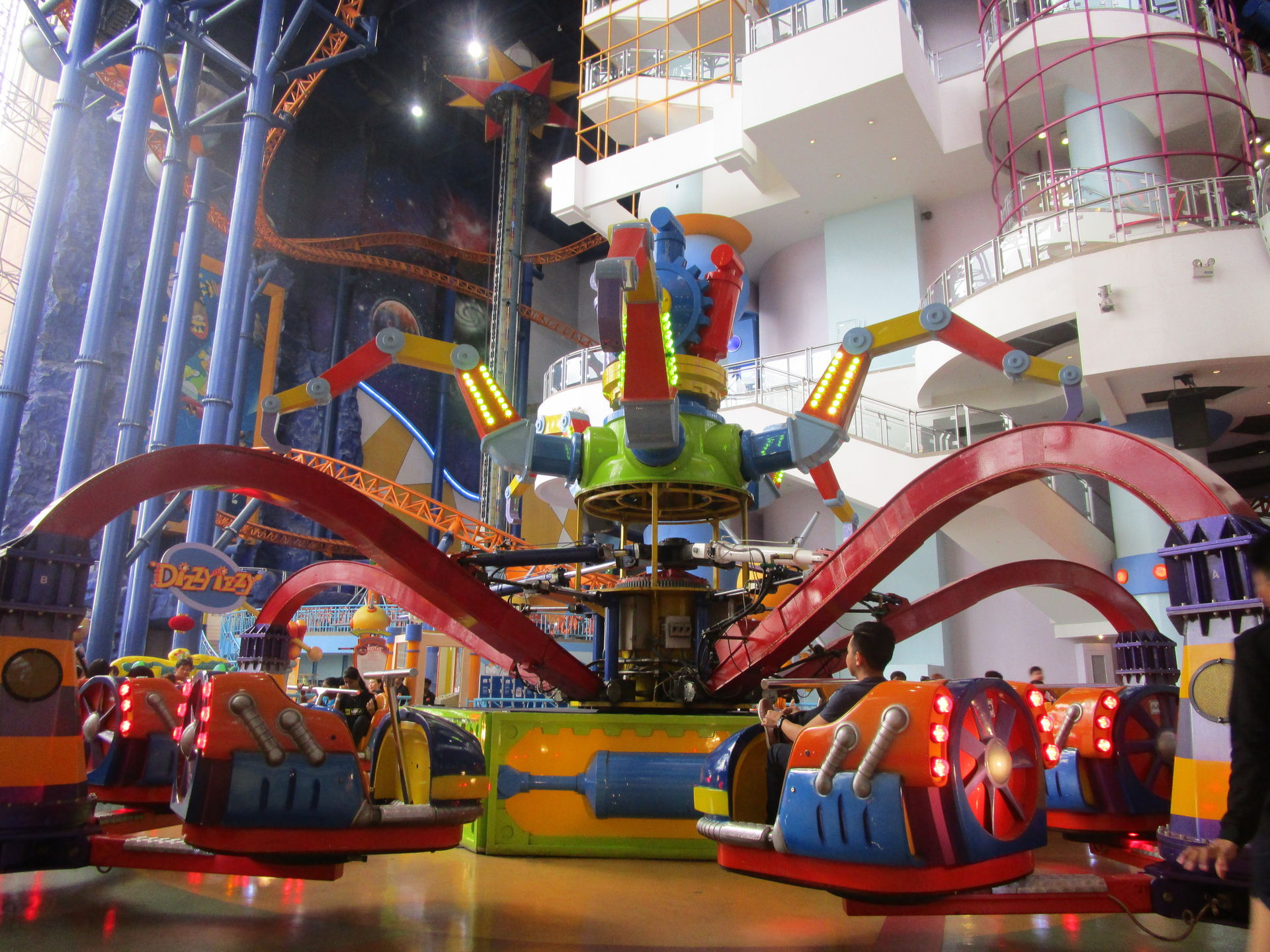 Dreimal nachfragen später finden wir uns in der Einkaufszentrumsspielzone mit allerlei elektrisch betriebenen Unterhaltungsapparaten für den Nachwuchs wieder und entdecken eine sehr skurrile, an einen Mack Spinning Coaster erinnernde Ausgabe einer solchen Drehbahn mit unfassbar langer Fahrdauer, die aber richtig viel Gaudi macht, was nicht zuletzt an der engen Mallarchitektur liegt, die man während der Fahrt mit den Händen ertasten könnte, wenn man wollte.