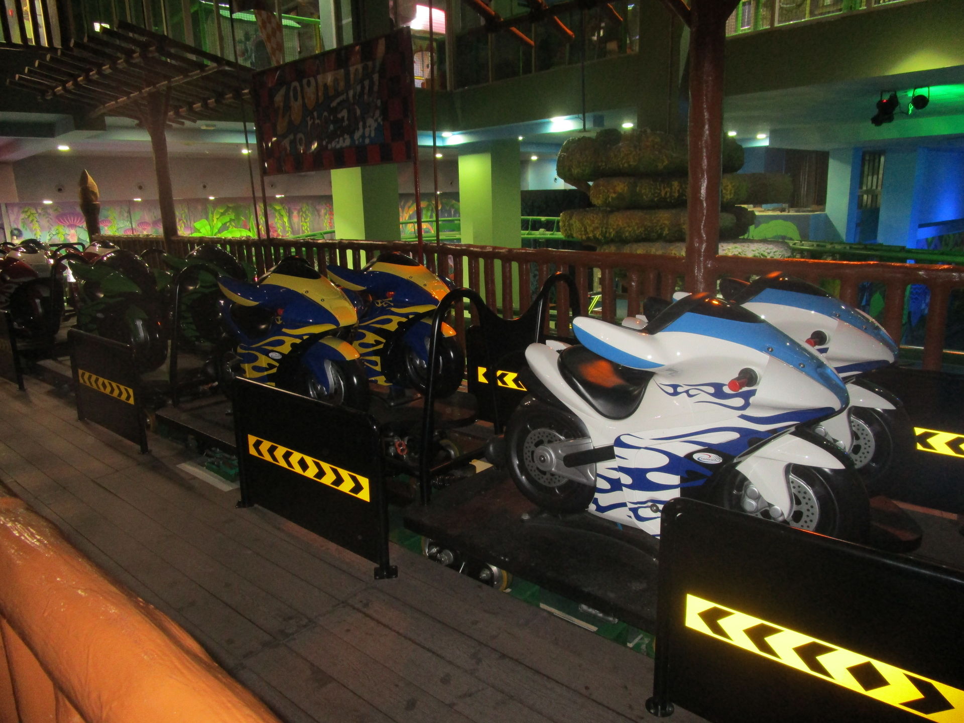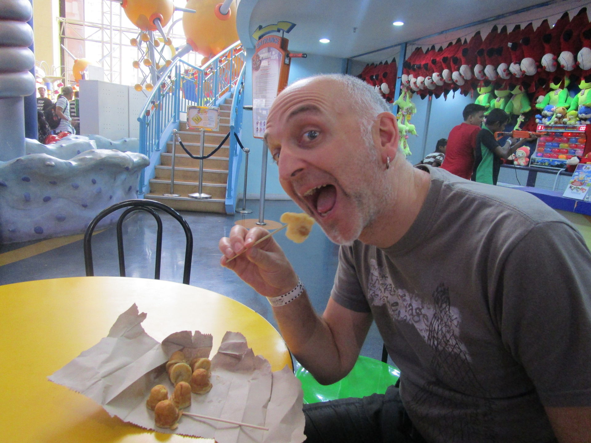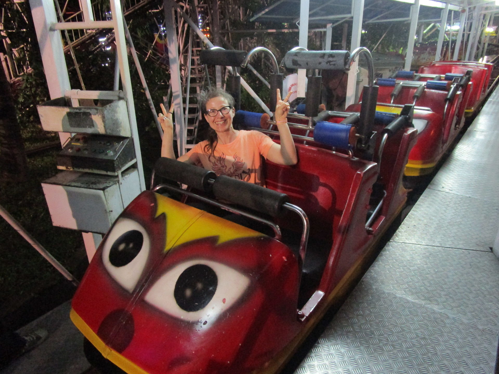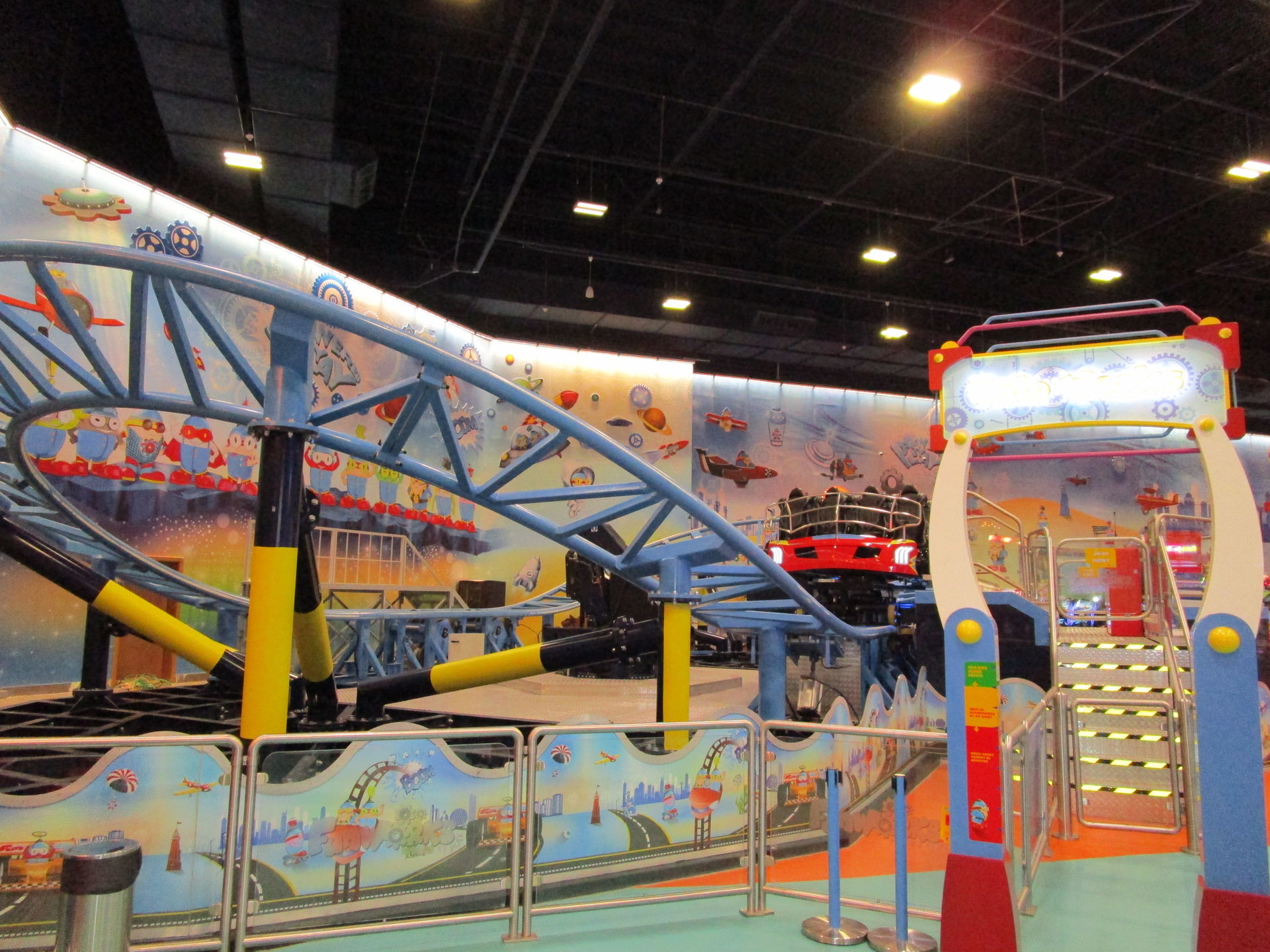 Dreimal nachfragen später finden wir uns in der Einkaufszentrumsspielzone mit allerlei elektrisch betriebenen Unterhaltungsapparaten für den Nachwuchs wieder und entdecken eine sehr skurrile, an einen Mack Spinning Coaster erinnernde Ausgabe einer solchen Drehbahn mit unfassbar langer Fahrdauer, die aber richtig viel Gaudi macht, was nicht zuletzt an der engen Mallarchitektur liegt, die man während der Fahrt mit den Händen ertasten könnte, wenn man wollte.